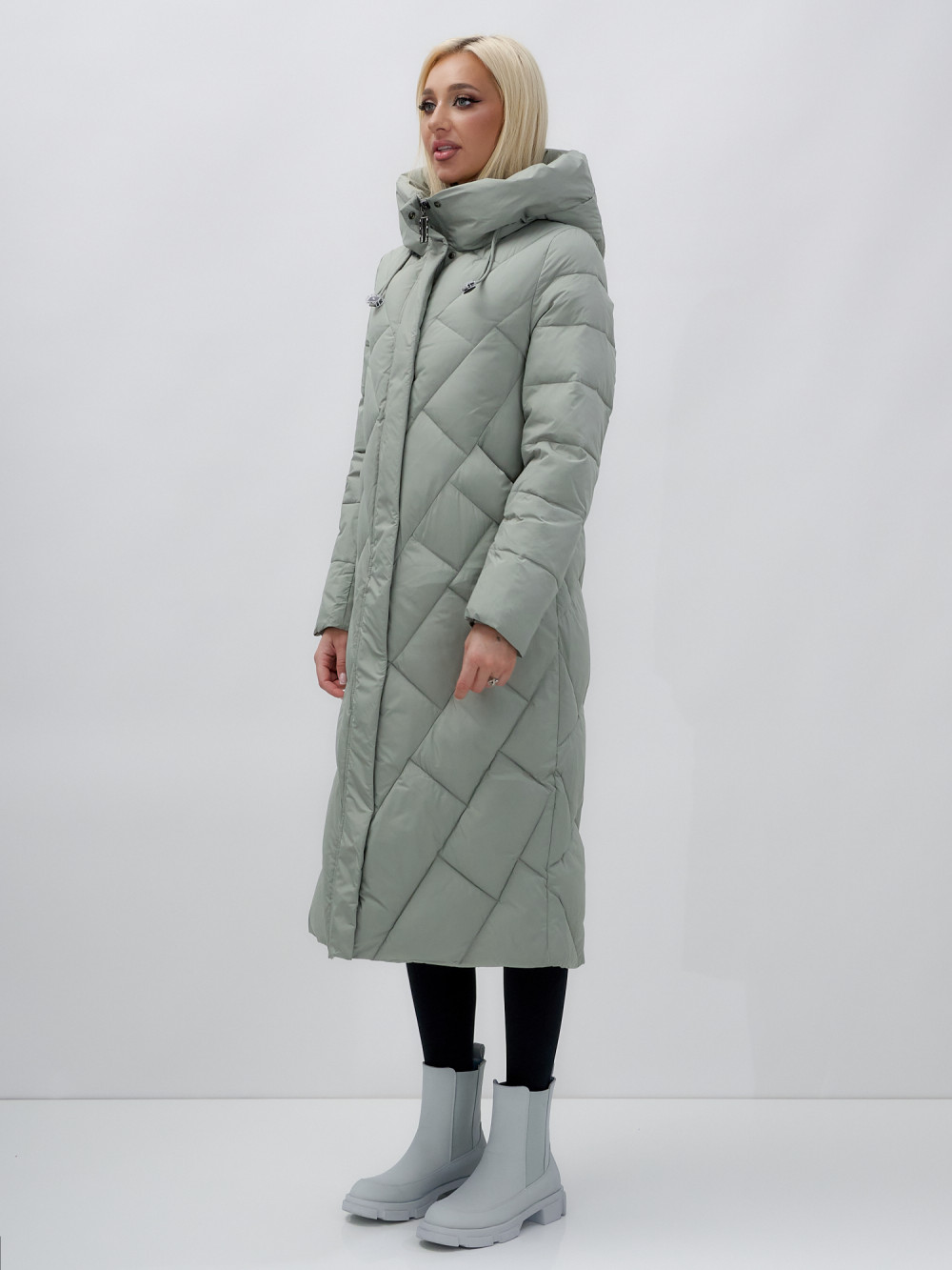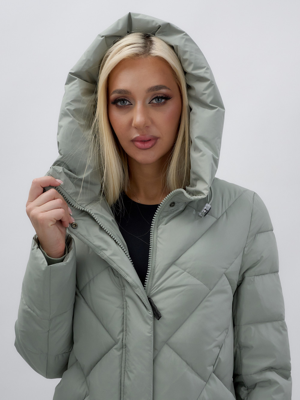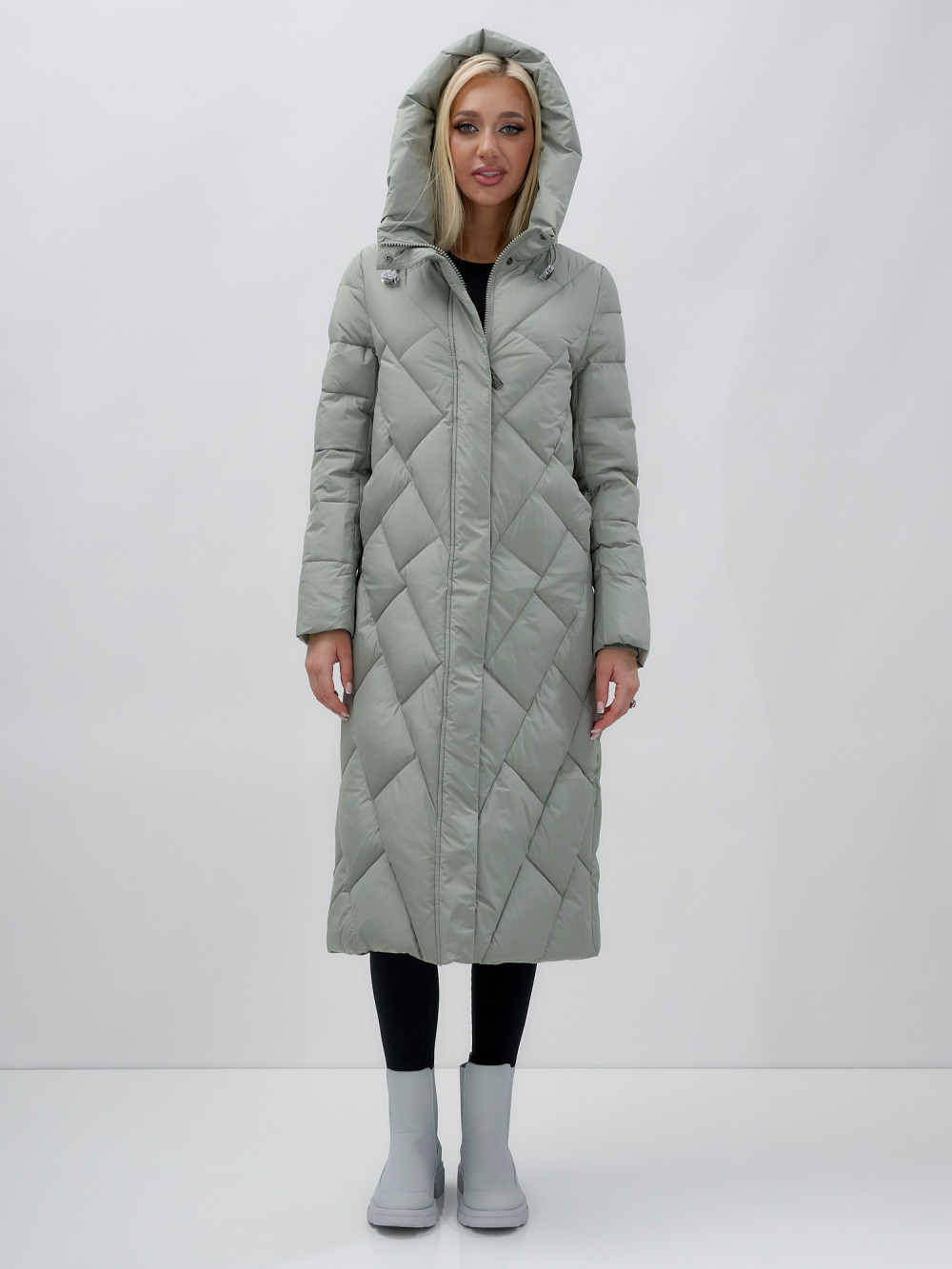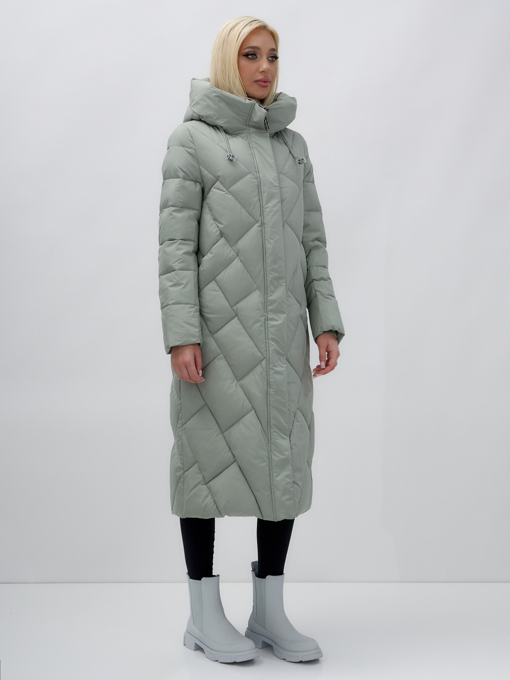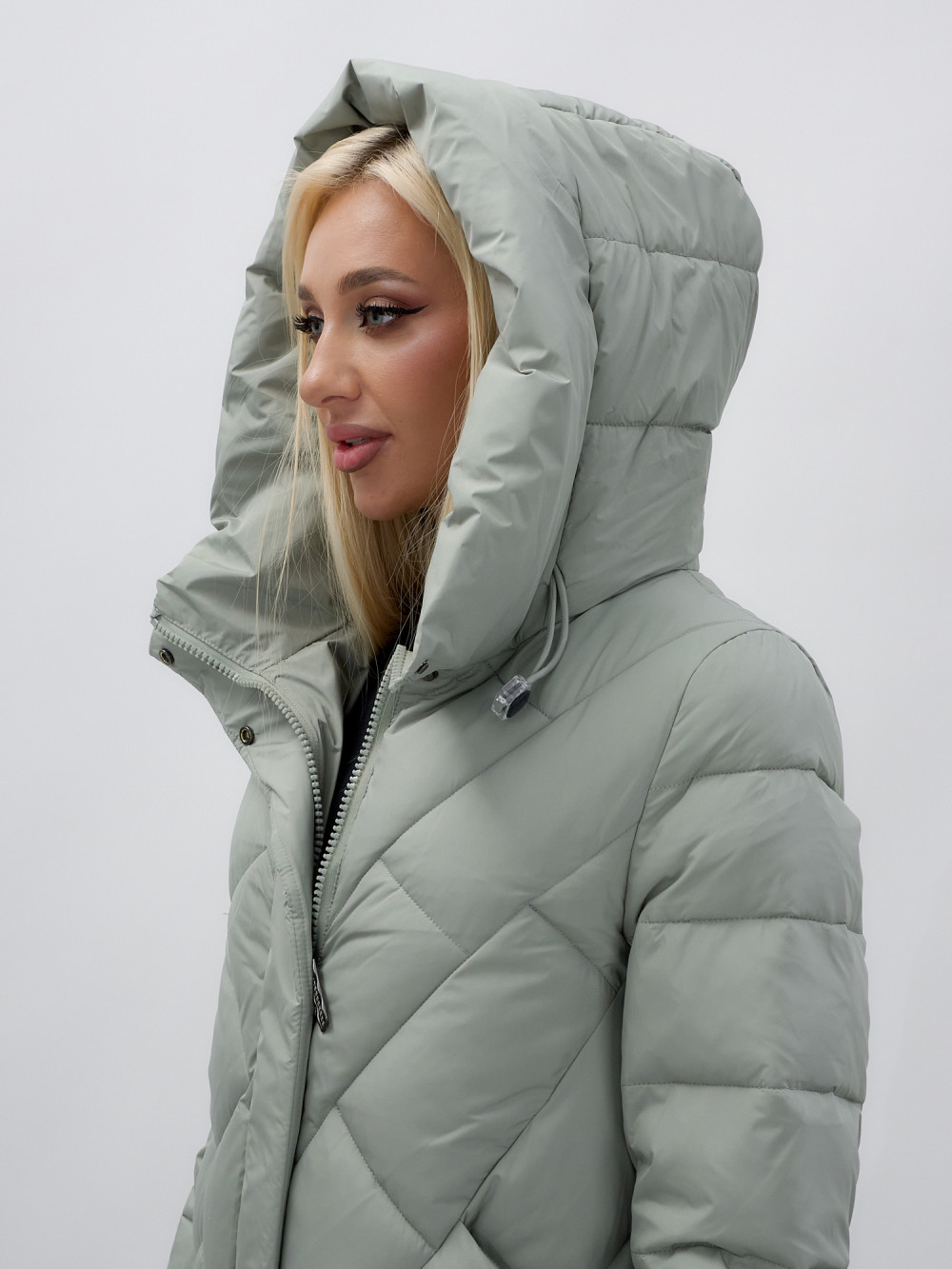 Пальто утепленное стеганное зимнее с капюшоном женское зеленого цвета 9612Z — MTFORCE