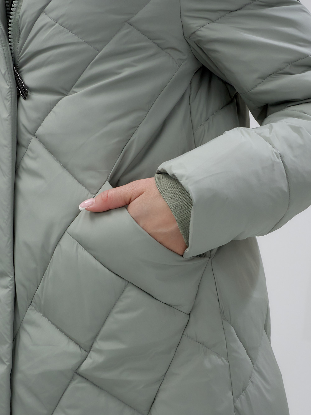 Пальто утепленное стеганное зимнее с капюшоном женское зеленого цвета 9612Z