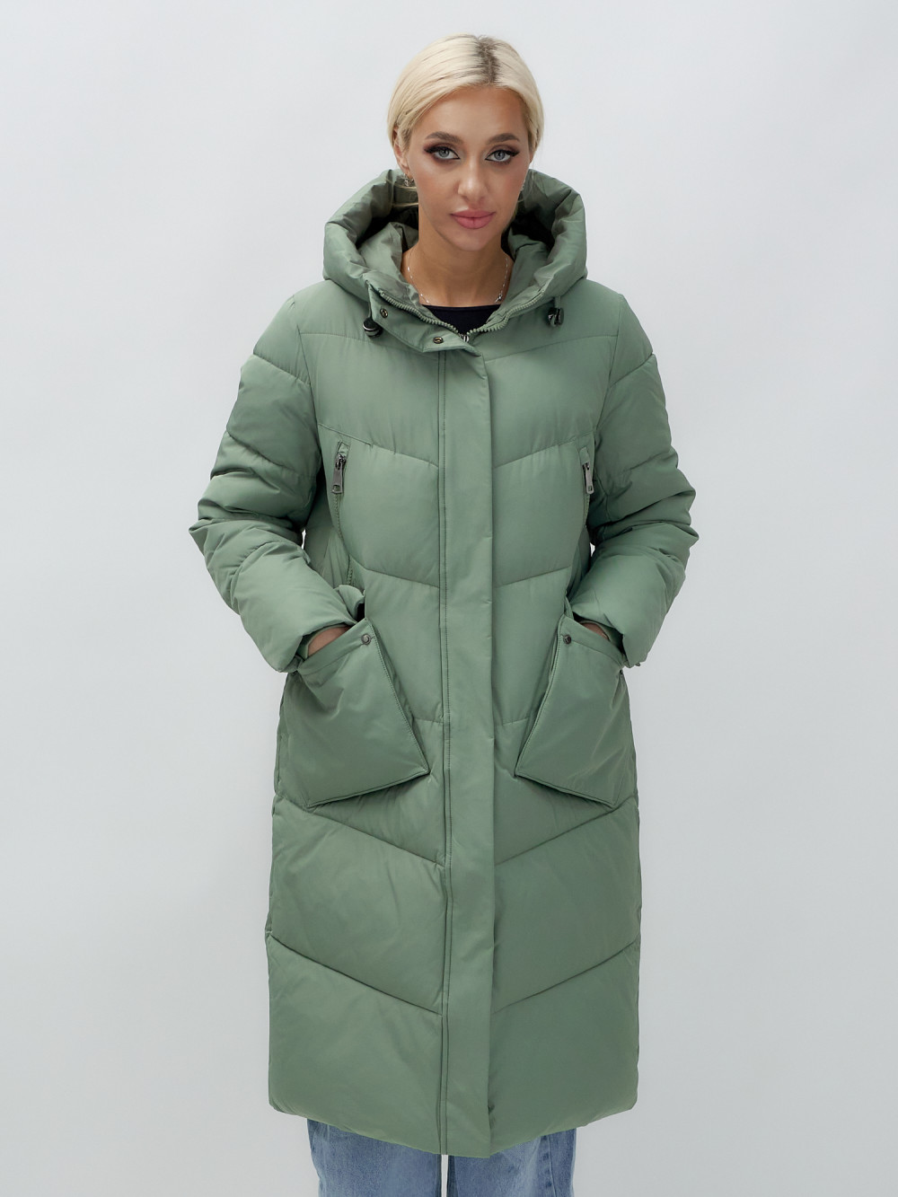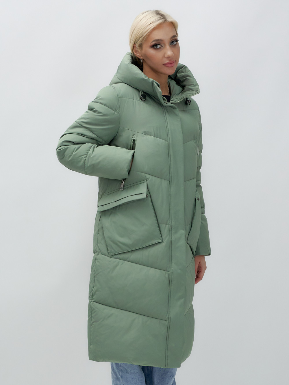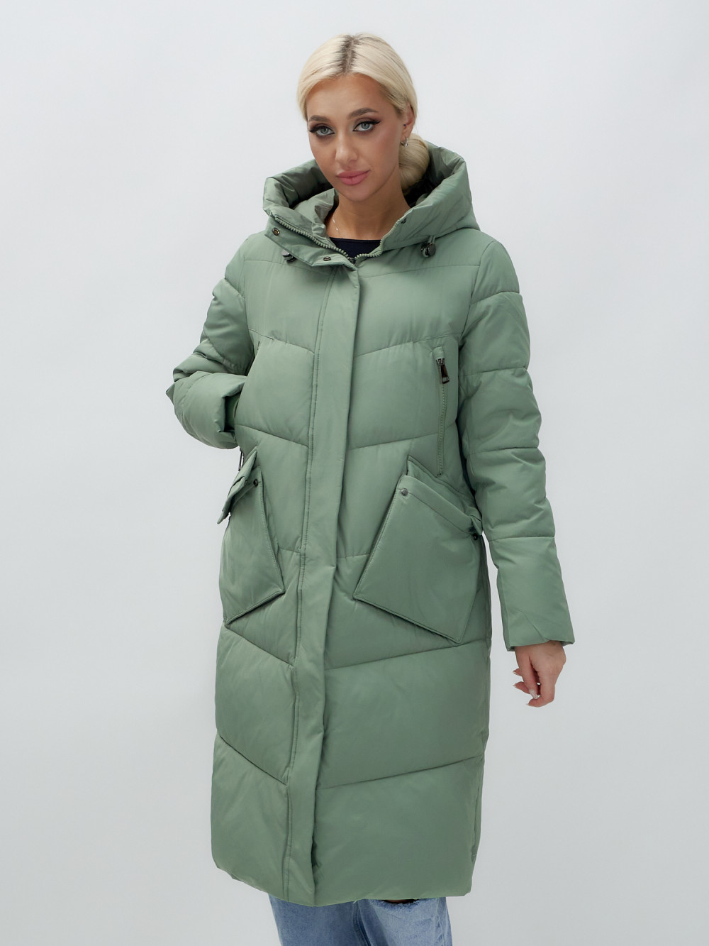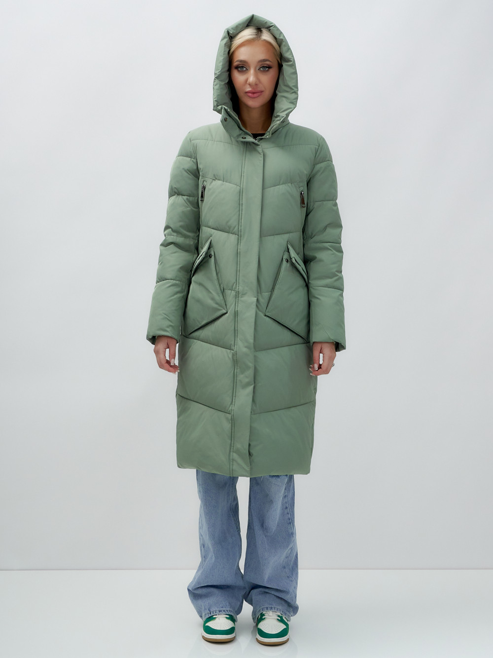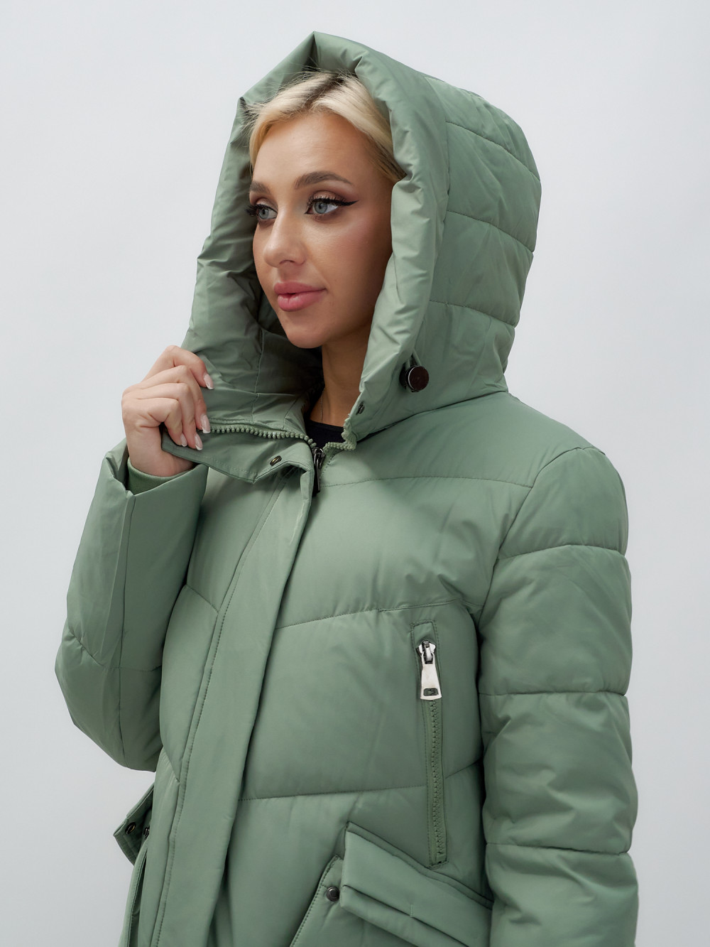 Пальто утепленное стеганное зимнее с капюшоном женское зеленого цвета 9639Z — MTFORCE