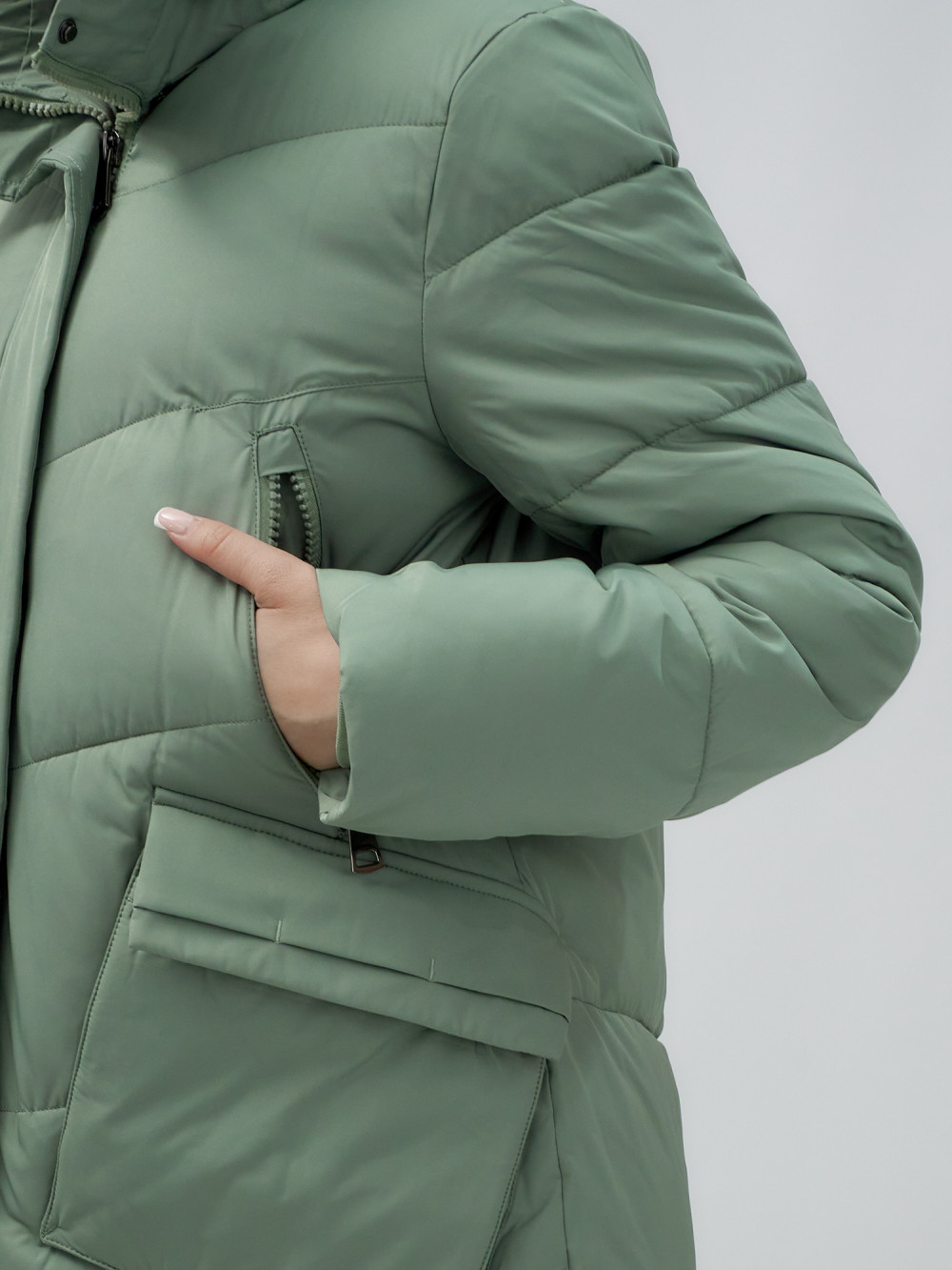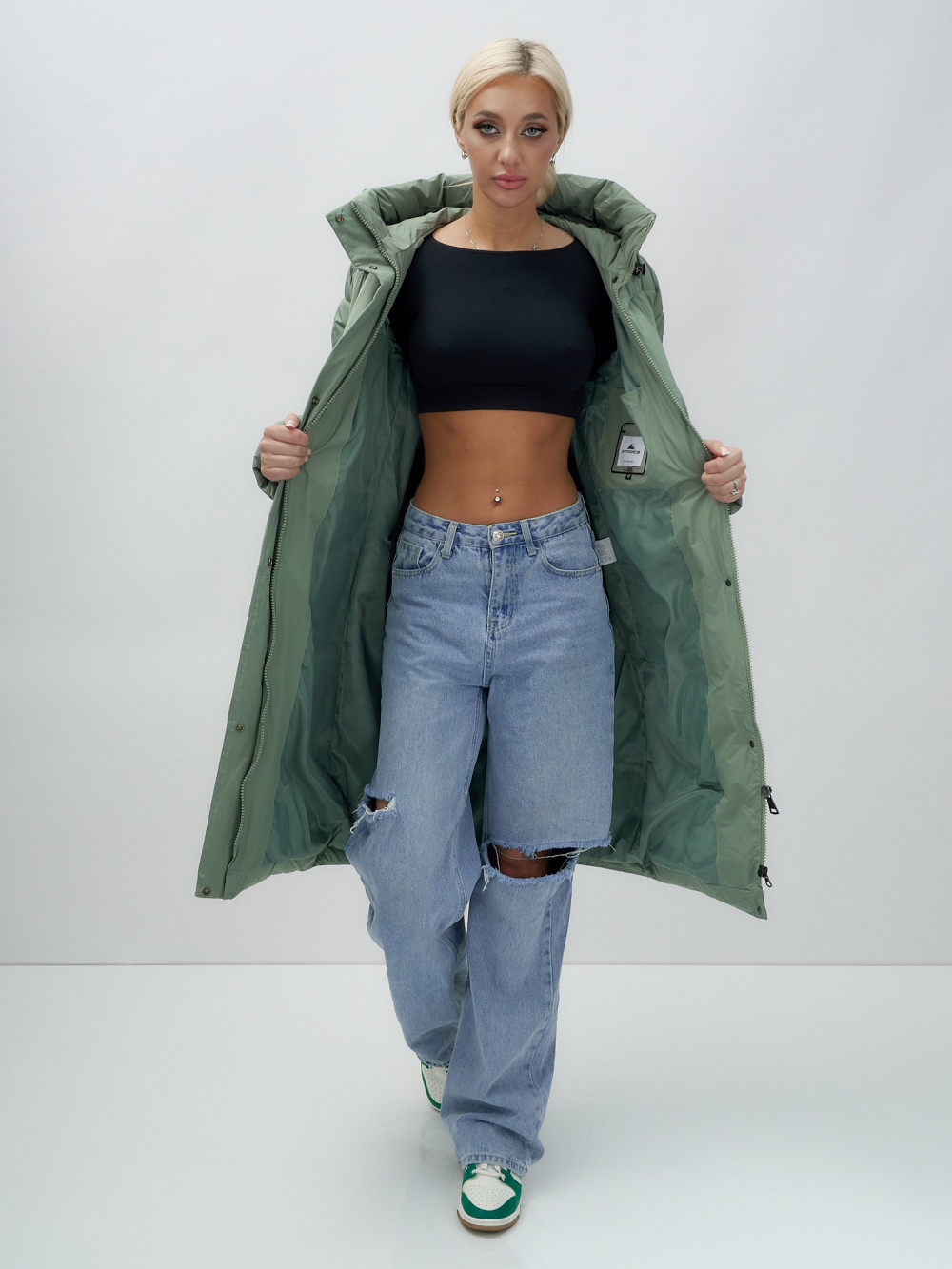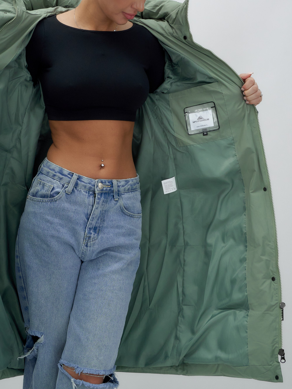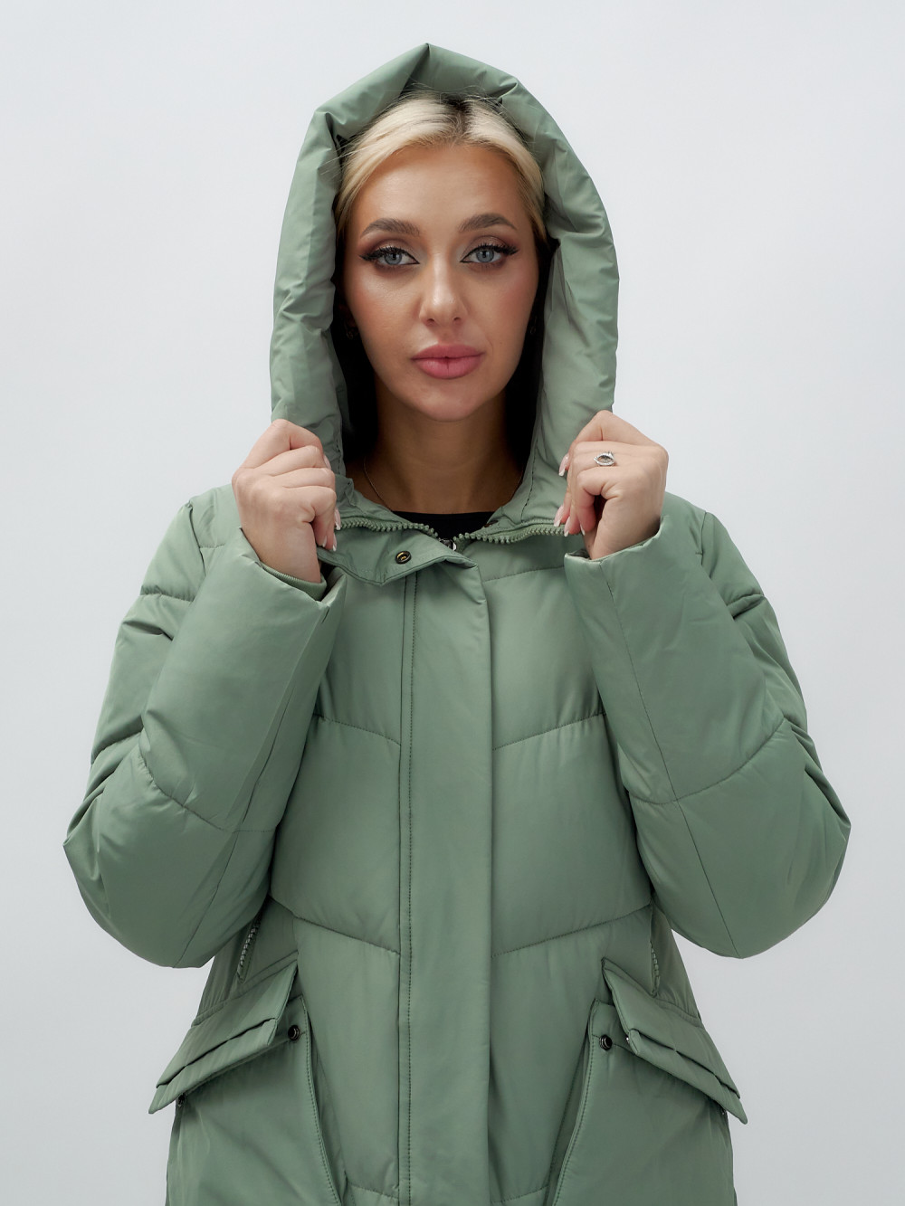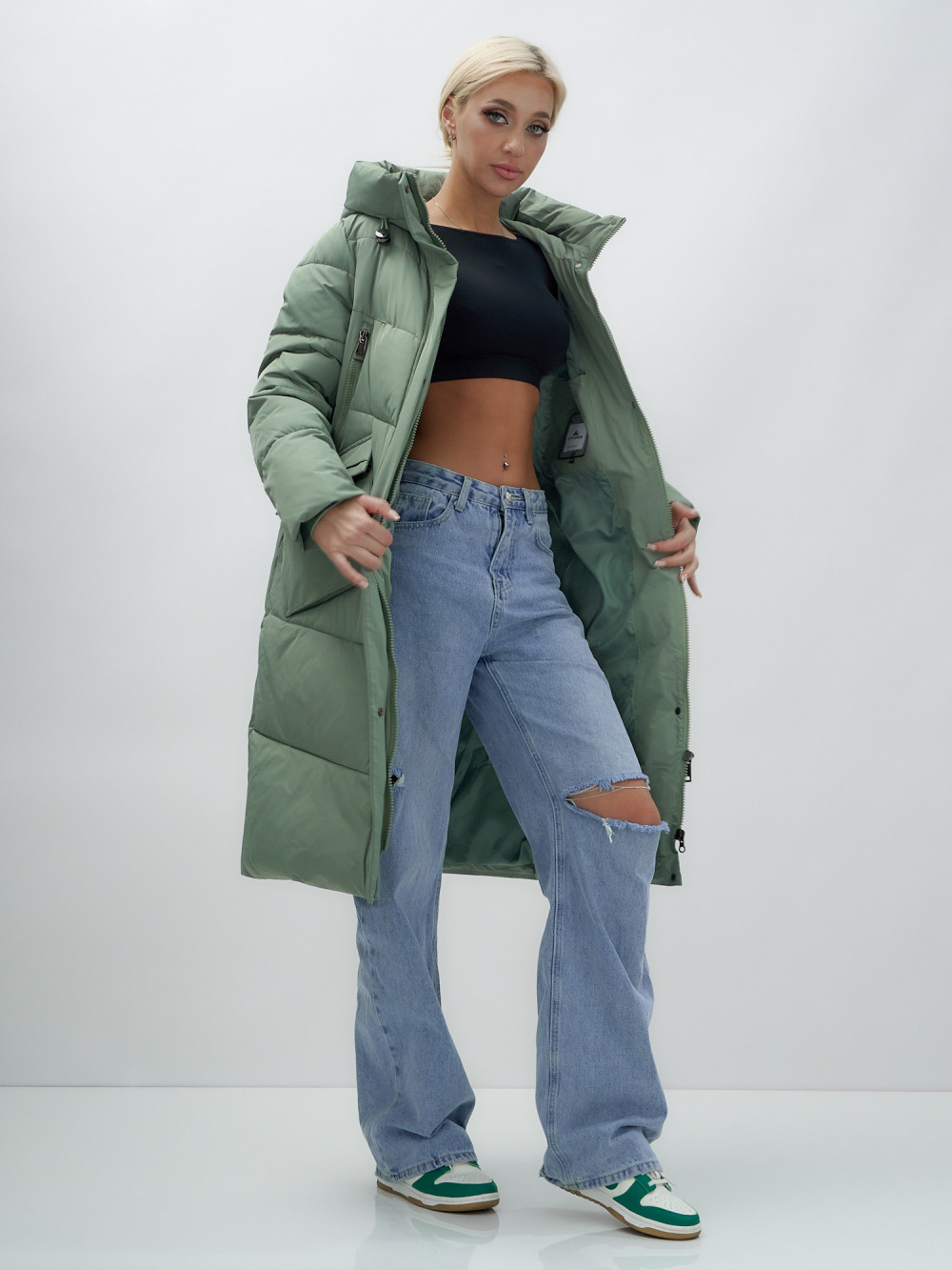 Пальто утепленное стеганное зимнее с капюшоном женское зеленого цвета 9639Z — MTFORCE
