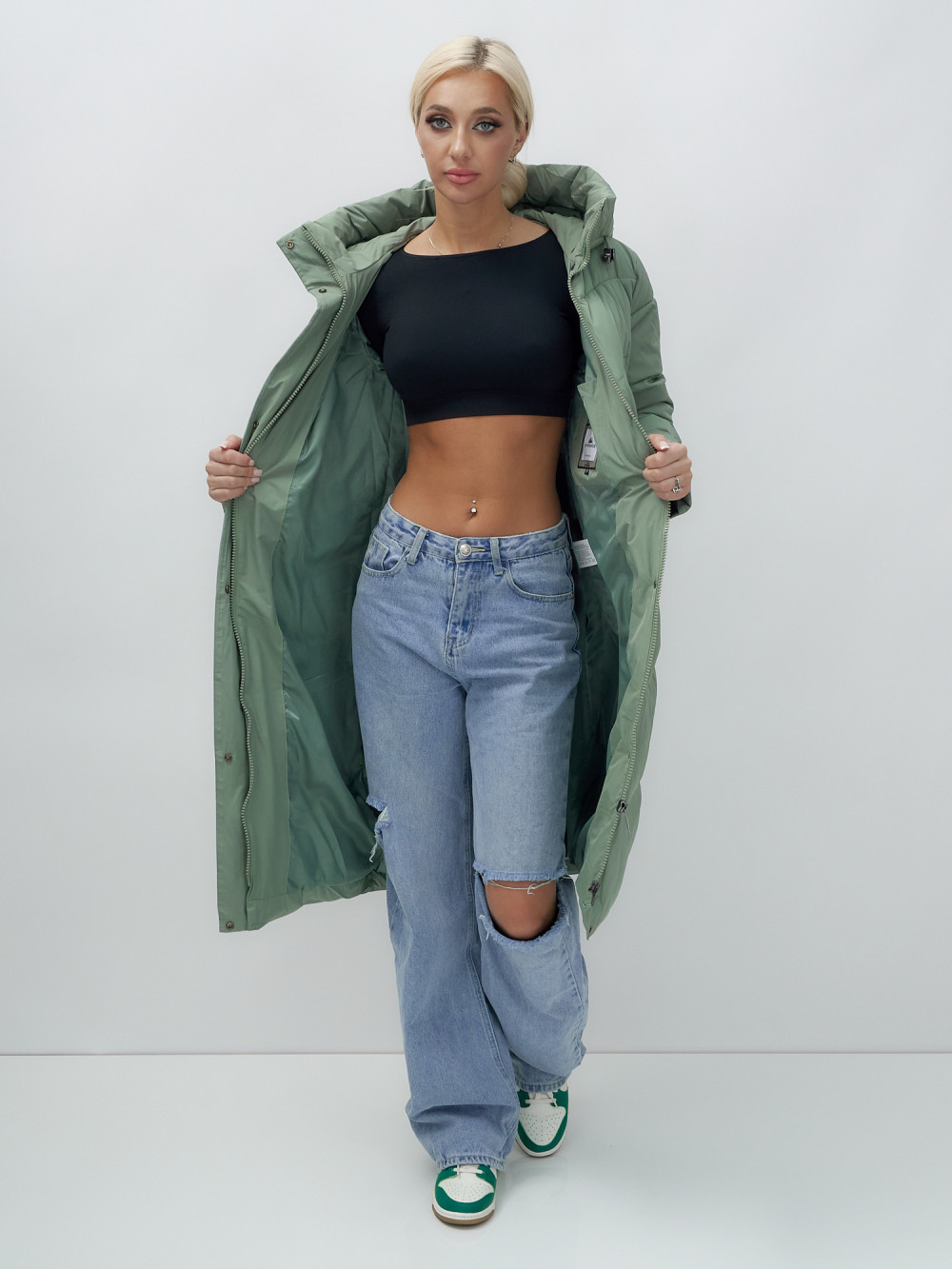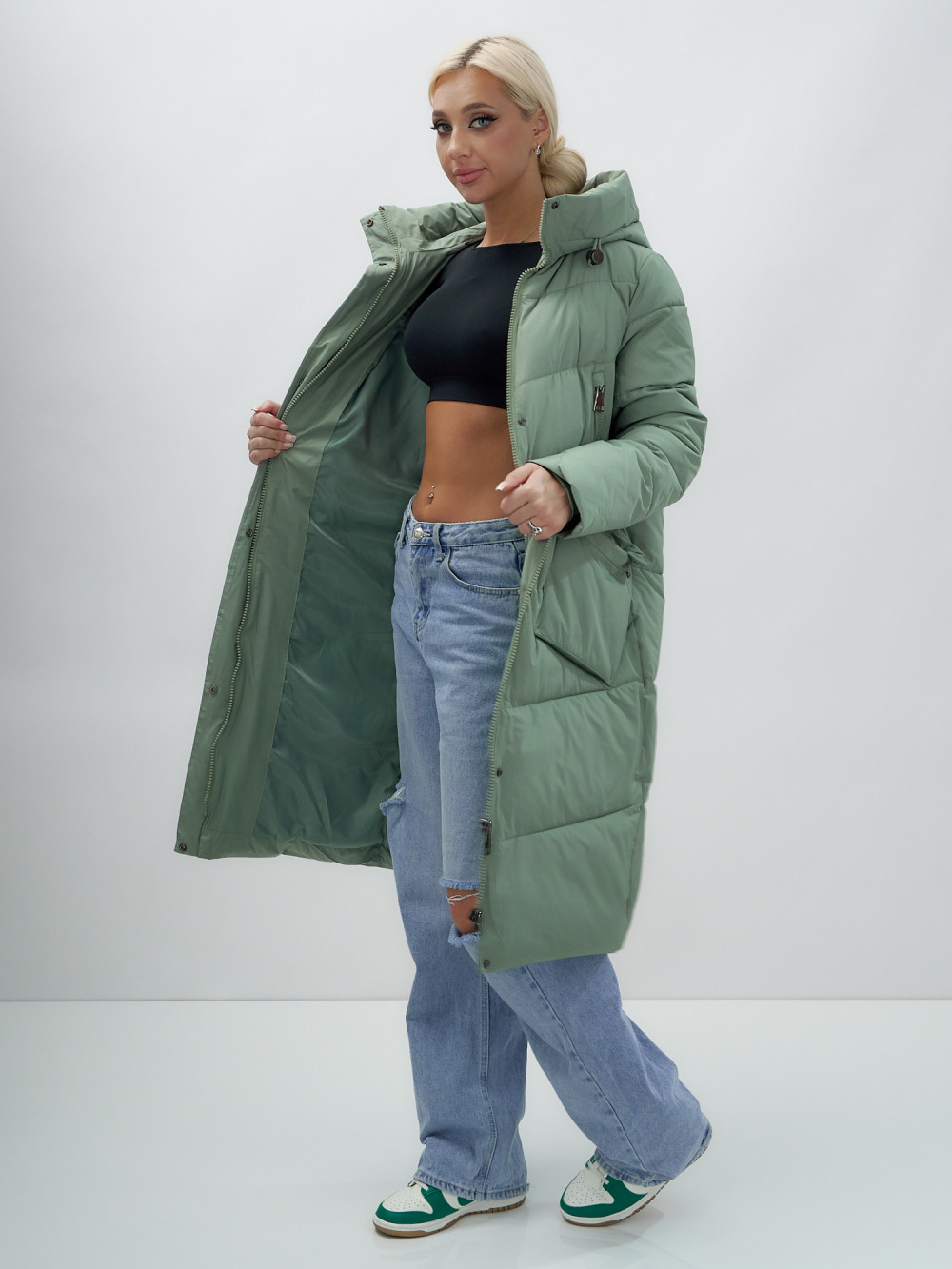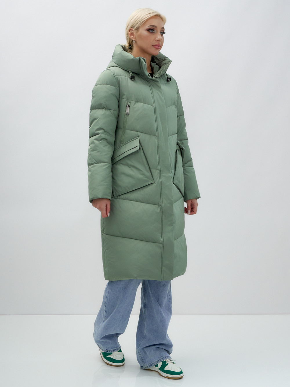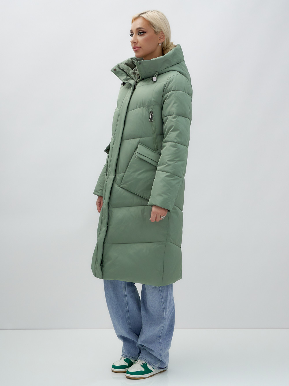 Пальто утепленное стеганное зимнее с капюшоном женское зеленого цвета 9639Z