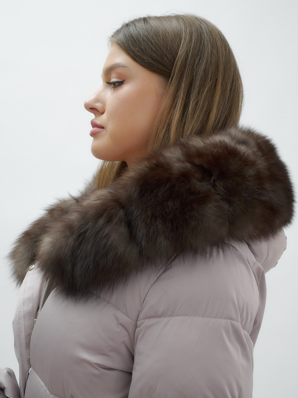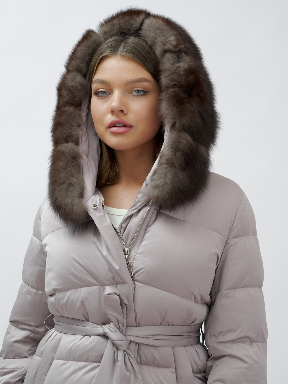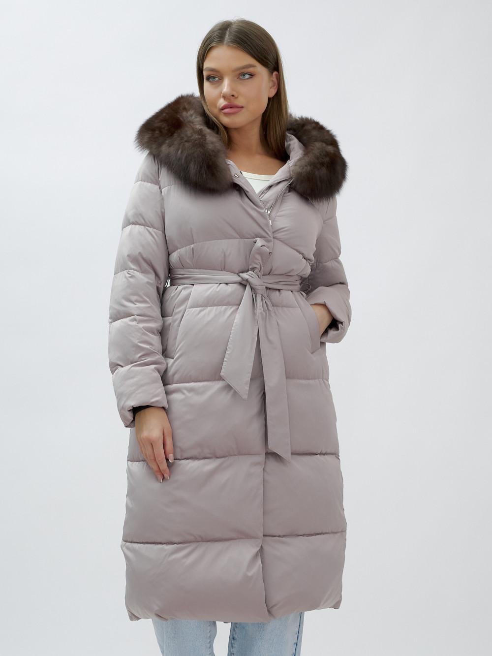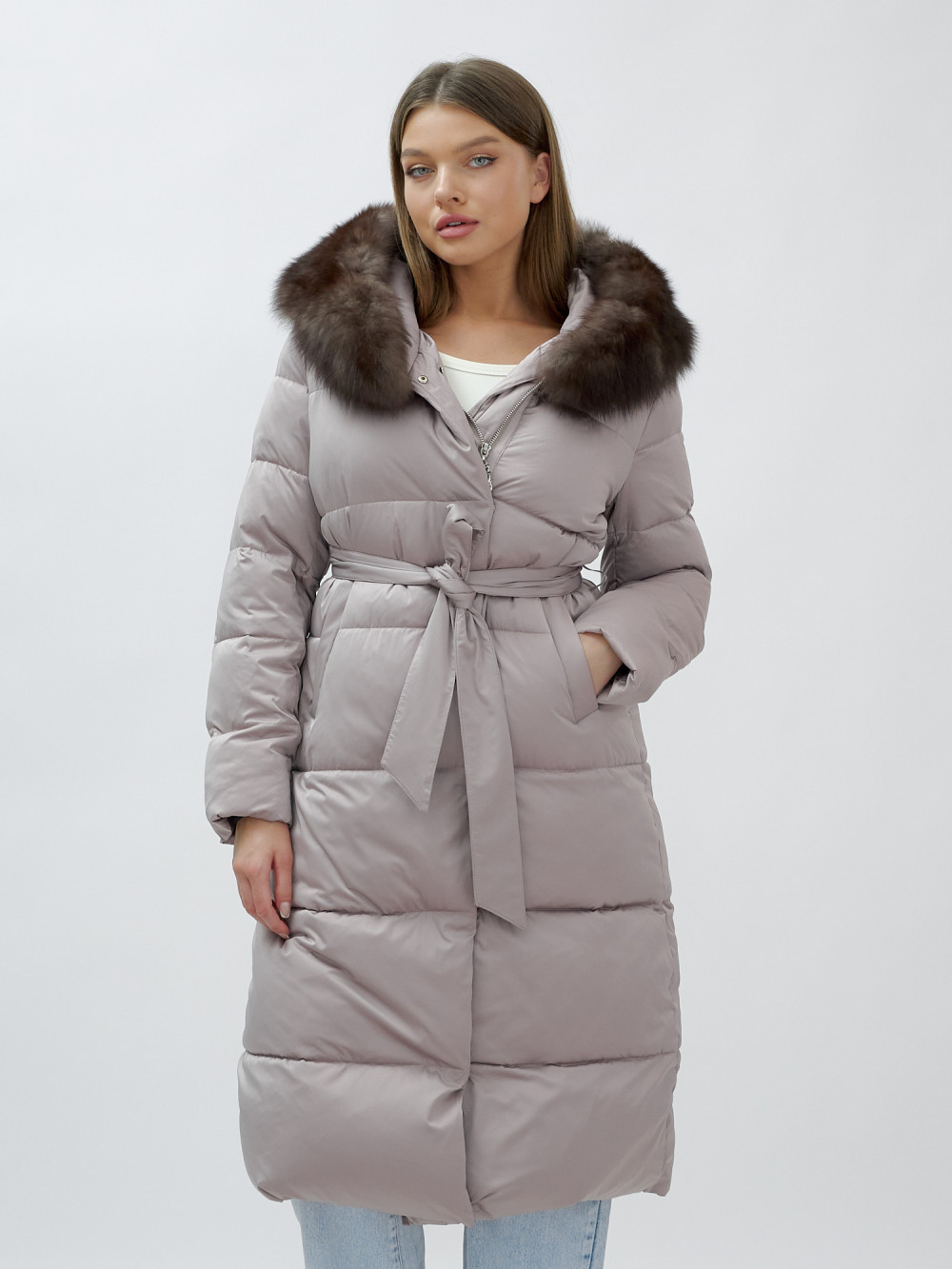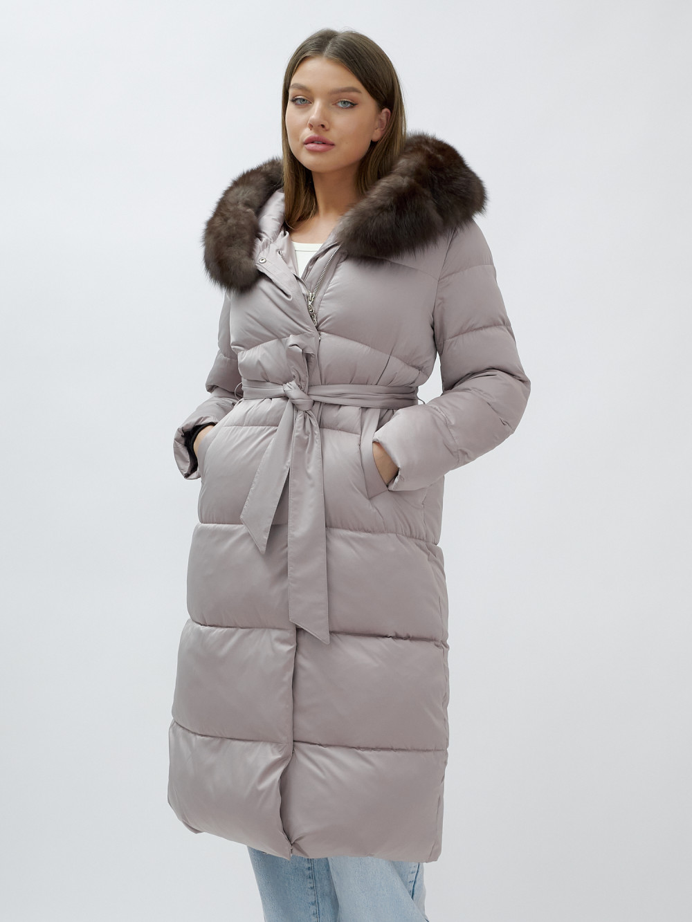 Пальто женское зимние с мехом песец люкс класса бежевого цвета 611_1B — Visdeer