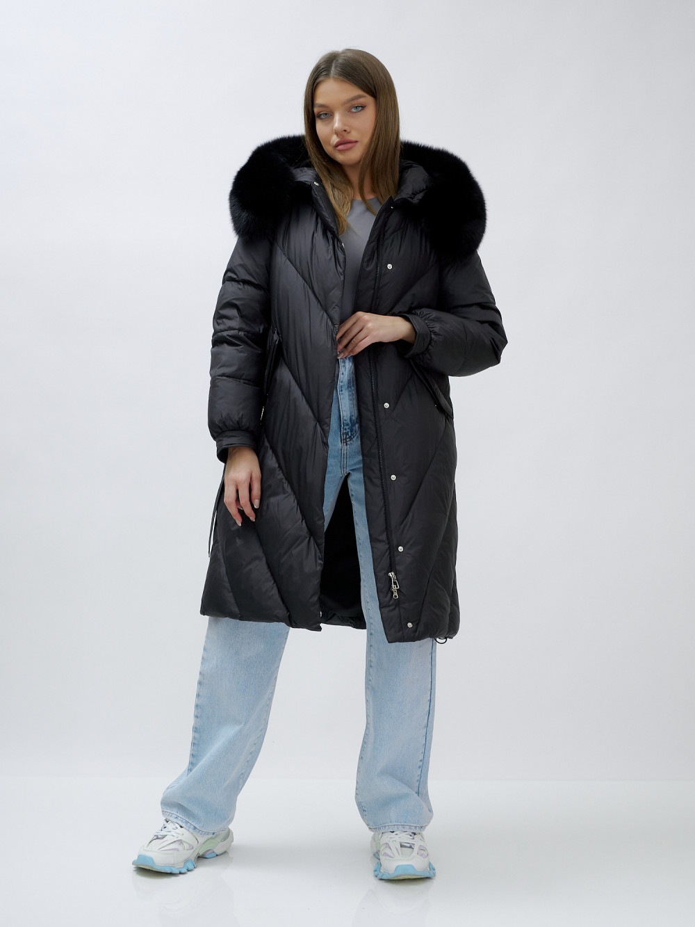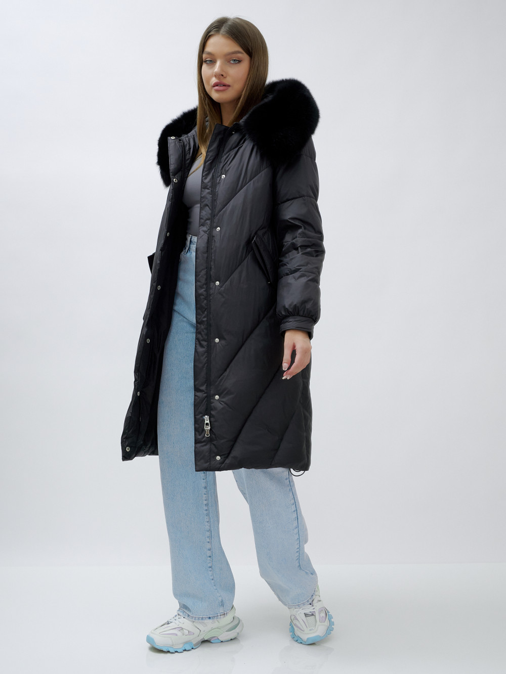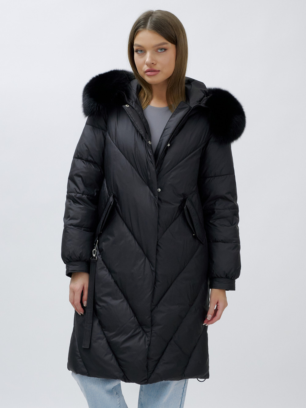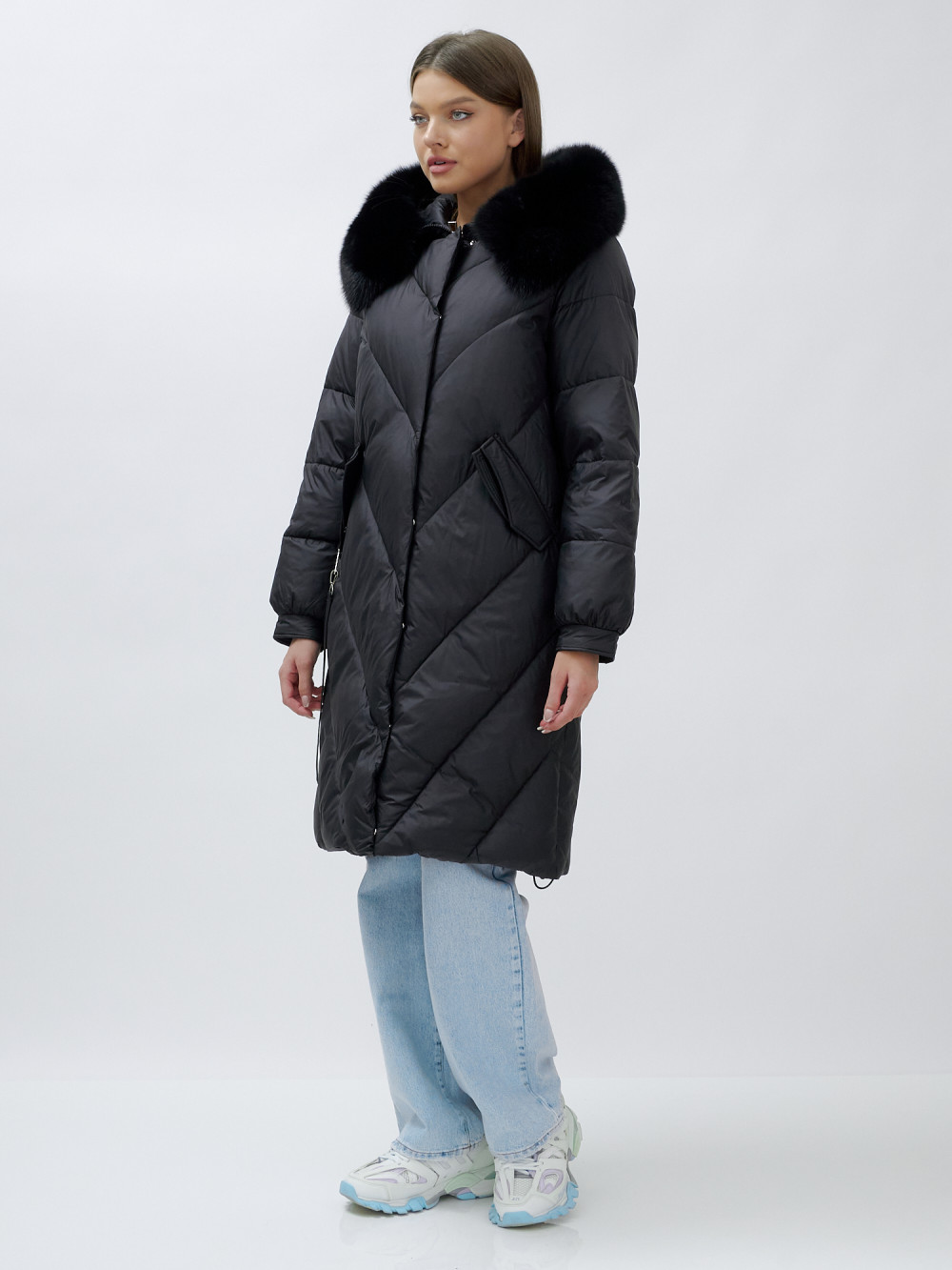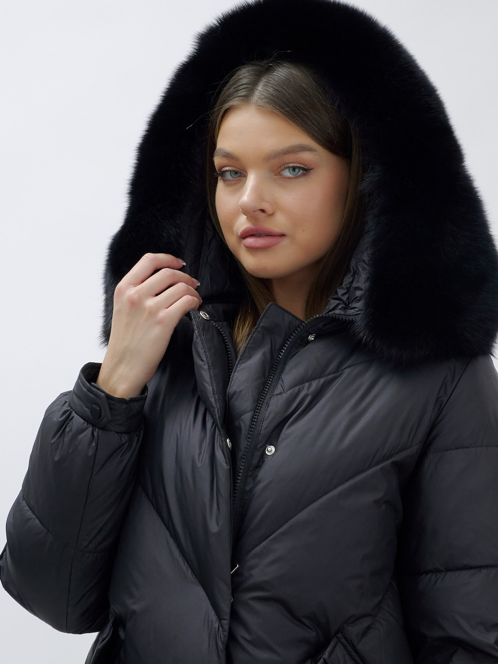 Пальто женское зимние с мехом песец люкс класса черного цвета 1316Ch — APNEEY