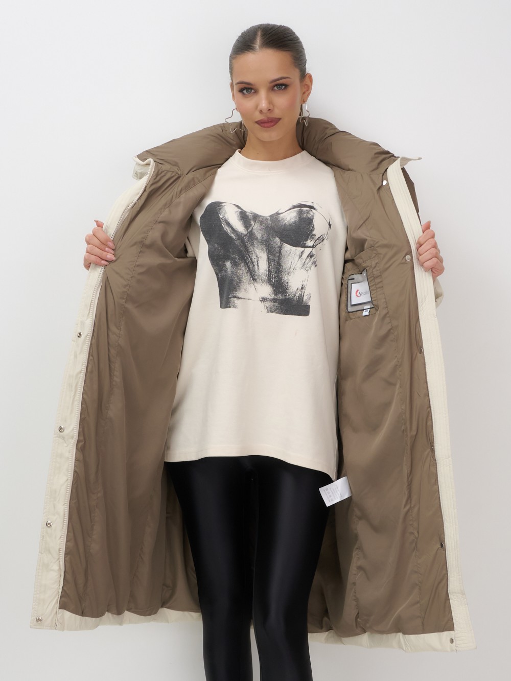 Пальто зимнее утепленное с капюшоном женское бежевого цвета 7709B