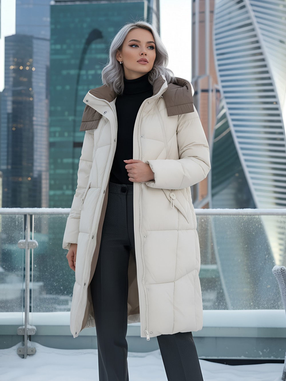 Элегантный прямой и свободный покрой с удлиненной длиной ниже колена создает утонченный силуэт, а съемный капюшон добавляет практичности и стиля. Воротник-стойка не только защищает от холода, но и придает дополнительную изысканность. Удобные внутренние карманы с магнитными застежками идеально подходят для хранения мелочей, которые всегда должны быть под рукой.