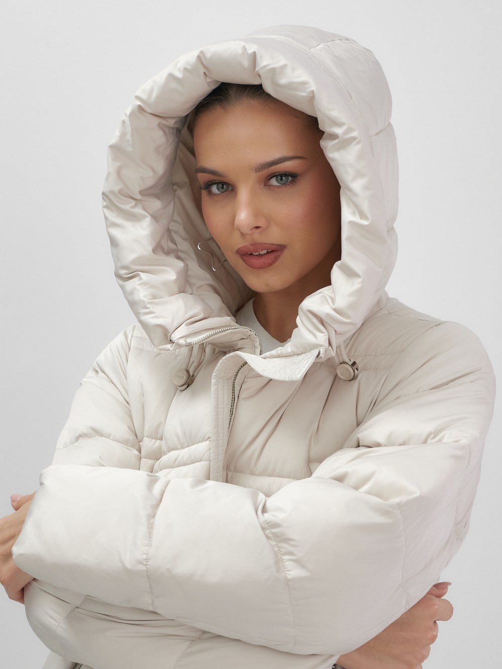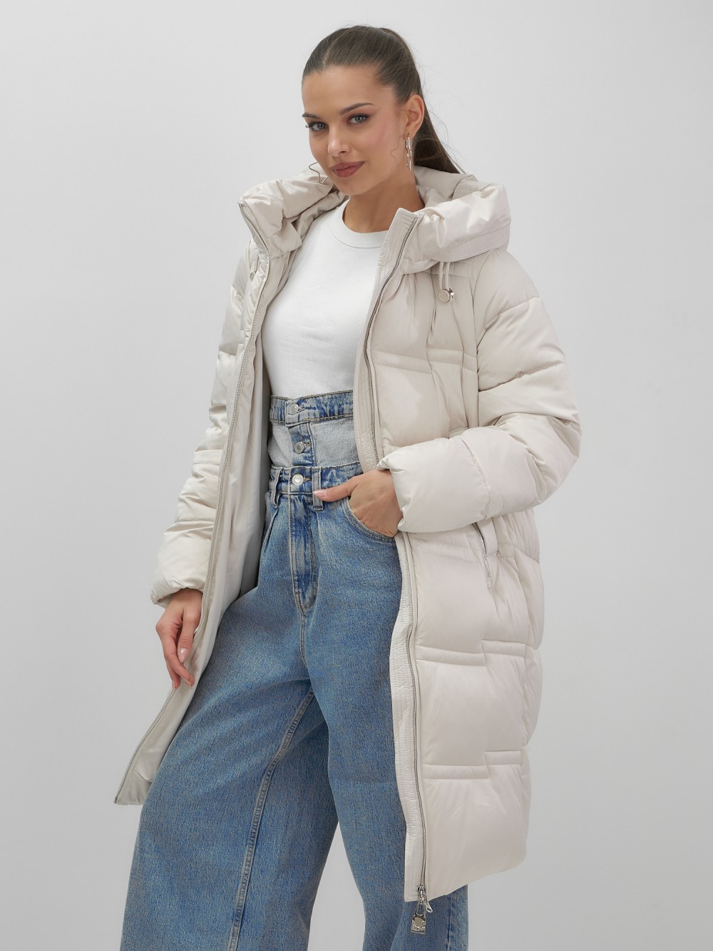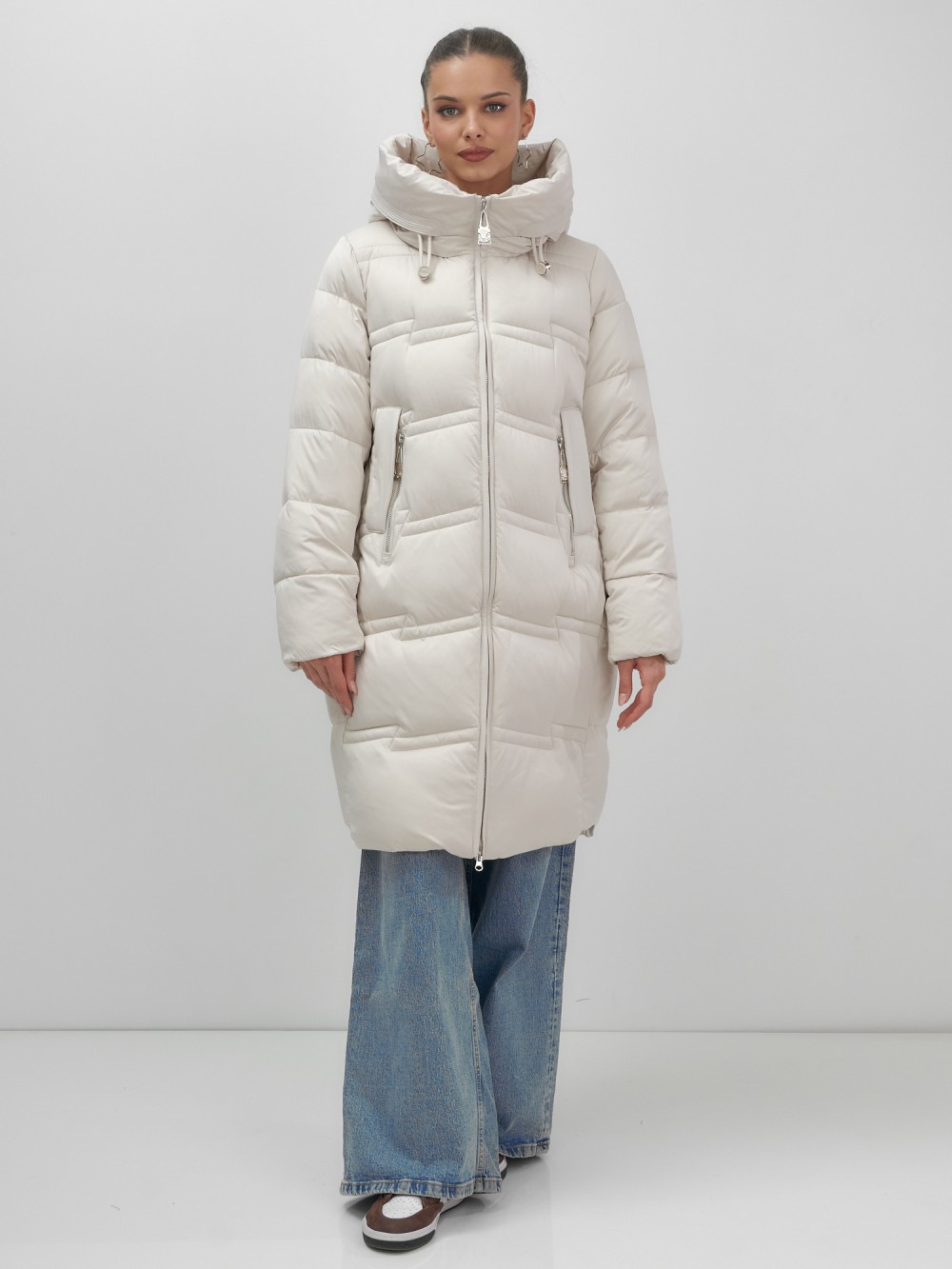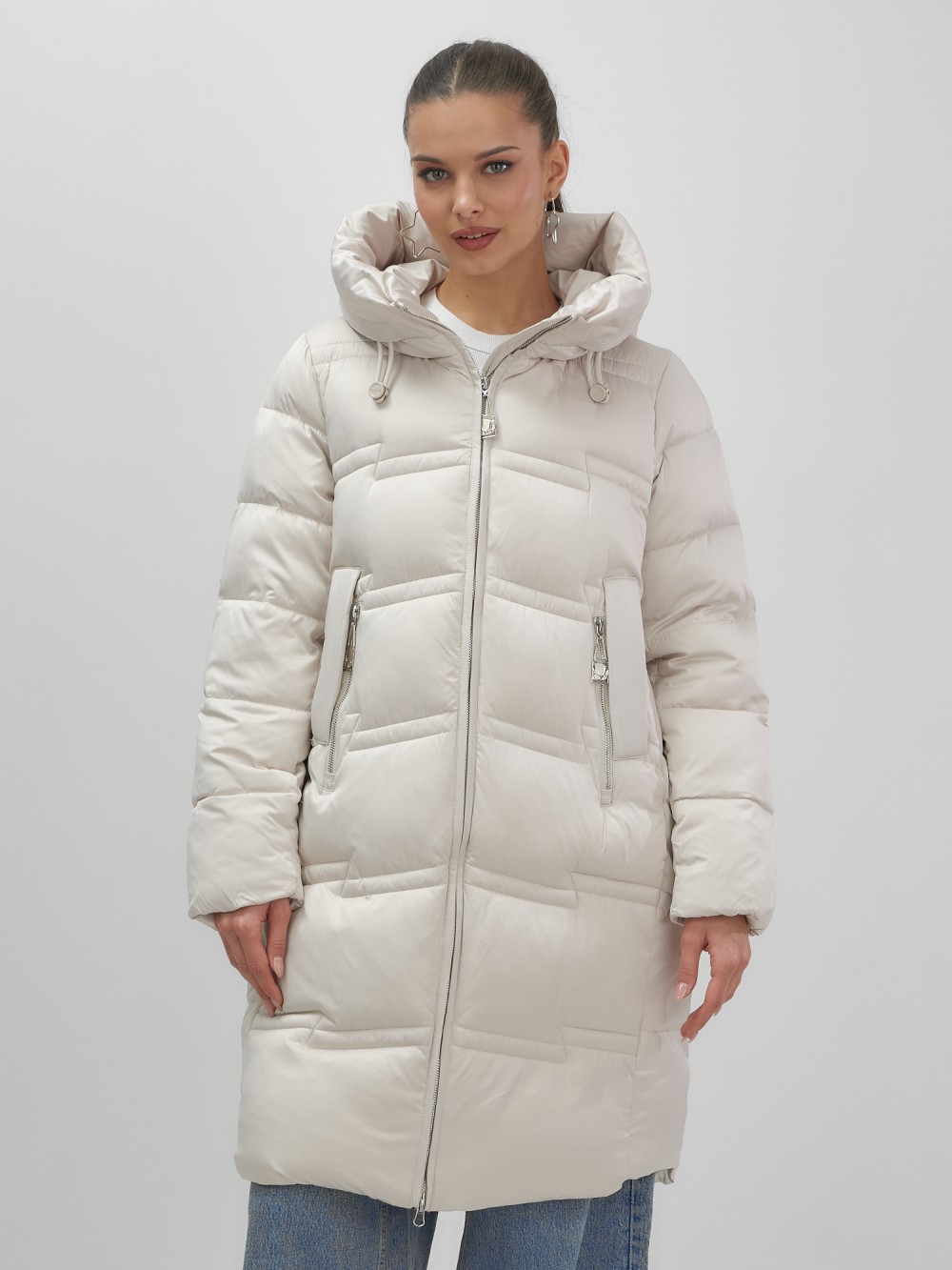 Пальто зимнее утепленное с капюшоном женское бежевого цвета 7779B