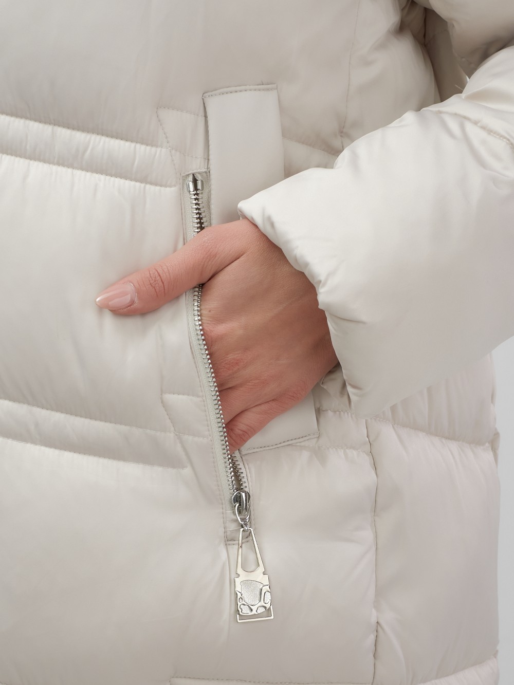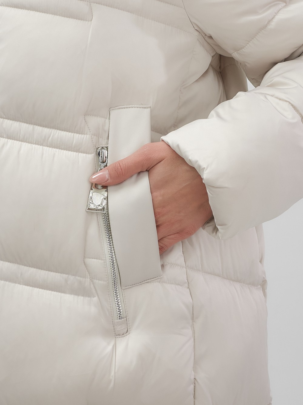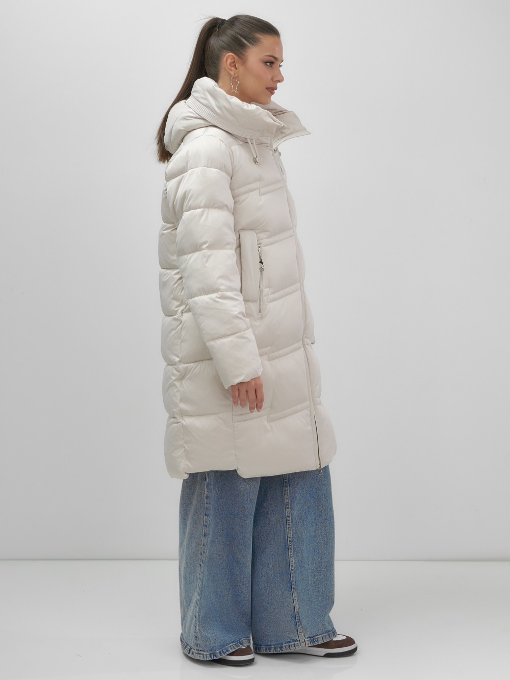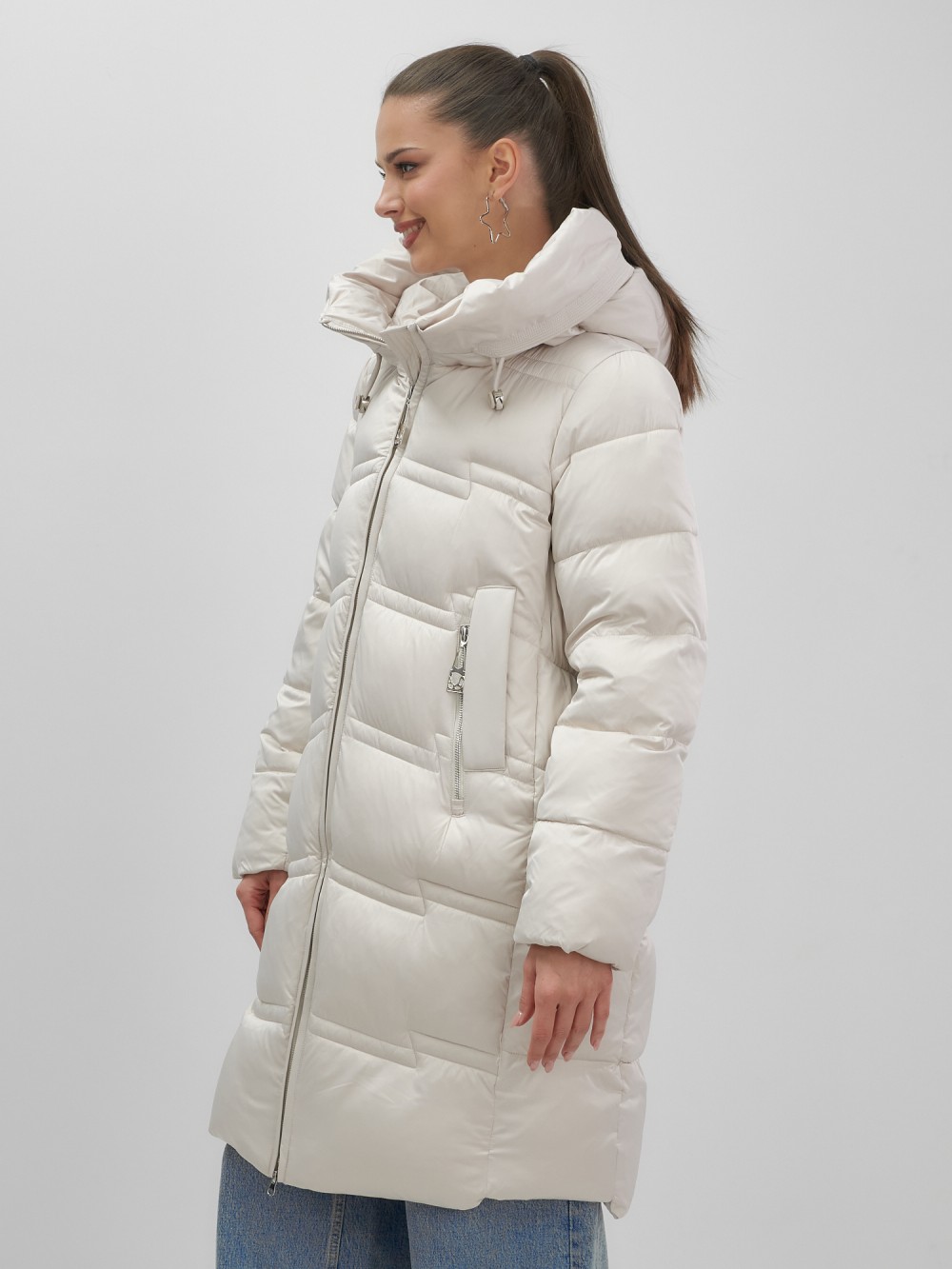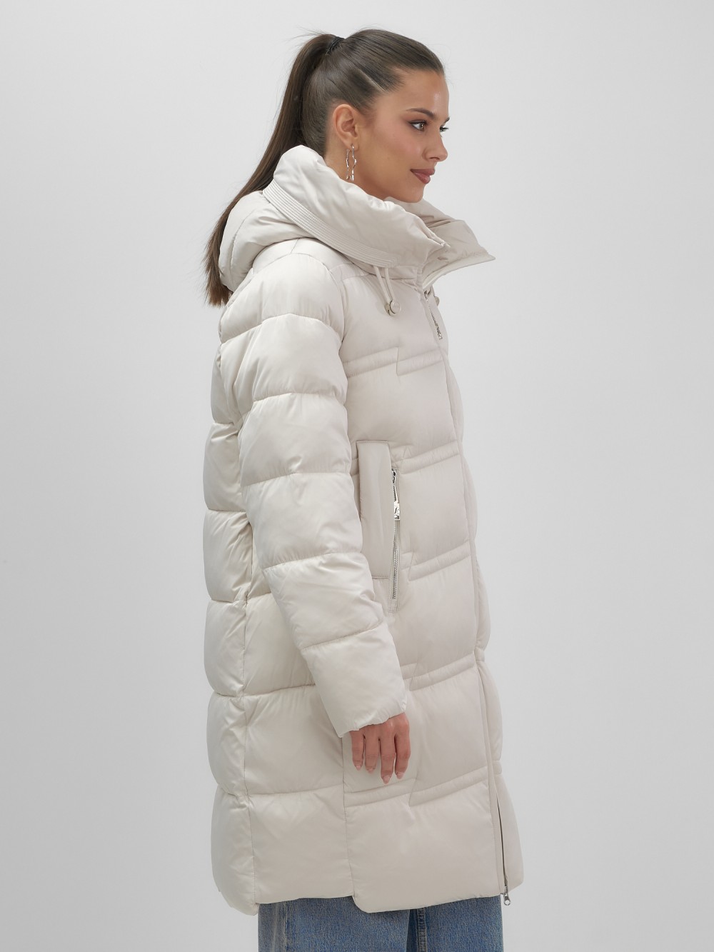 Пальто зимнее утепленное с капюшоном женское бежевого цвета 7779B