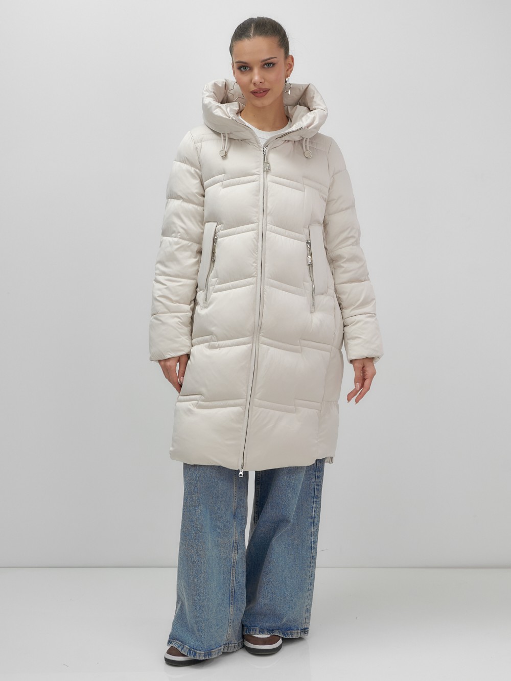 Пальто зимнее утепленное с капюшоном женское бежевого цвета 7779B — Visdeer