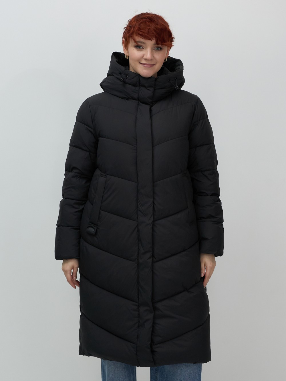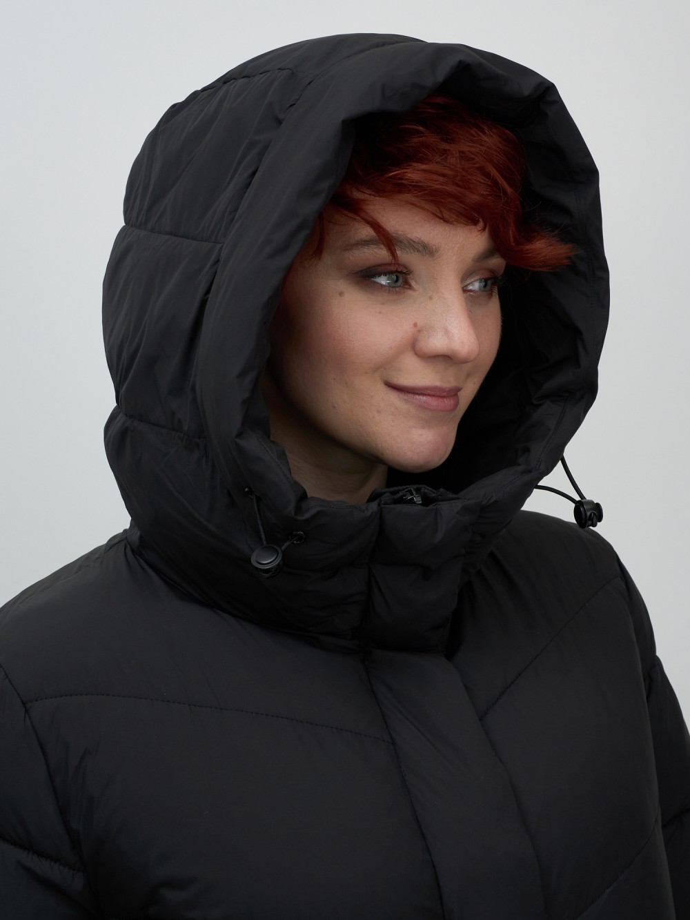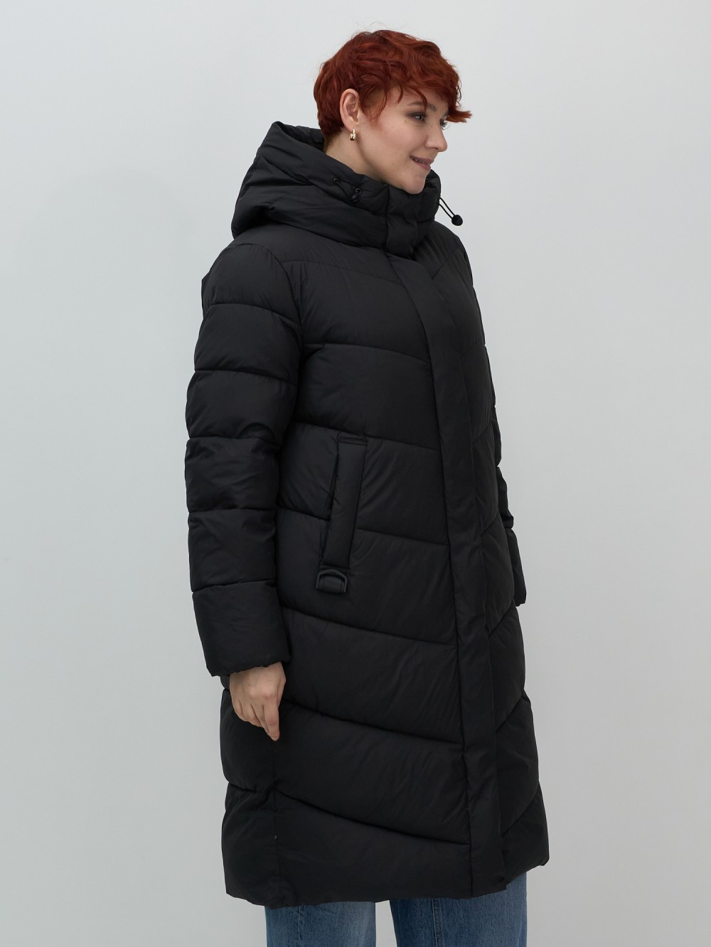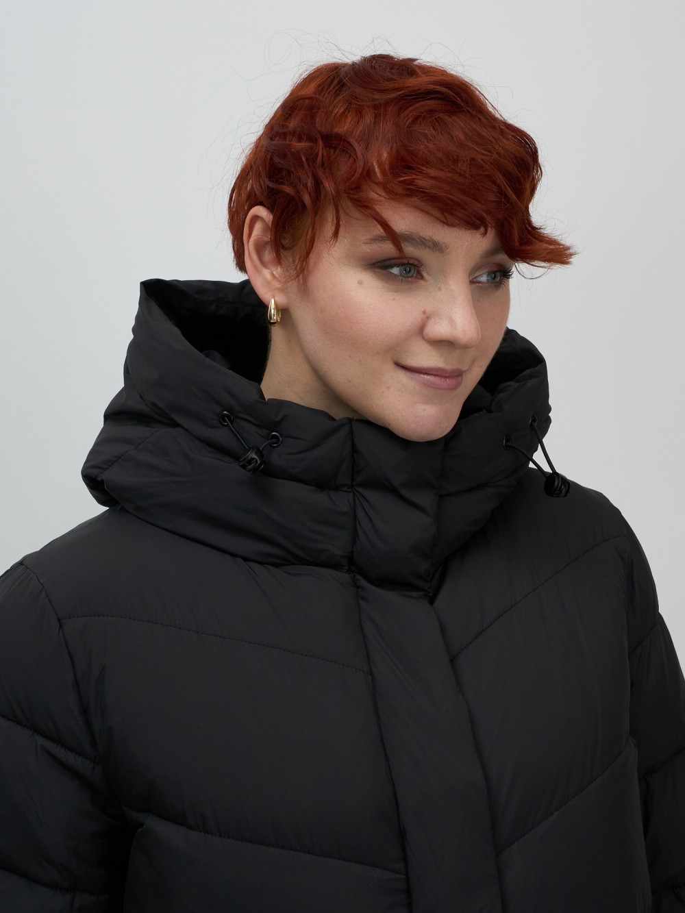 Пальто зимнее утепленное с капюшоном женское черного цвета 7623Ch