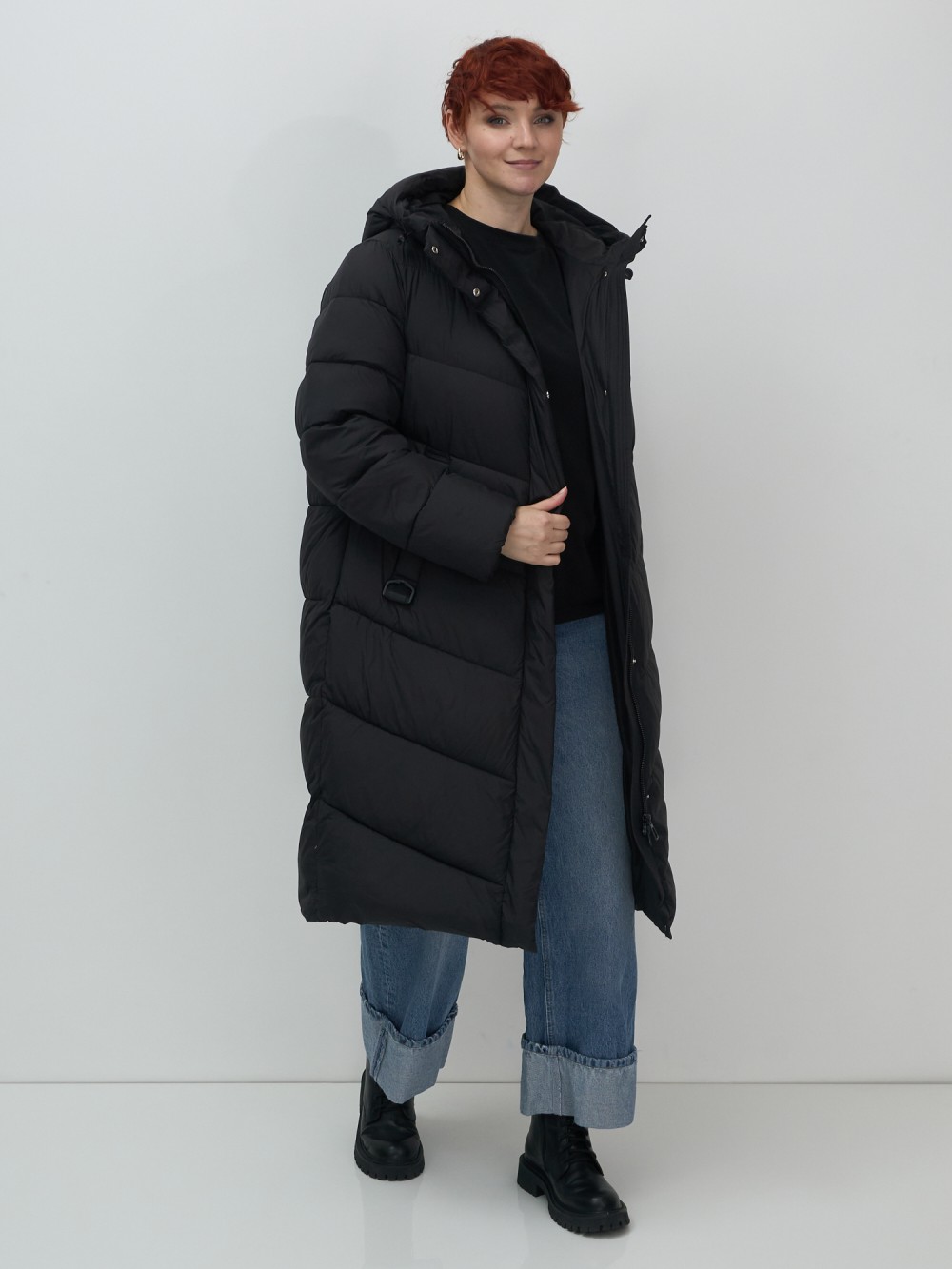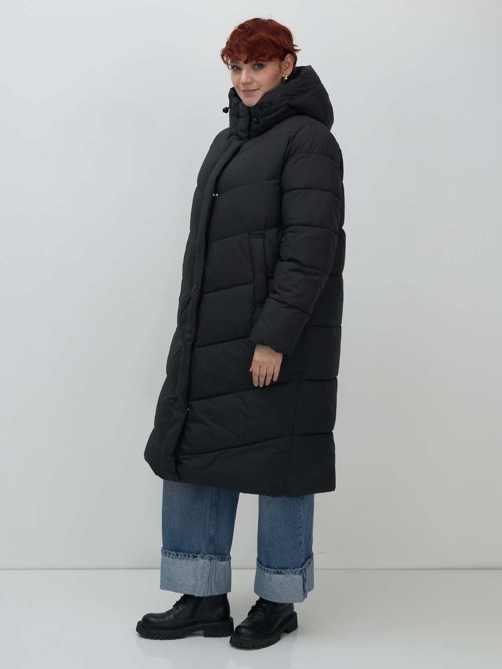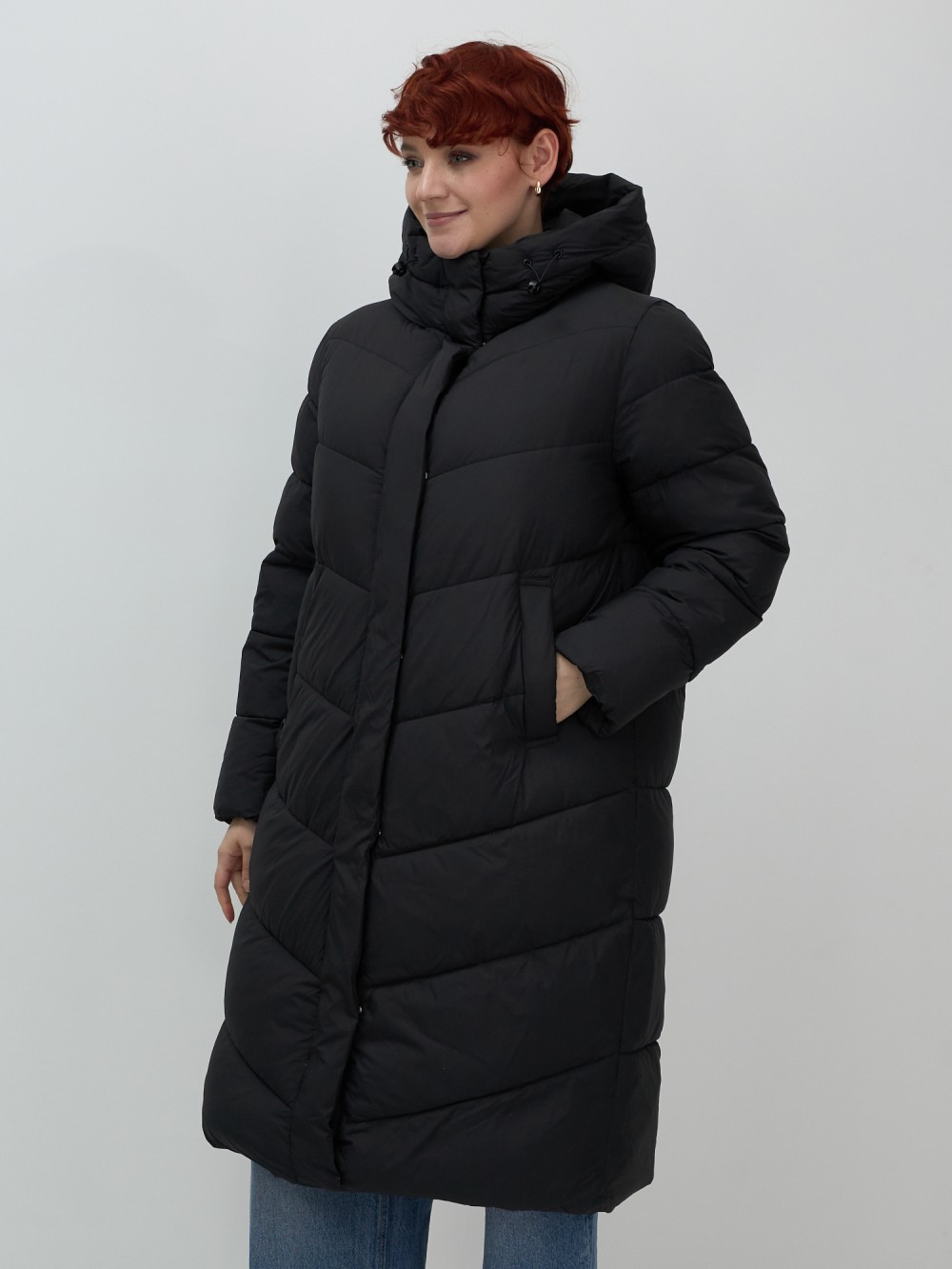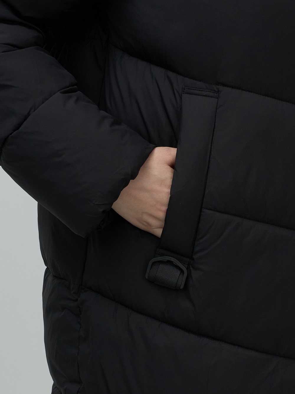 Пальто зимнее утепленное с капюшоном женское черного цвета 7623Ch