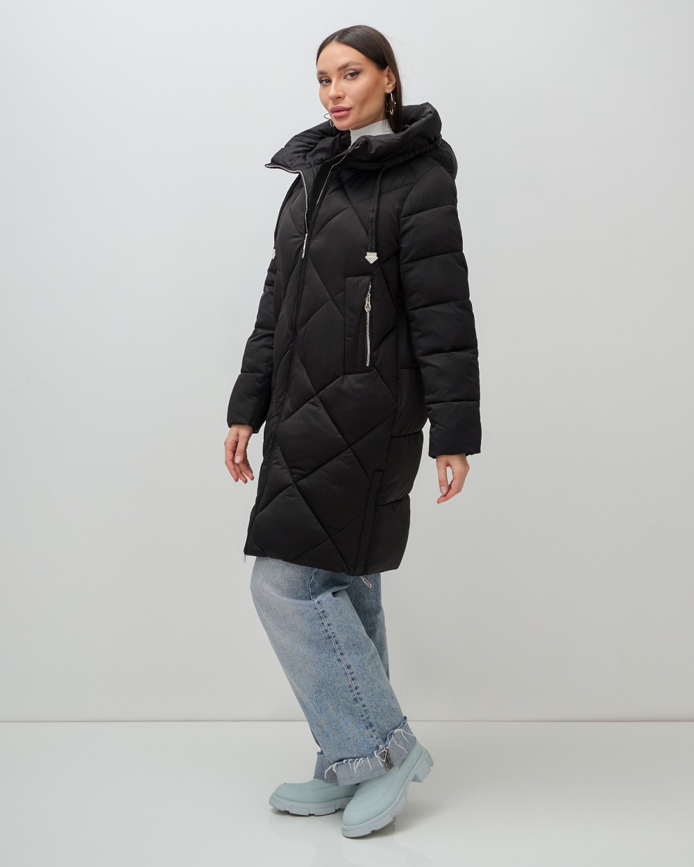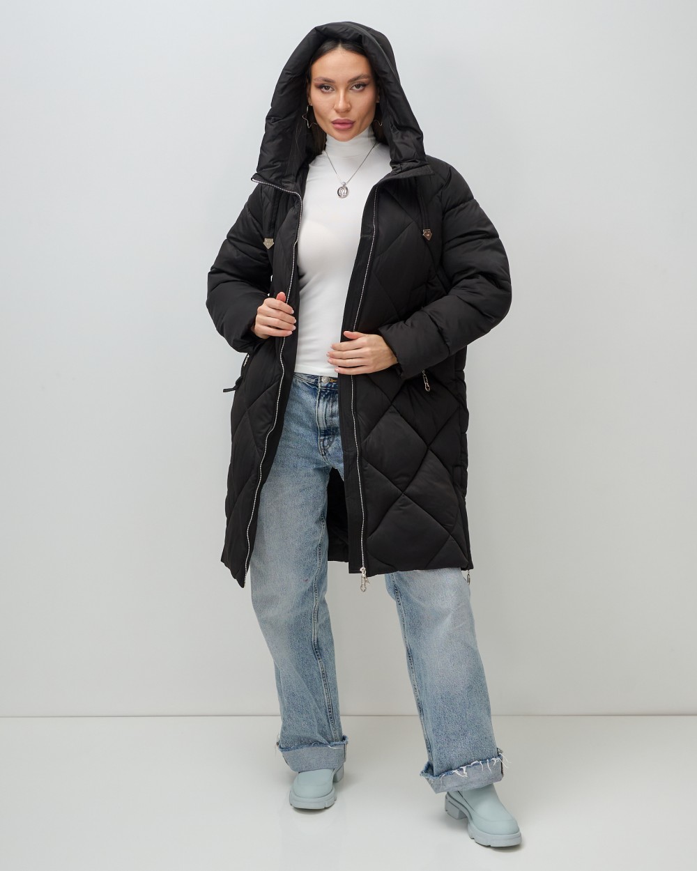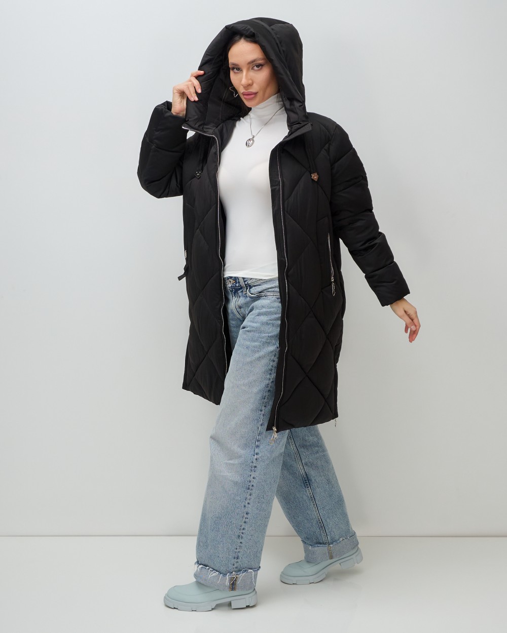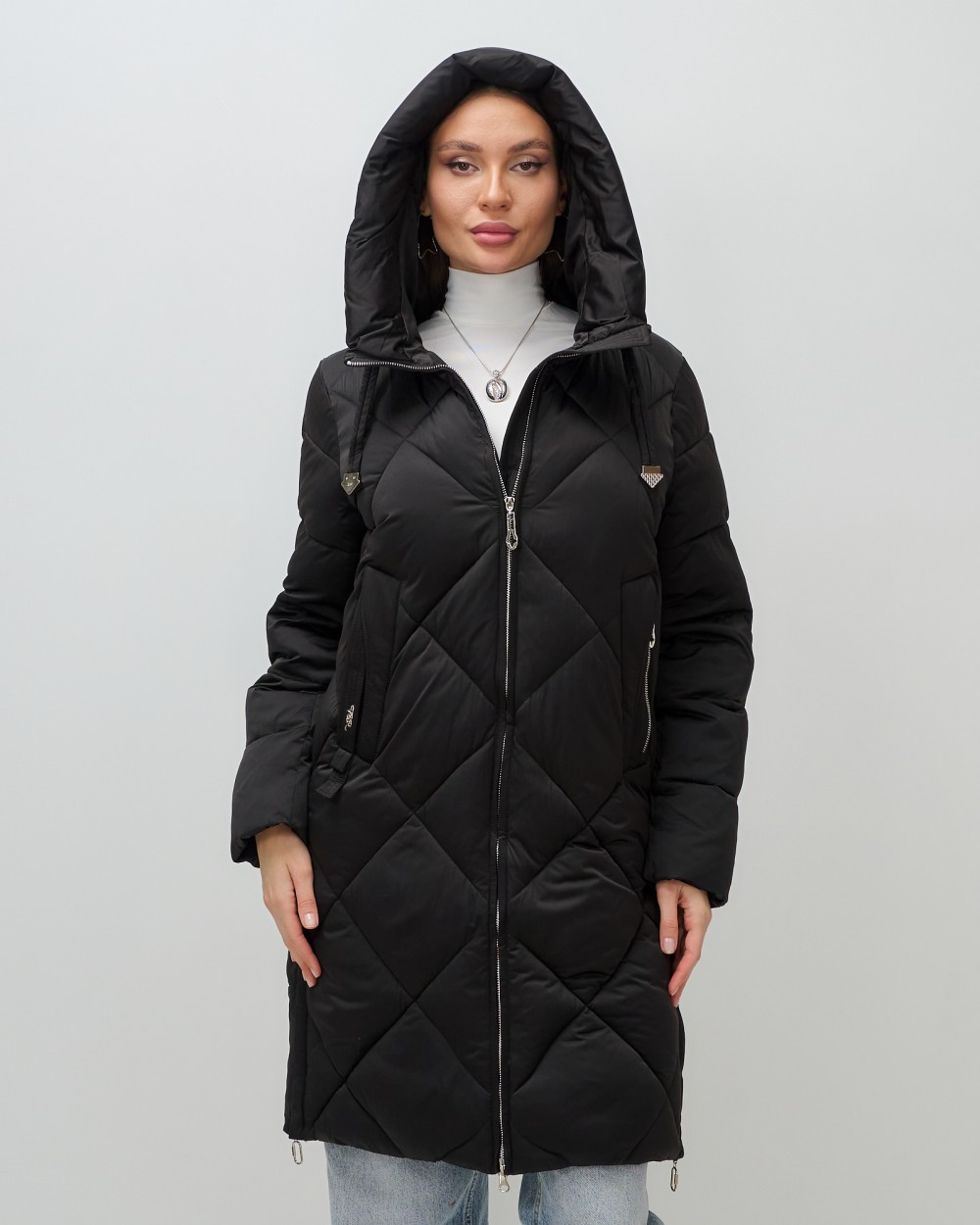 Пальто зимнее утепленное с капюшоном женское черного цвета 7637Ch — Visdeer