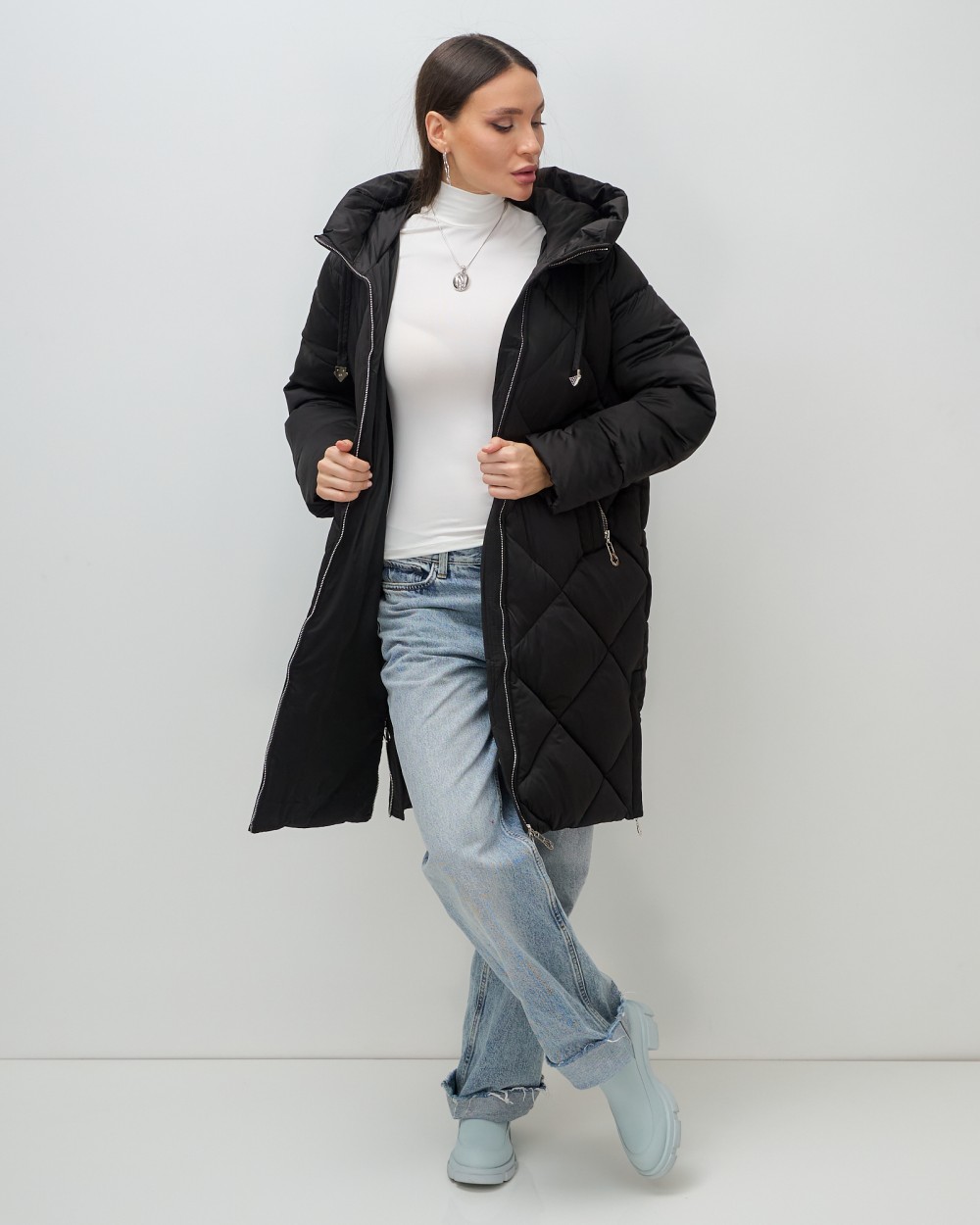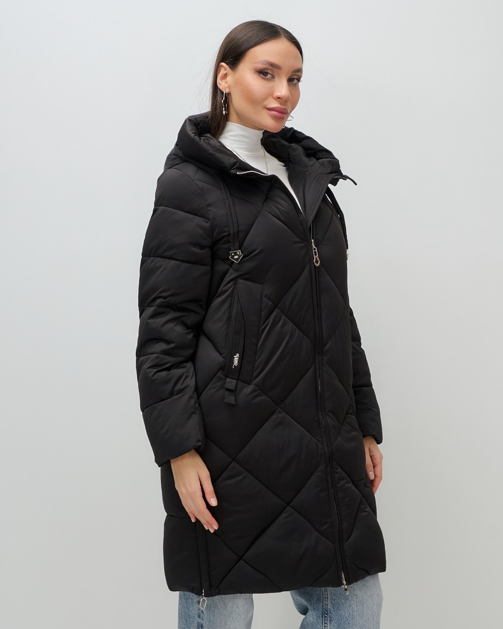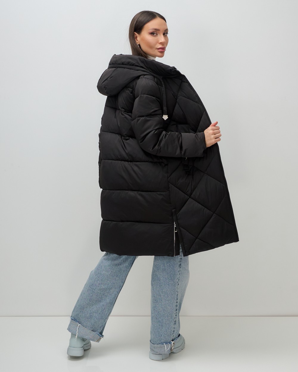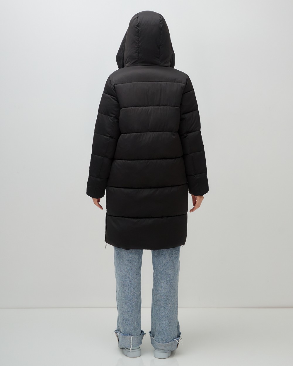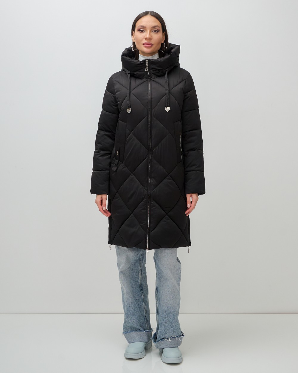 Пальто зимнее утепленное с капюшоном женское черного цвета 7637Ch — Visdeer