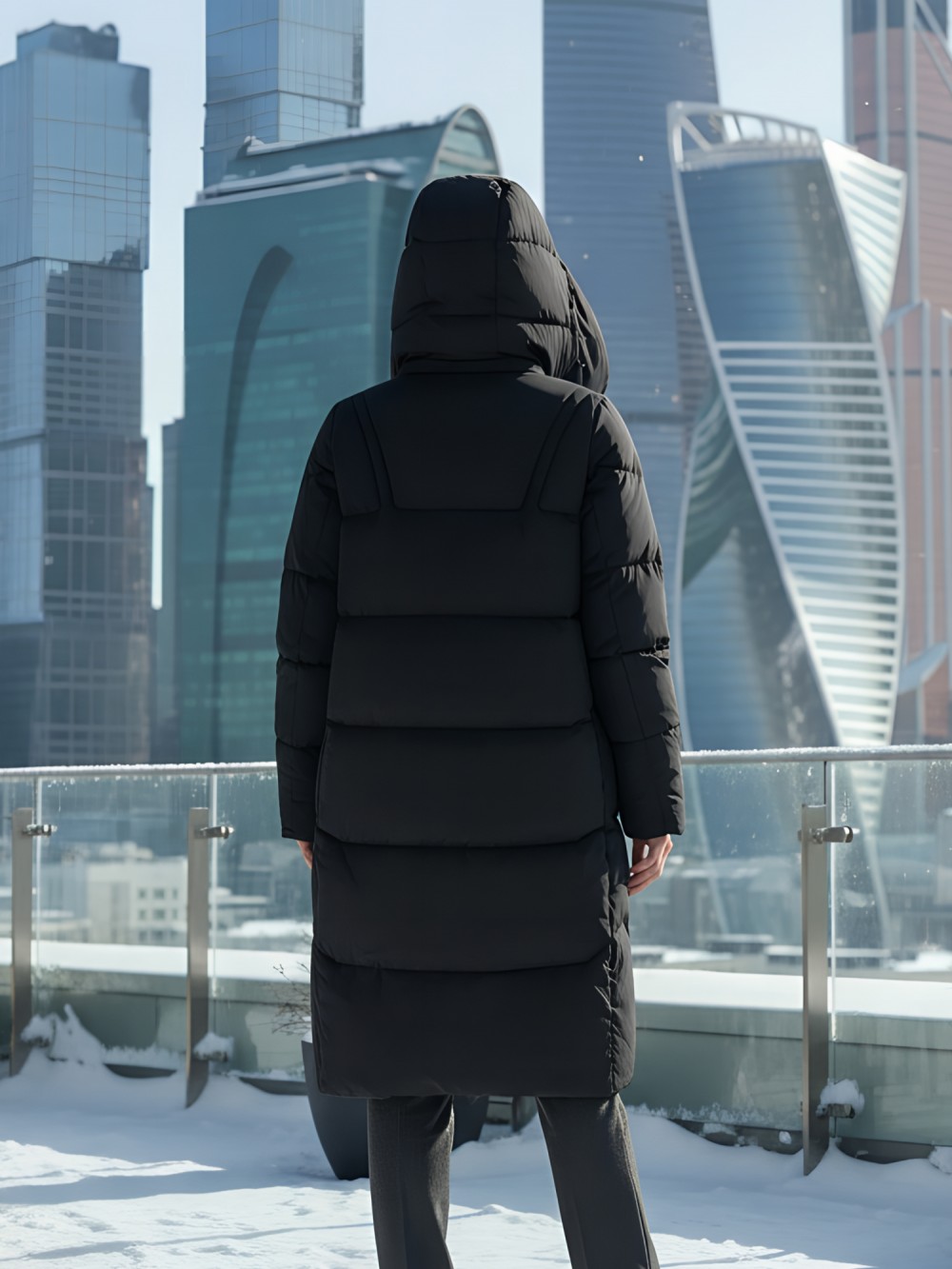 Элегантный прямой и свободный покрой с удлиненной длиной ниже колена создает утонченный силуэт, а съемный капюшон добавляет практичности и стиля. Воротник-стойка не только защищает от холода, но и придает дополнительную изысканность. Удобные внутренние карманы с магнитными застежками идеально подходят для хранения мелочей, которые всегда должны быть под рукой.