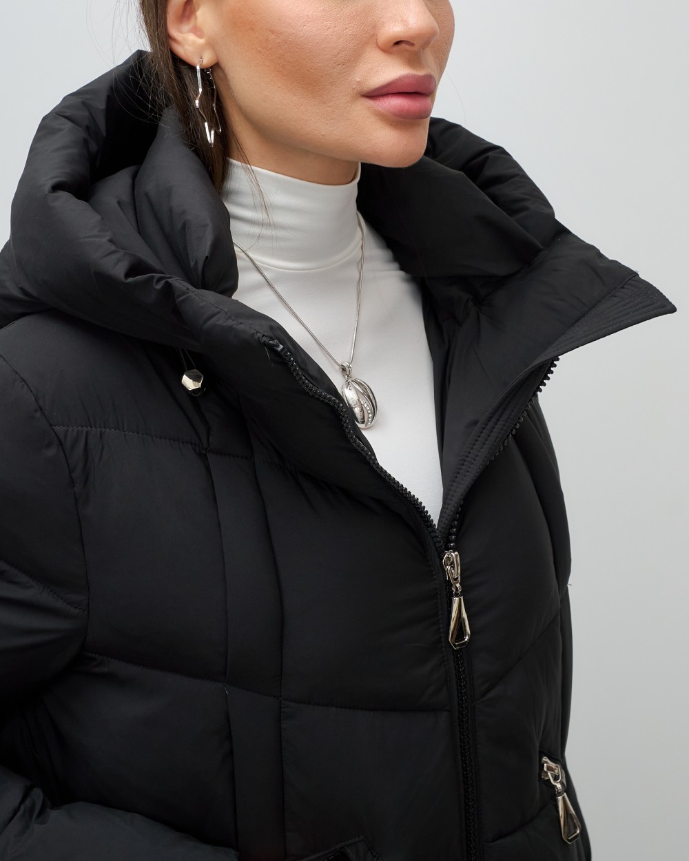 Пальто зимнее утепленное с капюшоном женское черного цвета 7729Ch