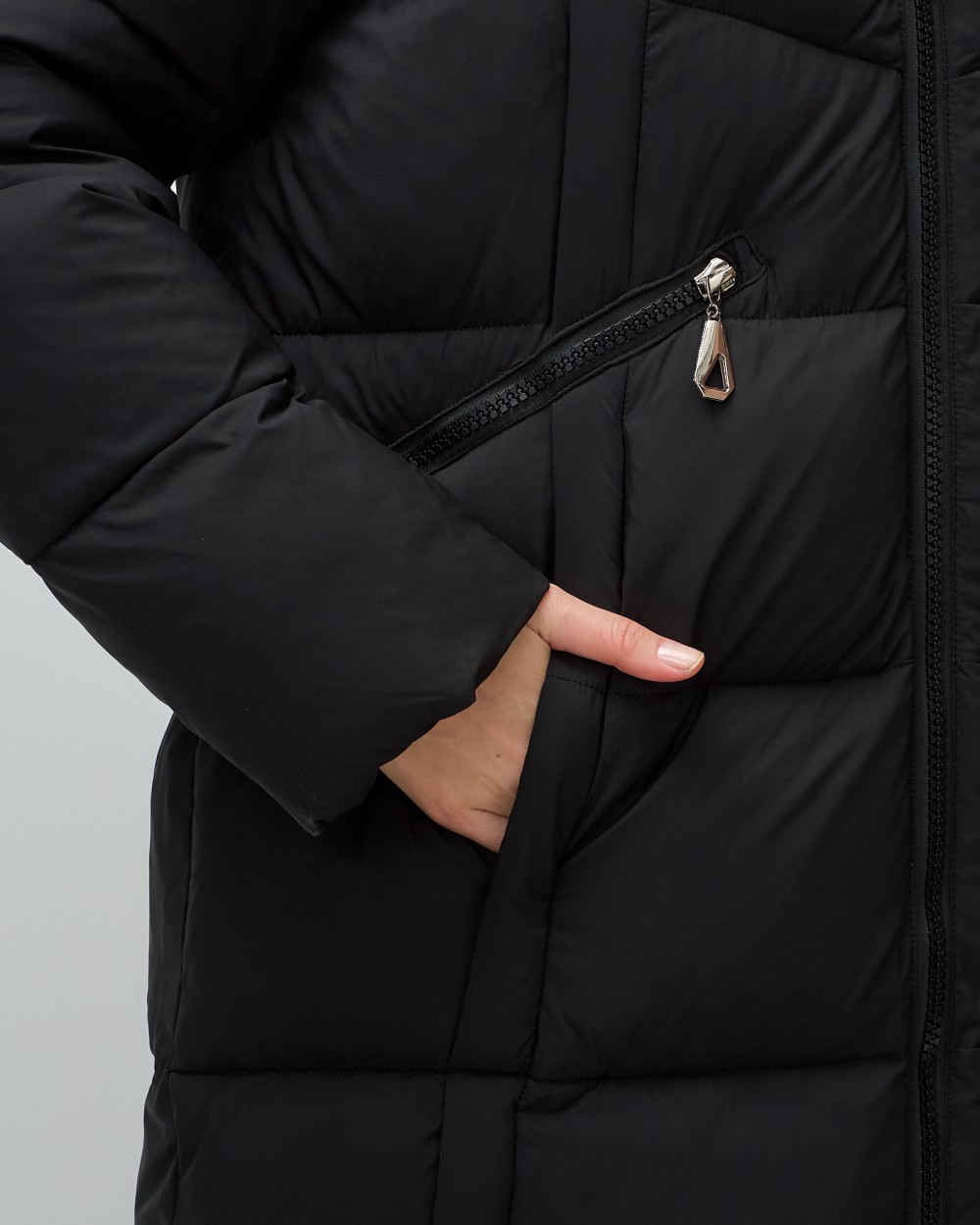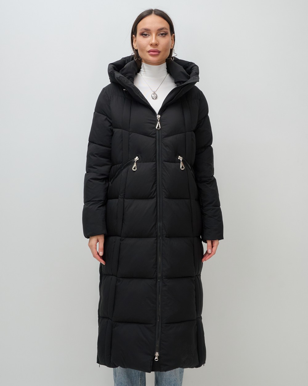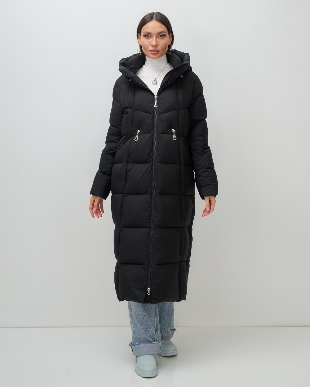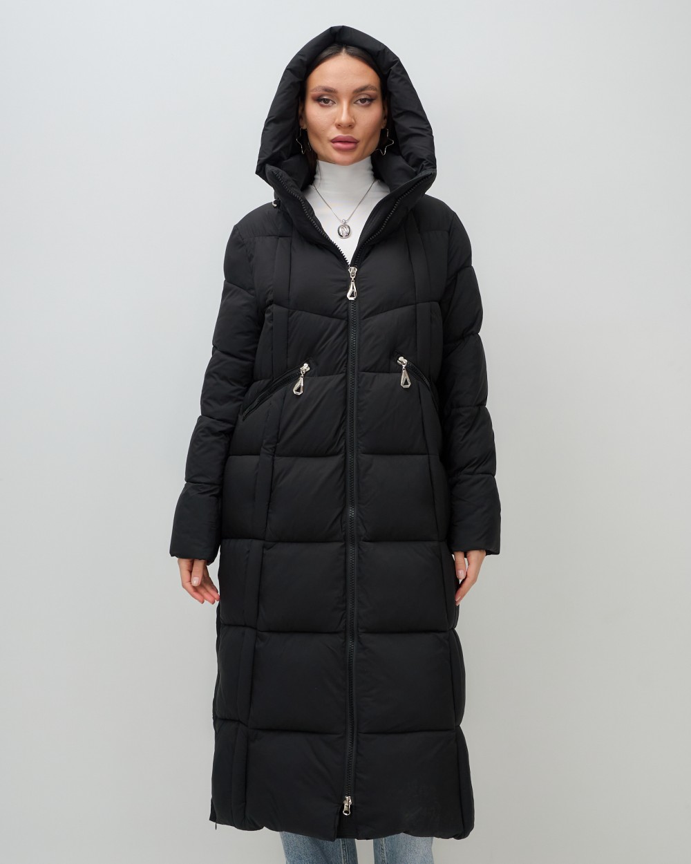 Пальто зимнее утепленное с капюшоном женское черного цвета 7729Ch — Visdeer