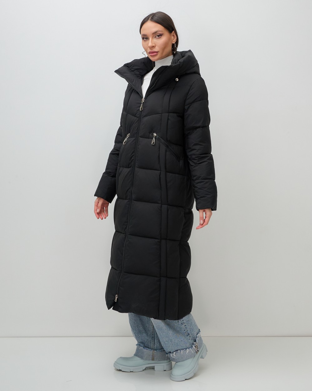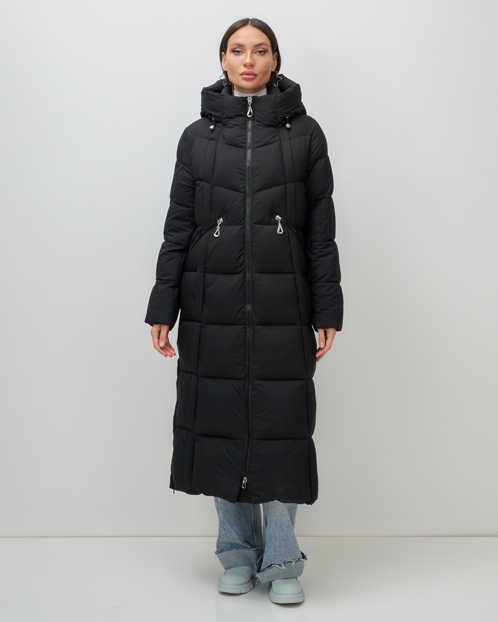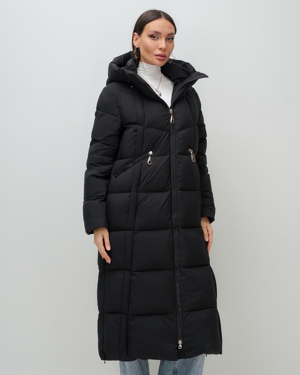 Пальто зимнее утепленное с капюшоном женское черного цвета 7729Ch — Visdeer