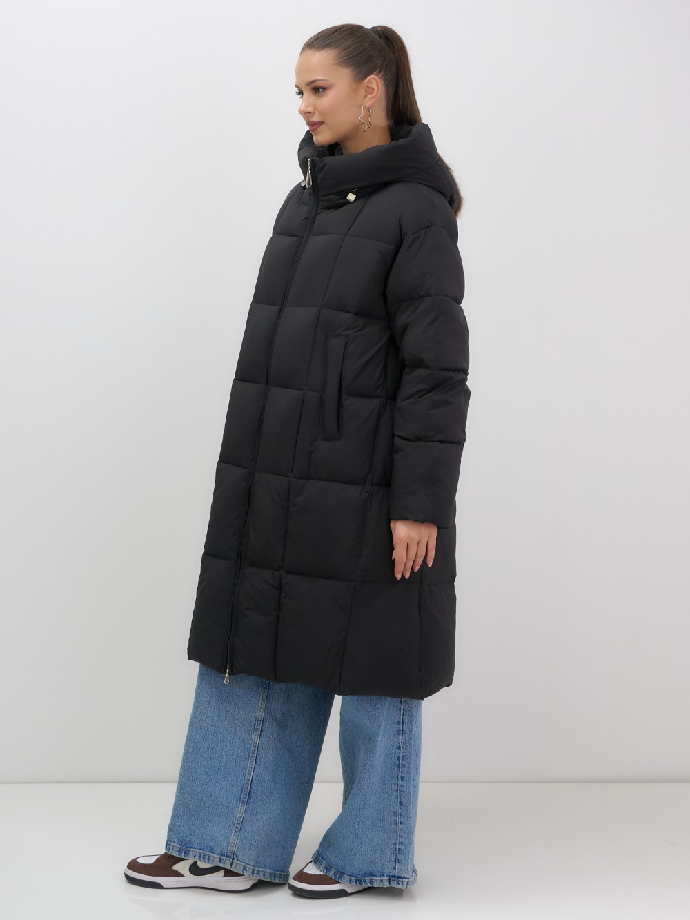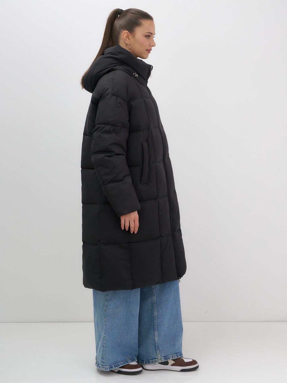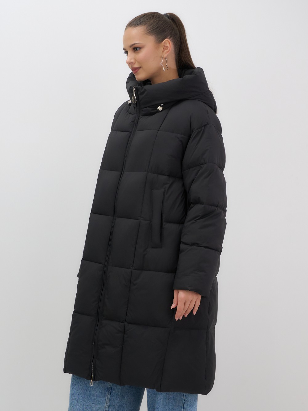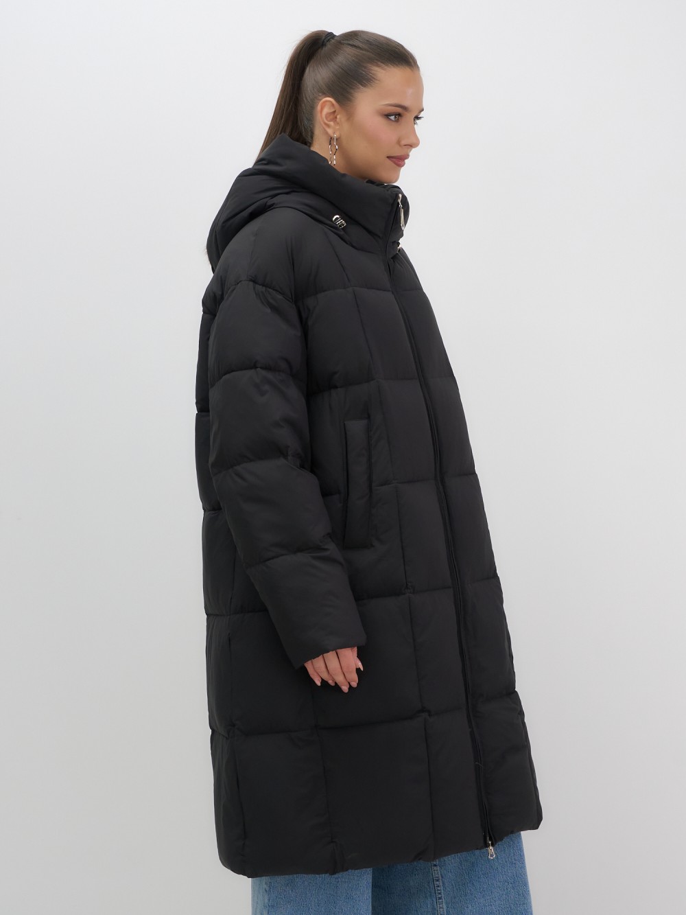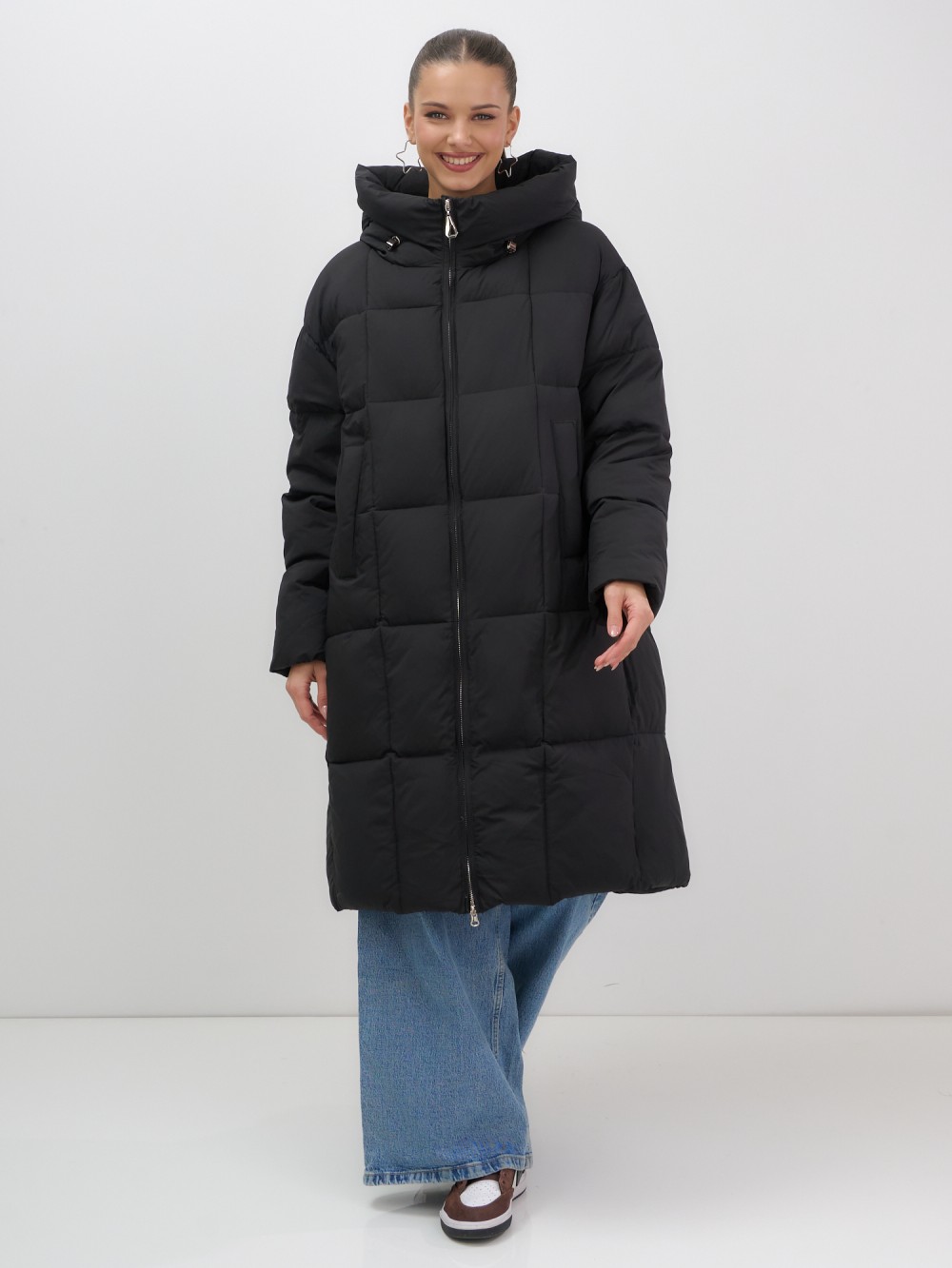 Пальто зимнее утепленное с капюшоном женское черного цвета 7741Ch — Visdeer
