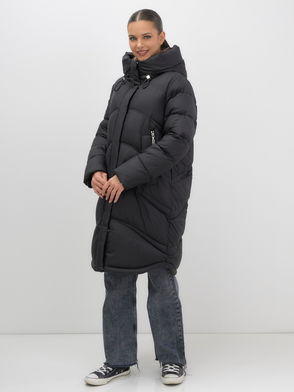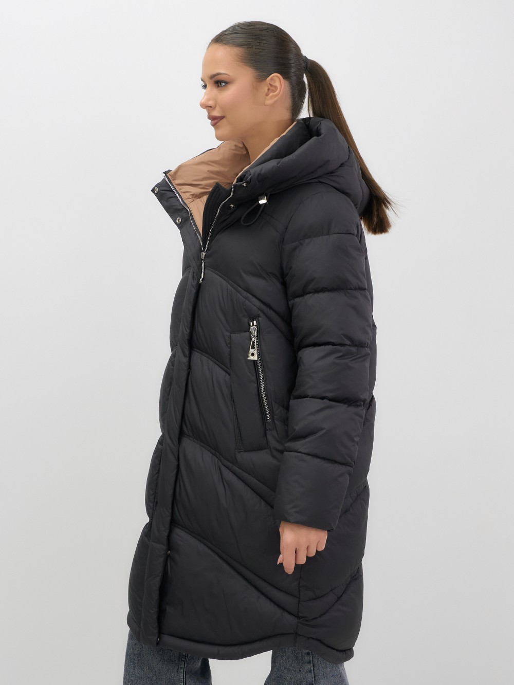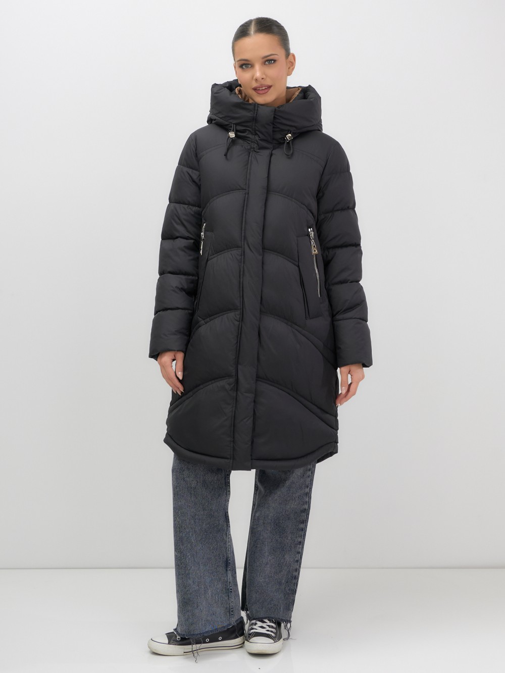 Пальто зимнее утепленное с капюшоном женское черного цвета 7747Ch — Visdeer