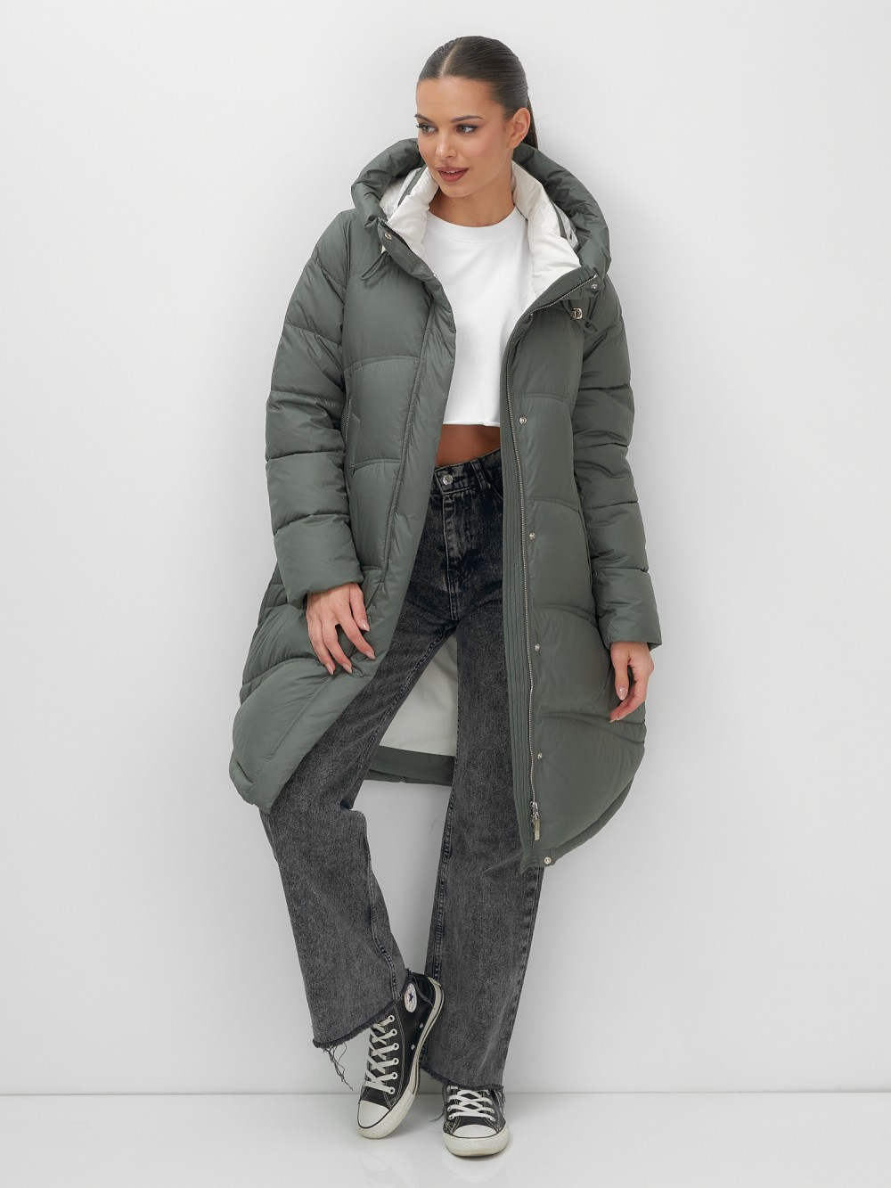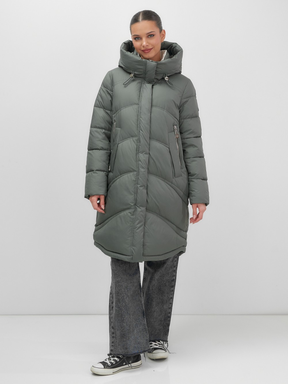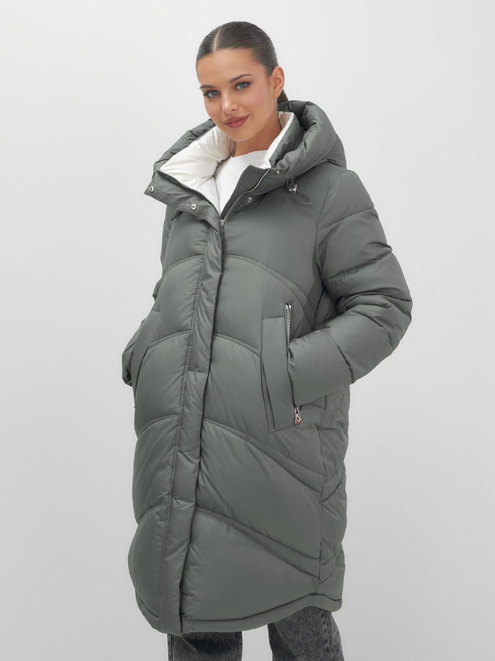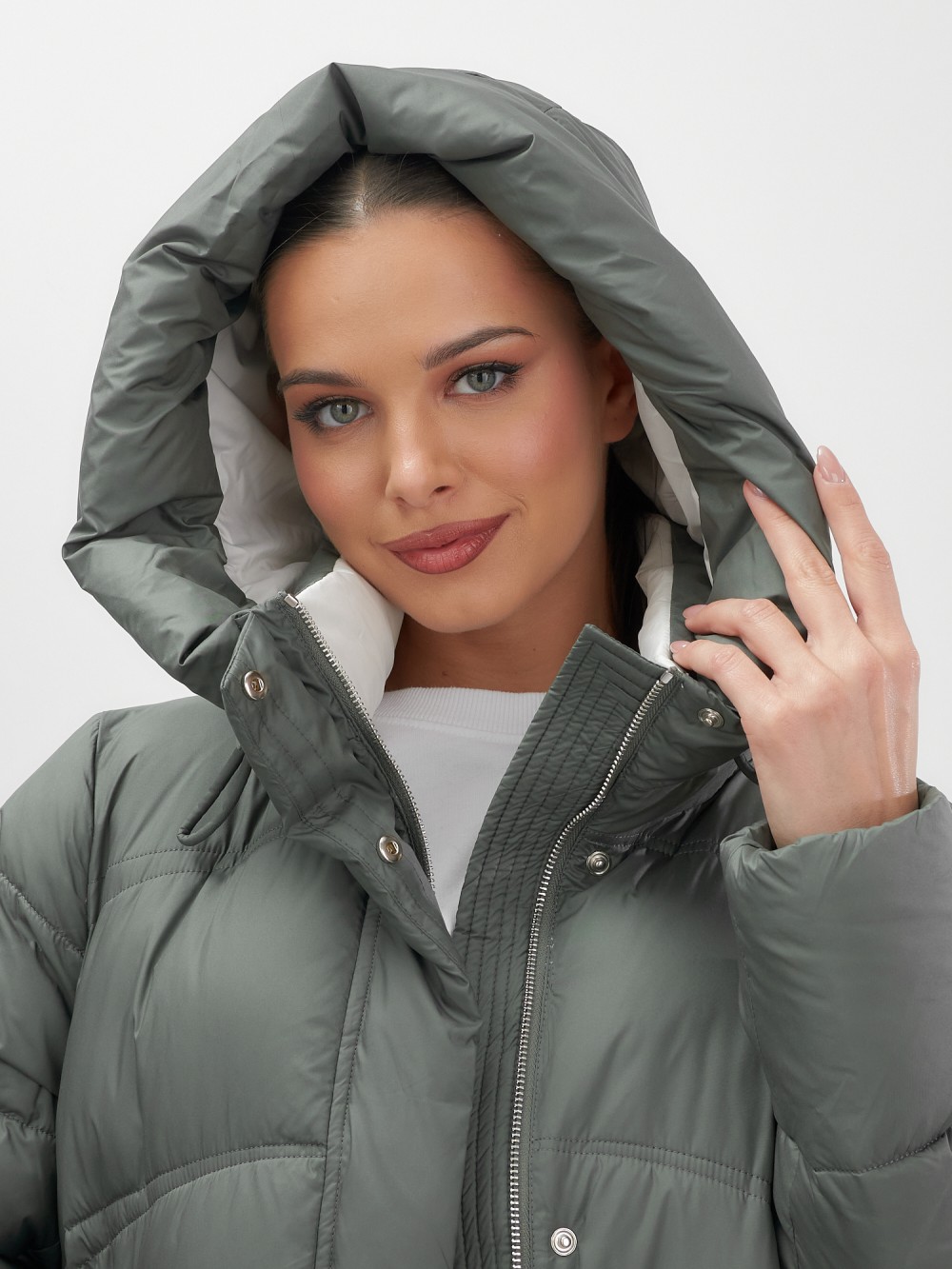 Пальто зимнее утепленное с капюшоном женское цвета хаки 7747Kh