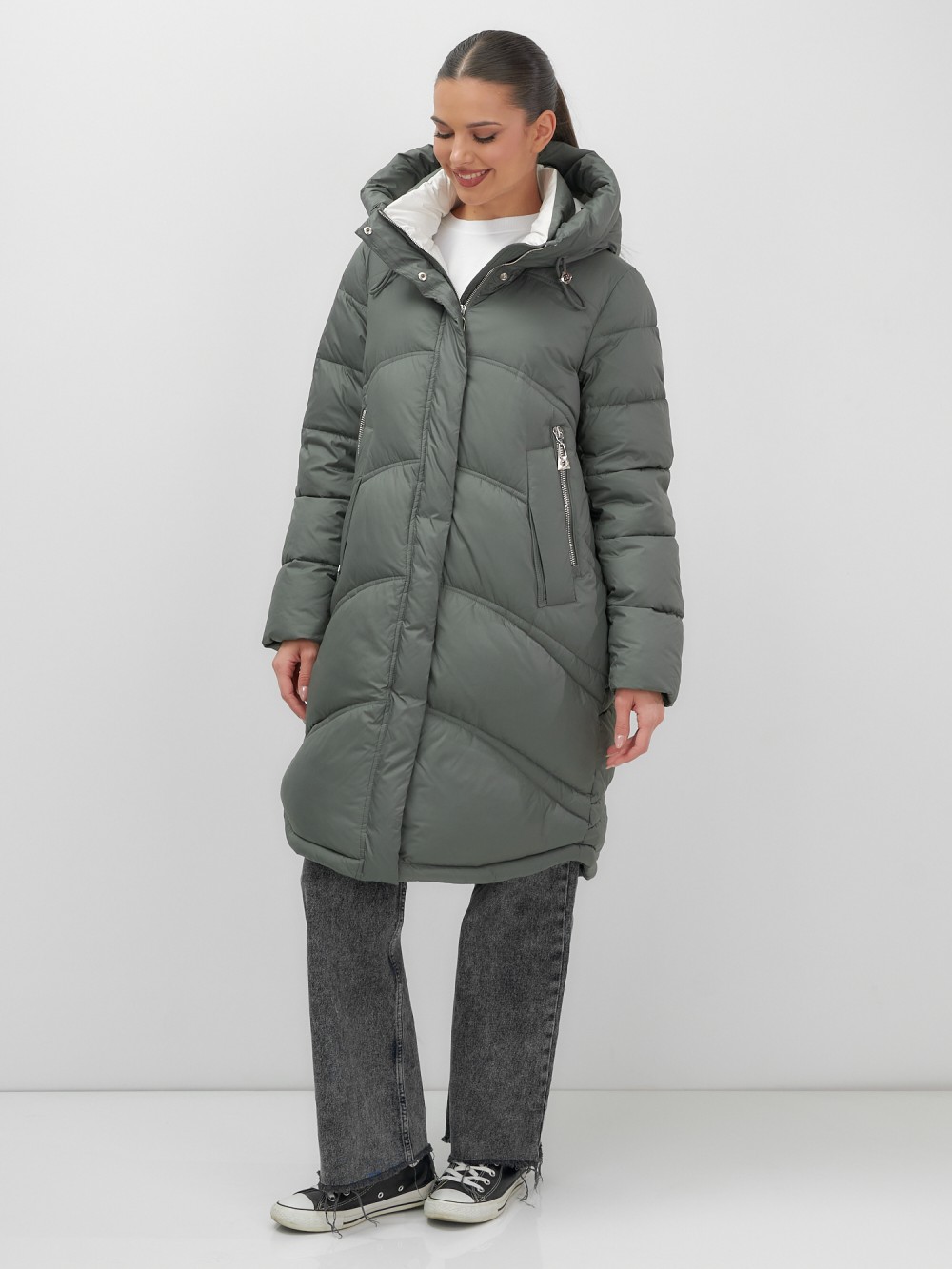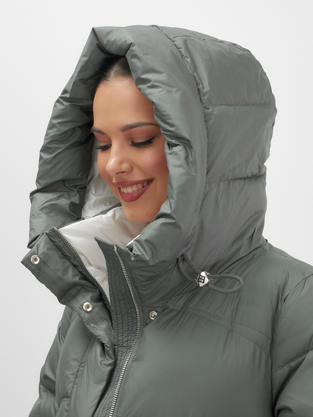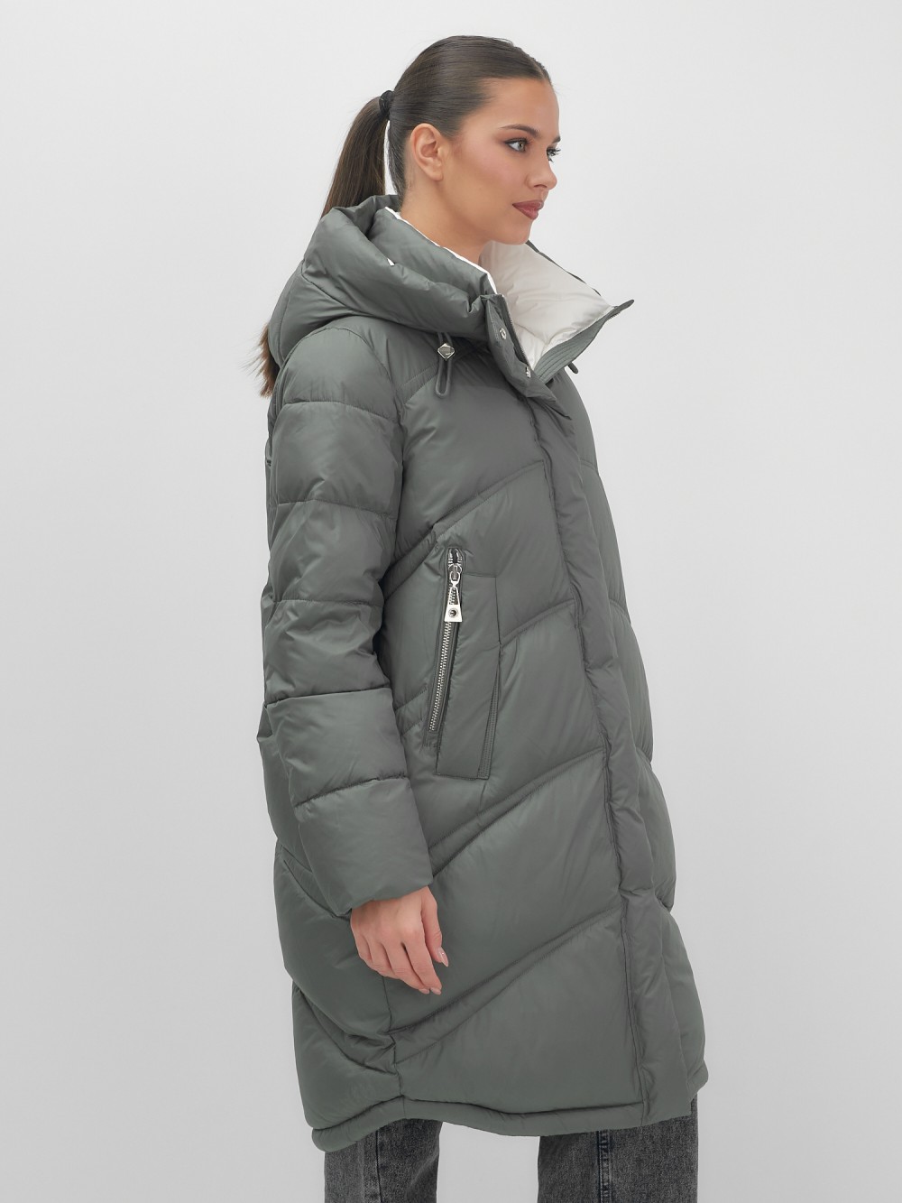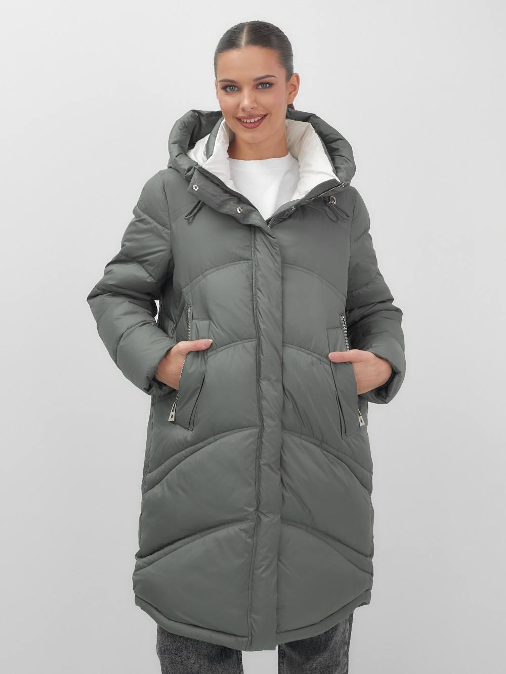 Пальто зимнее утепленное с капюшоном женское цвета хаки 7747Kh