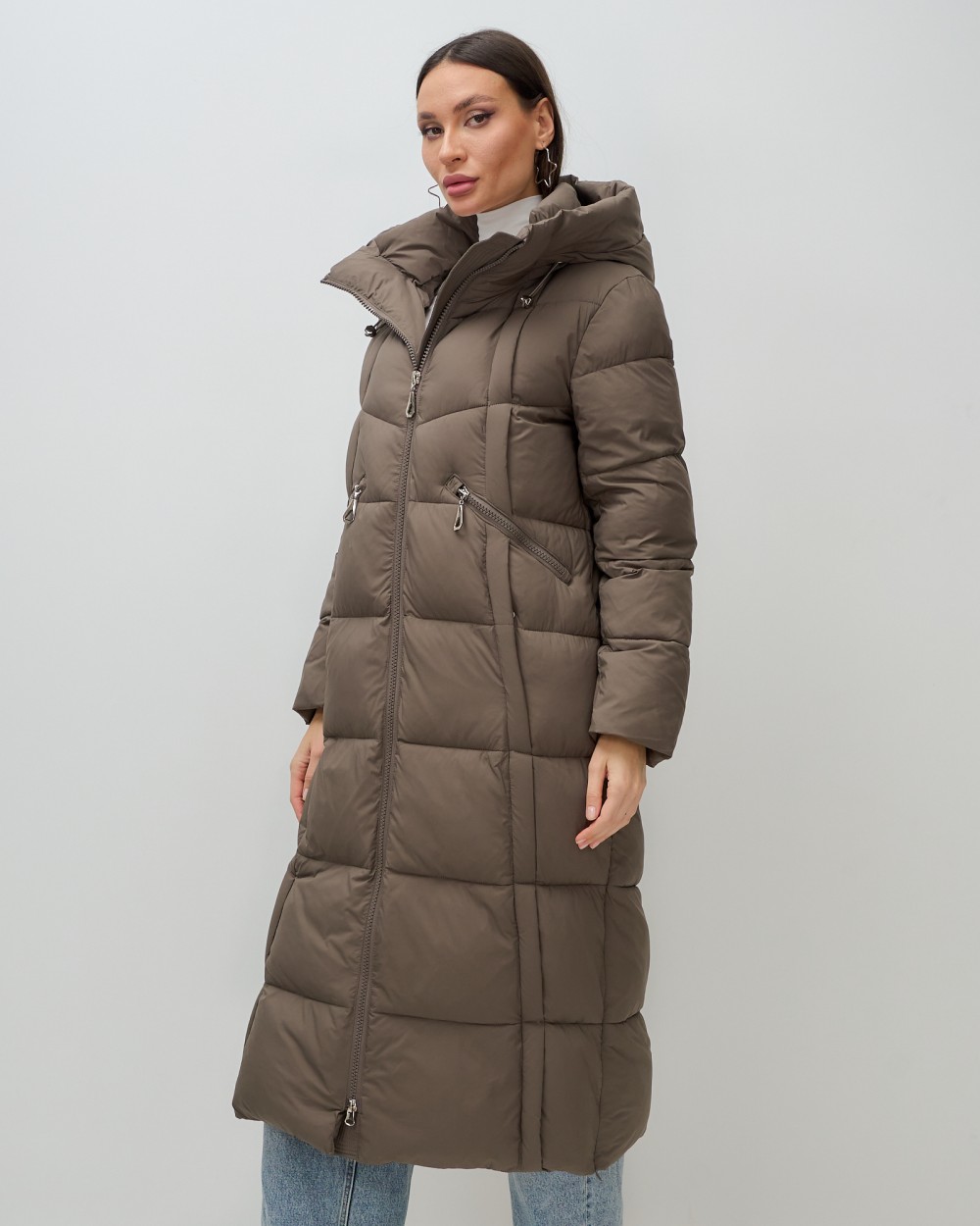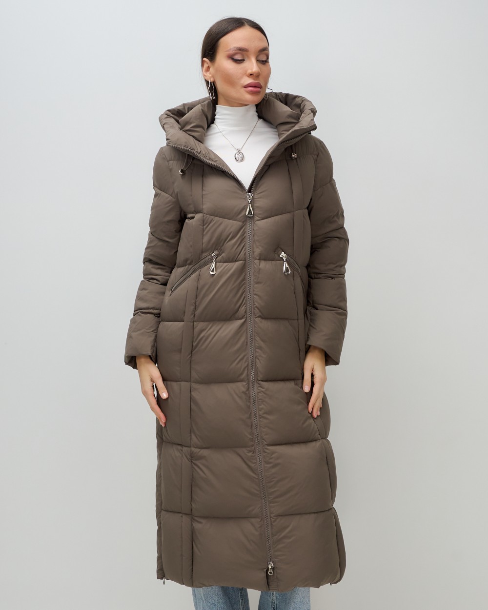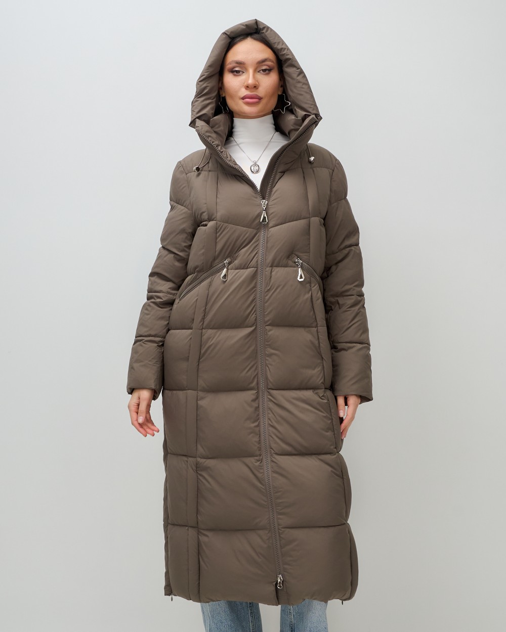 Пальто зимнее утепленное с капюшоном женское светло-коричневого цвета 7729SK