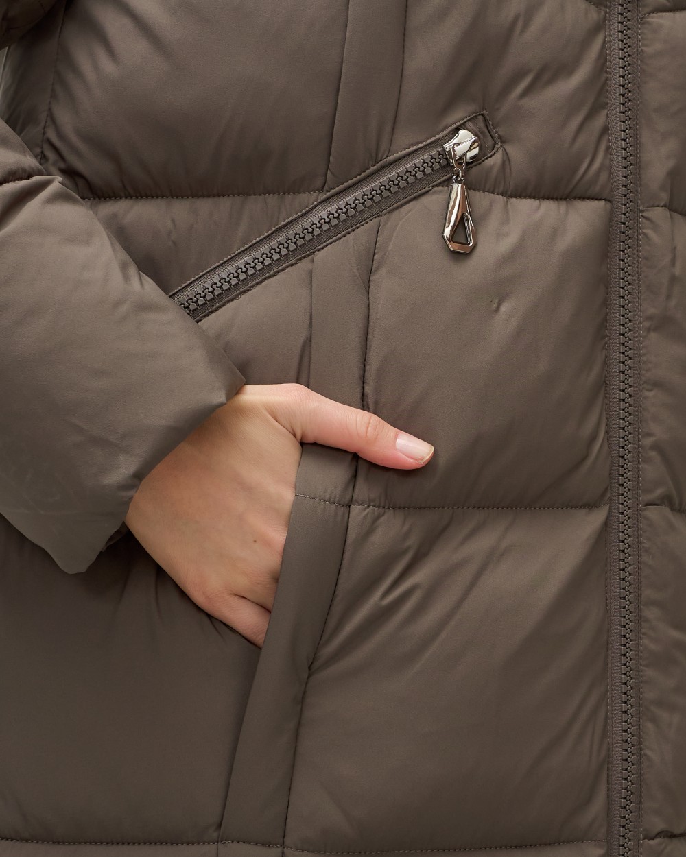 Стильный удлиненный крой ниже колена и свободный покрой делают это пальто универсальным для любого образа — от офисного до повседневного. Не съемный капюшон с фиксатором и стойка воротника защищают от ветра, а внутренние карманы с застежками обеспечивают удобство в использовании.