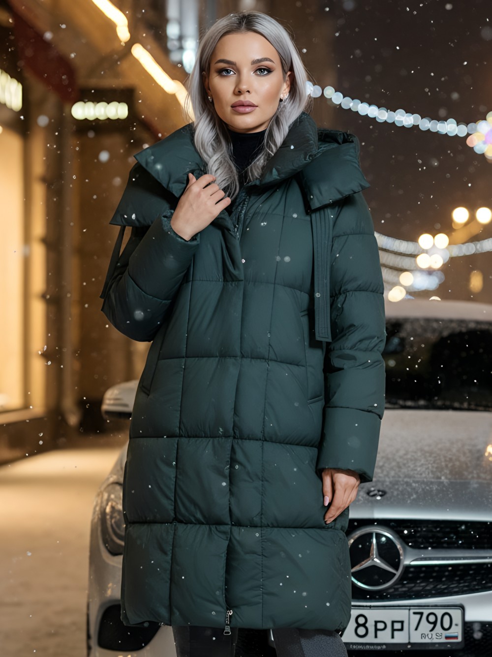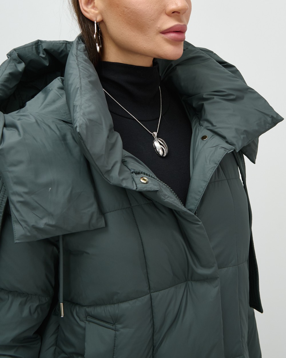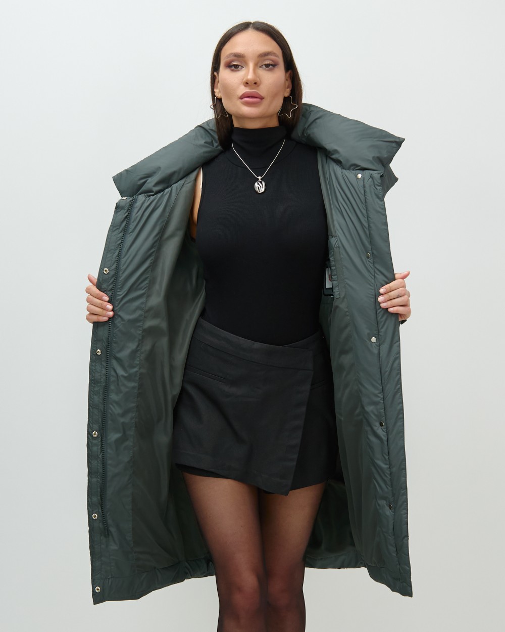 Элегантный широкий воротник на магните и удлиненная длина до колена создают утонченный силуэт, который подходит как для офисных будней, так и для повседневных выходов. Съемный капюшон и внутренние карманы добавляют функциональности, а двойная молния, кнопки и магнитная застежка подчеркивают современный стиль.