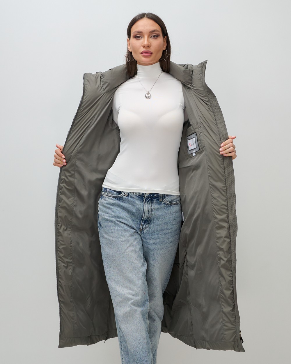 Стильный удлиненный крой ниже колена и свободный покрой делают это пальто универсальным для любого образа — от офисного до повседневного. Не съемный капюшон с фиксатором и стойка воротника защищают от ветра, а внутренние карманы с застежками обеспечивают удобство в использовании.