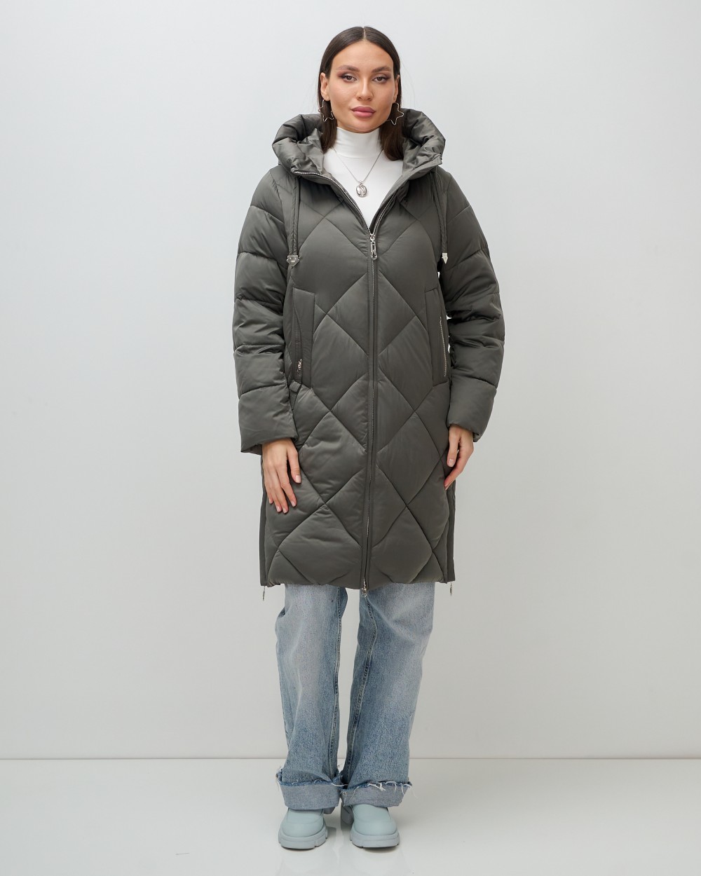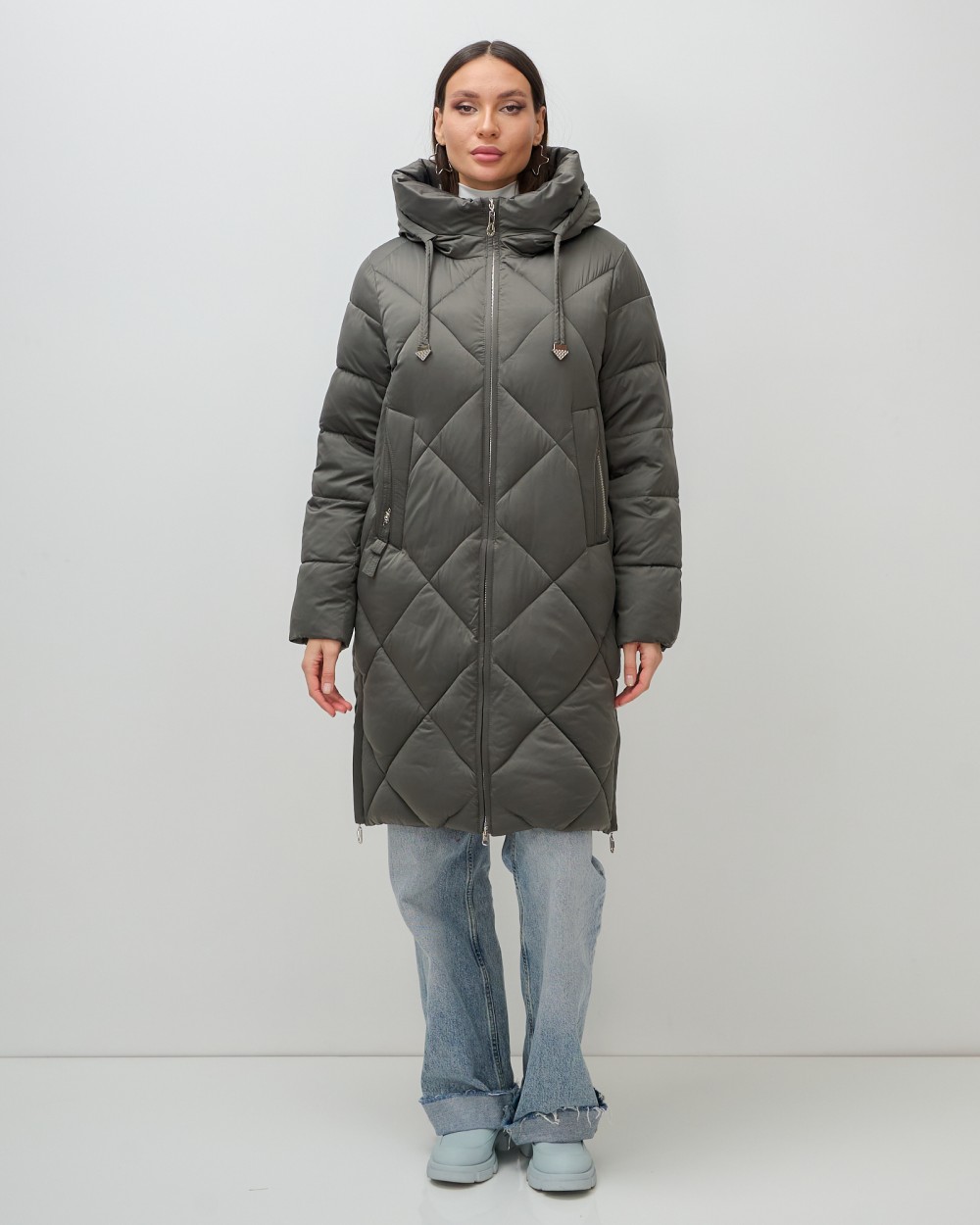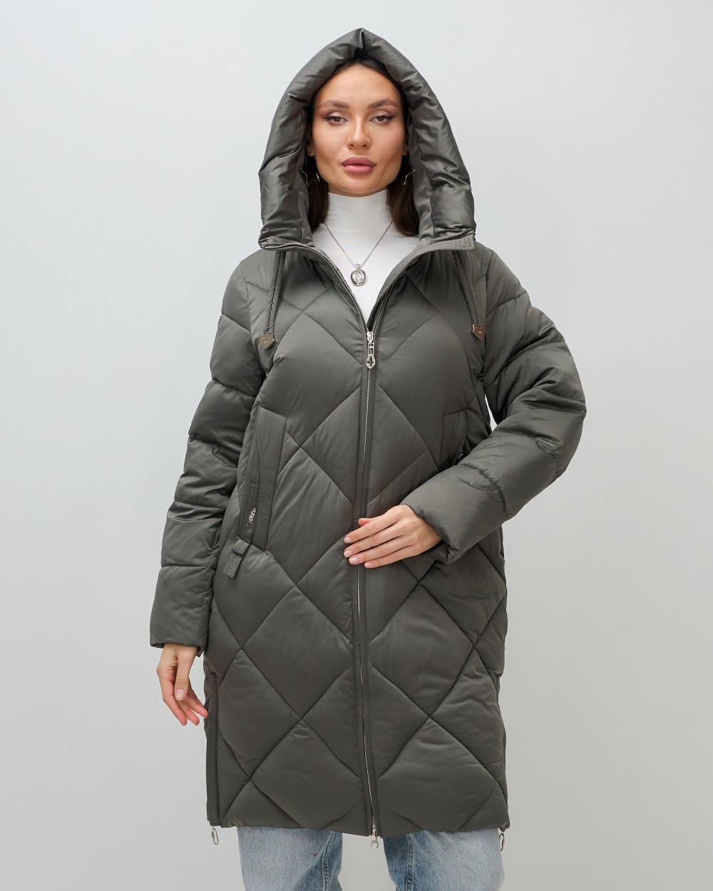 Пальто зимнее утепленное с капюшоном женское зеленого цвета 7637Z — Visdeer