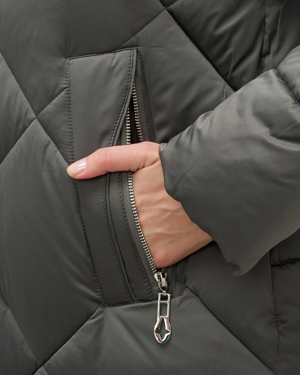 - Тип кармана: Прорезной (на кнопке и молнии)
