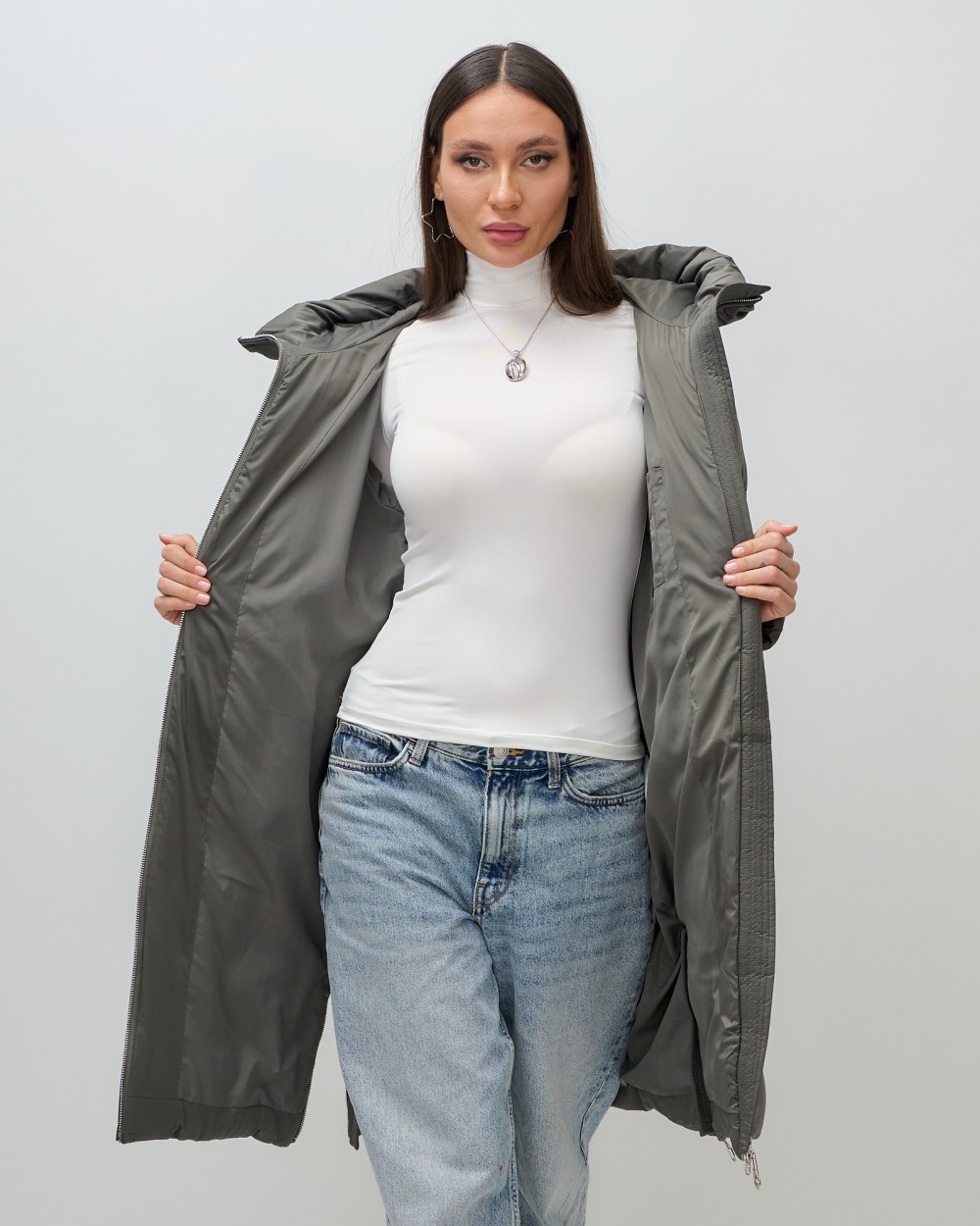 Длина до колена и удлиненный подол придают пальто элегантный и стильный вид, идеально подходя как для офисных будней, так и для повседневных прогулок. Удобный капюшон с фиксатором и внутренние карманы сделают использование пальто еще более комфортным. Двойная молния и прорезные карманы на кнопке добавляют функциональности и современного стиля.