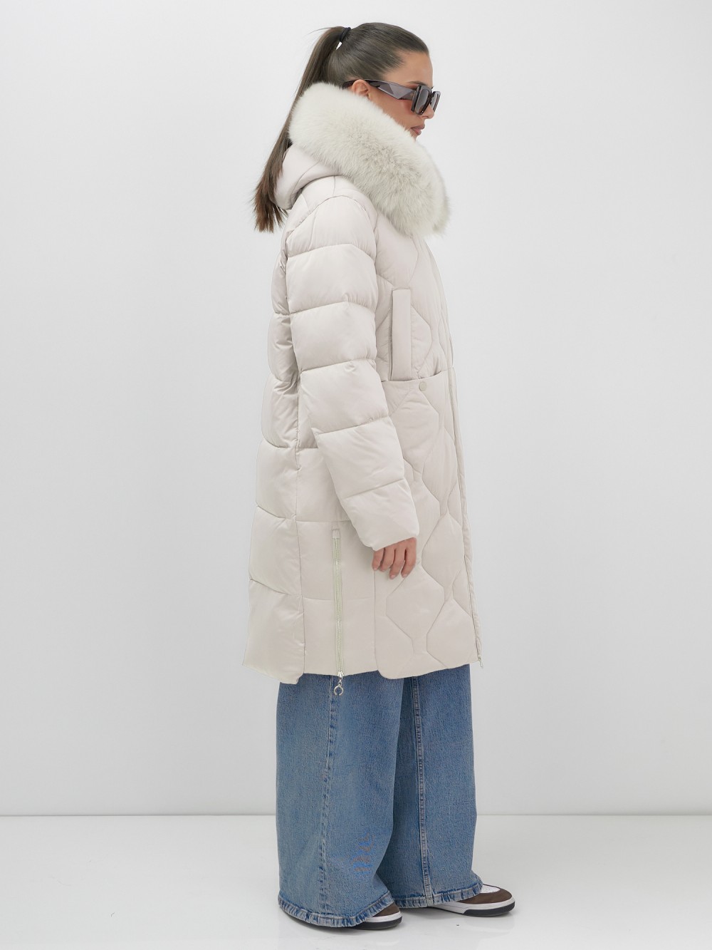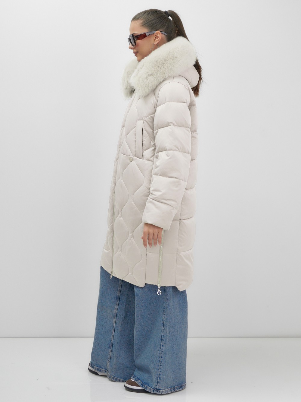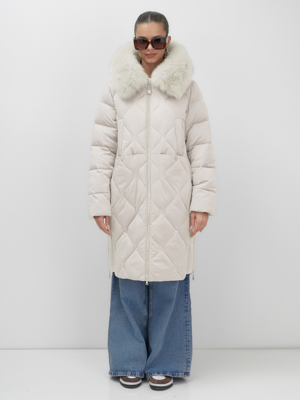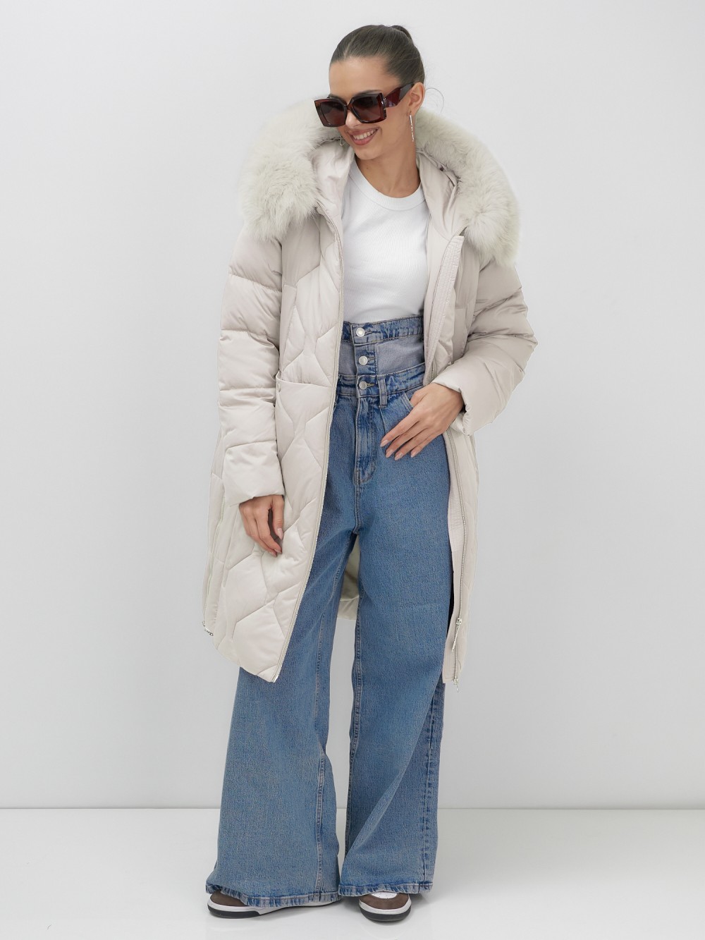Пальто зимнее утепленное с мехом и капюшоном тренд бежевого цвета 7753B — Visdeer
