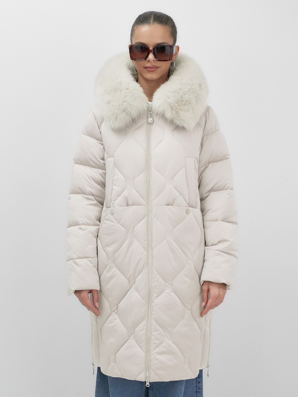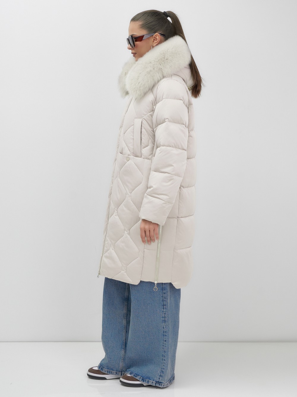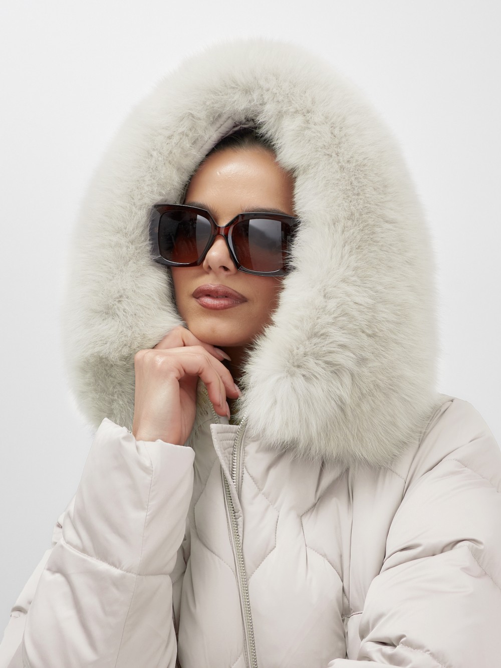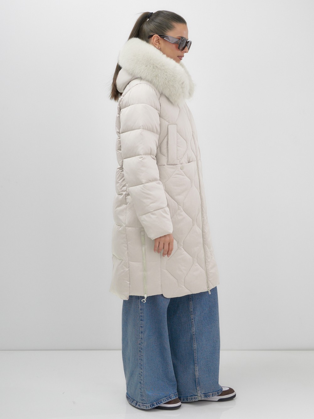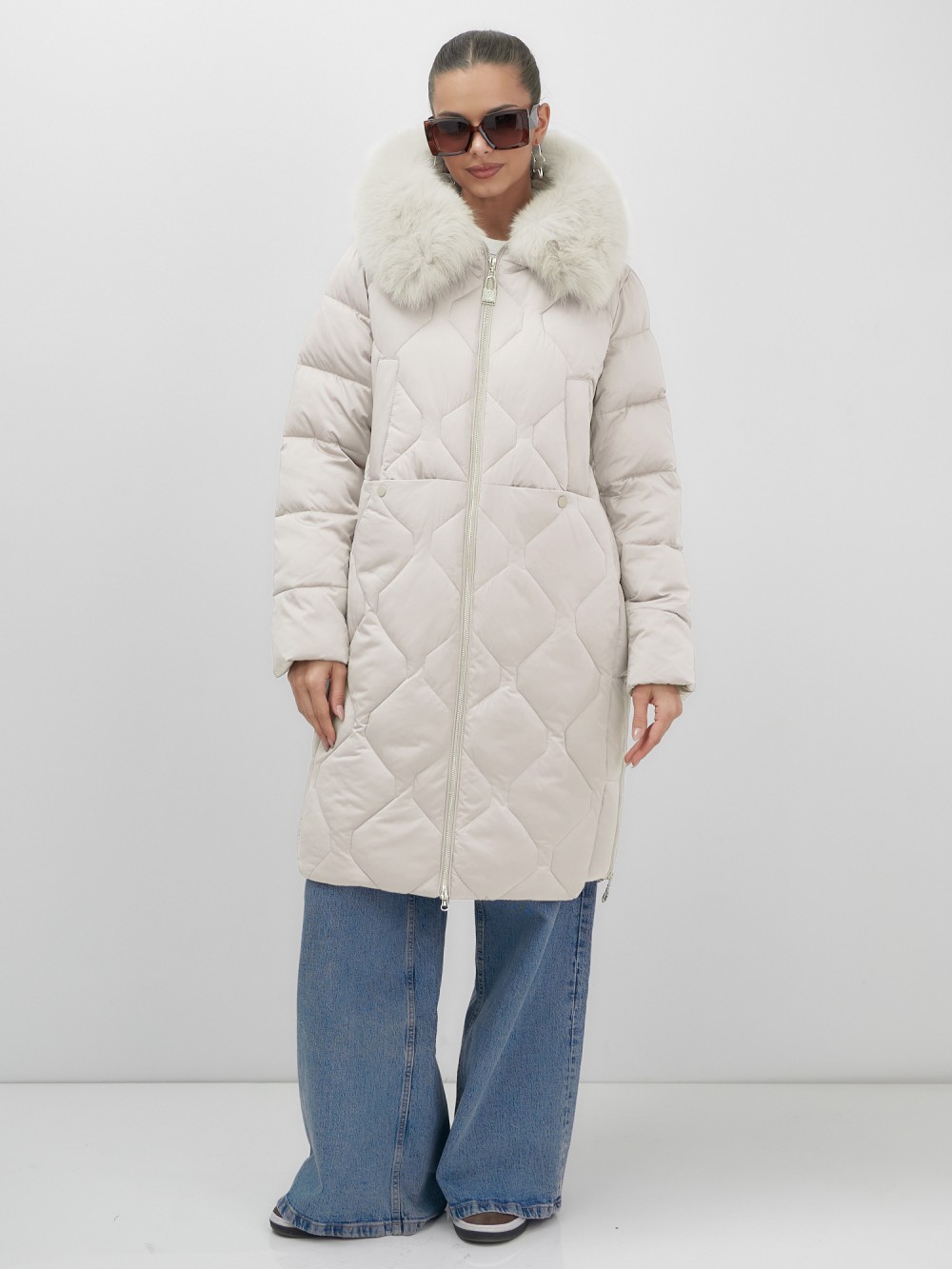 Пальто зимнее утепленное с мехом и капюшоном тренд бежевого цвета 7753B — Visdeer