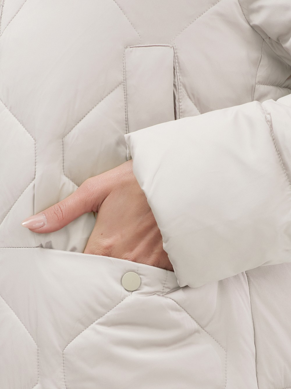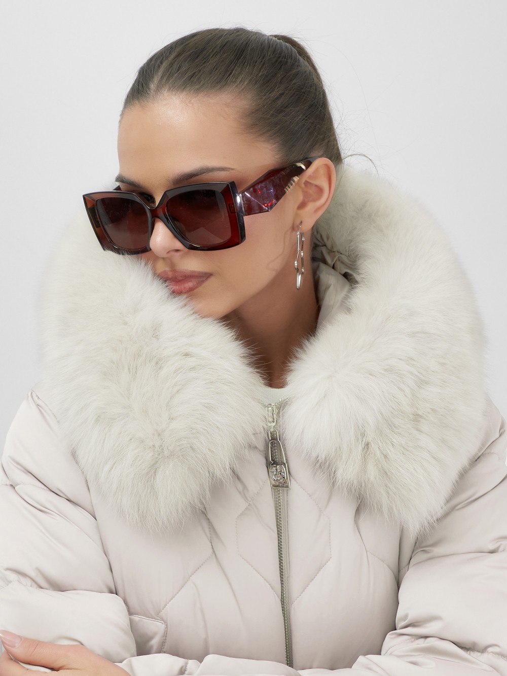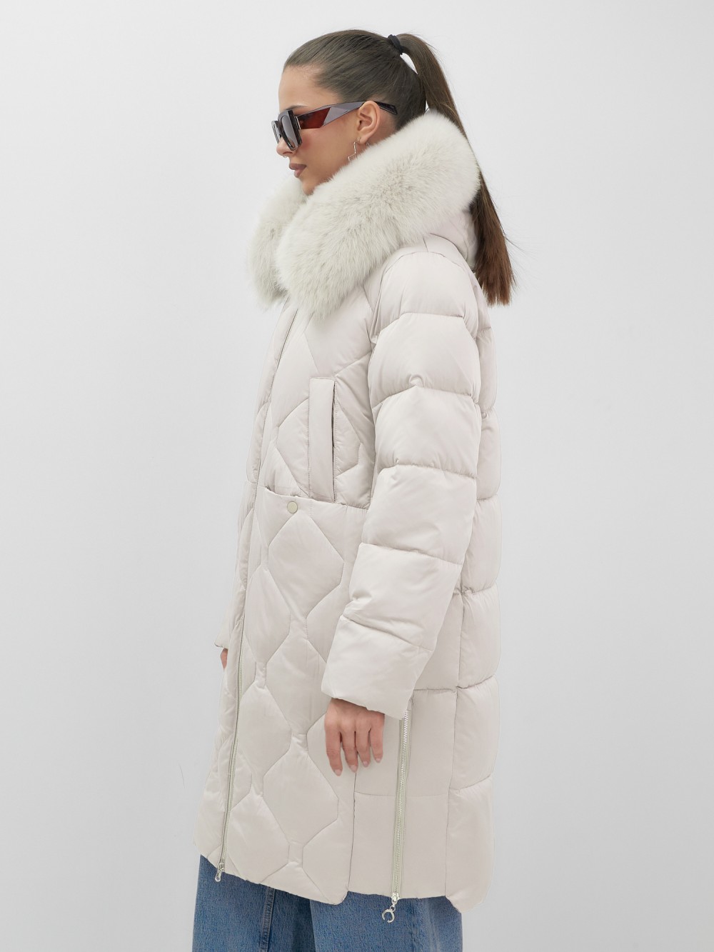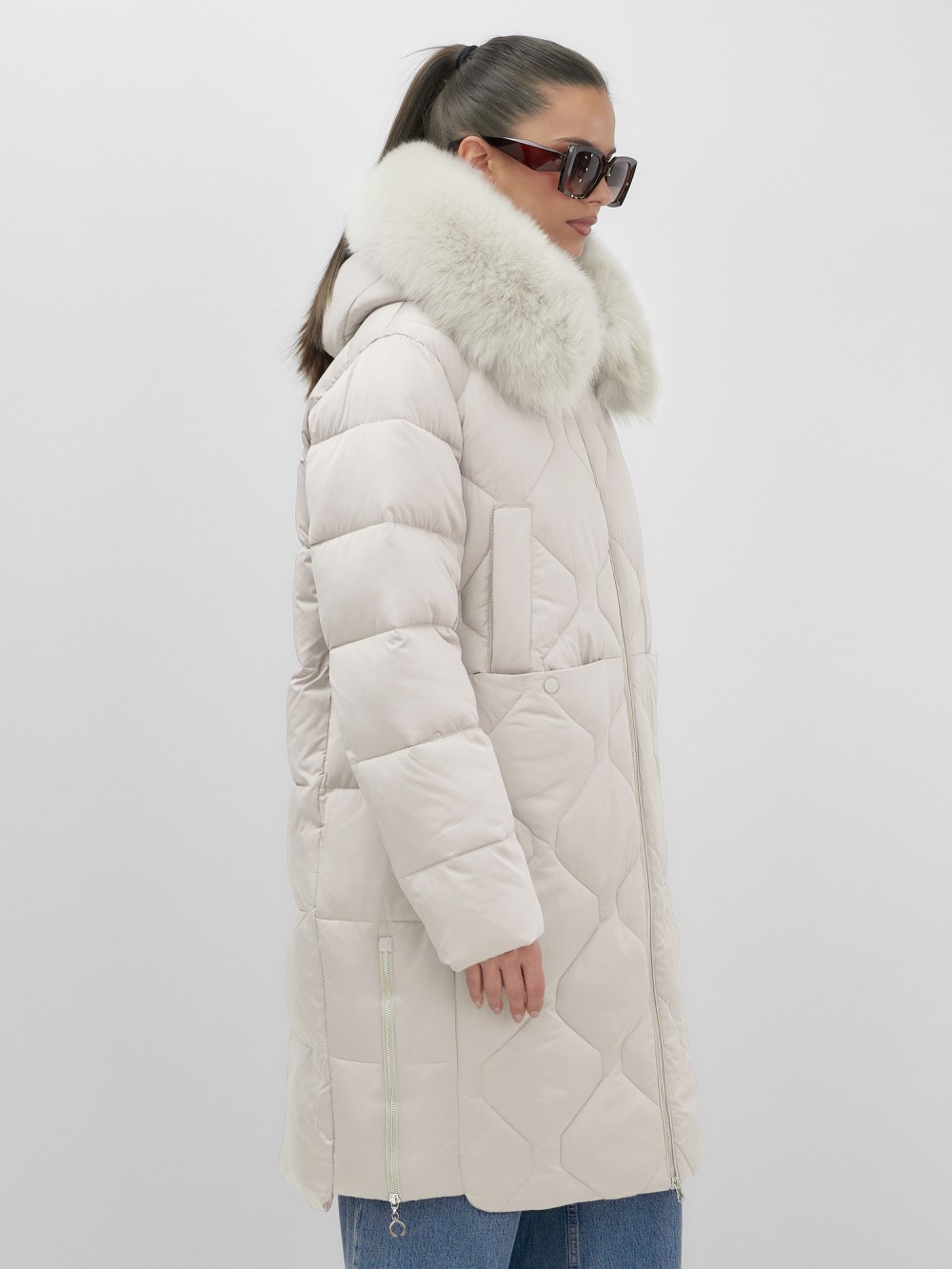 Пальто зимнее утепленное с мехом и капюшоном тренд бежевого цвета 7753B — Visdeer