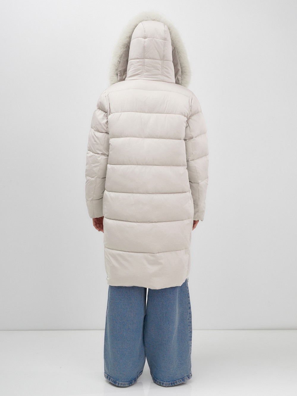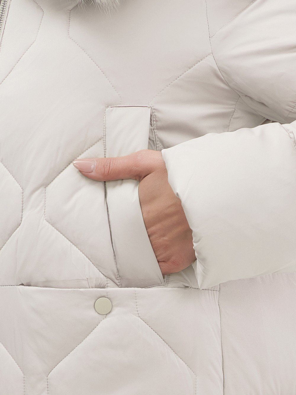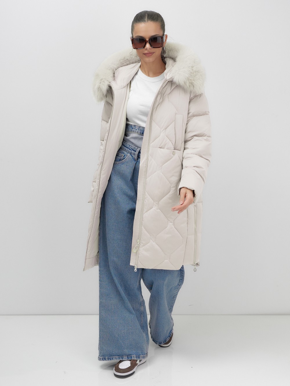 Пальто зимнее утепленное с мехом и капюшоном тренд бежевого цвета 7753B
