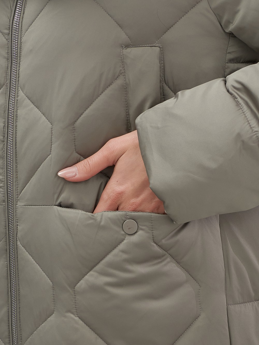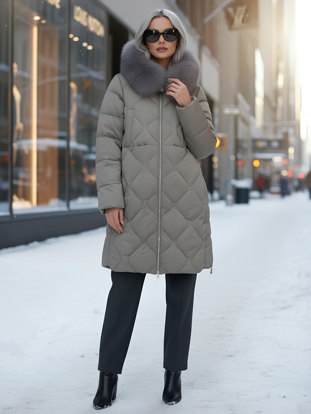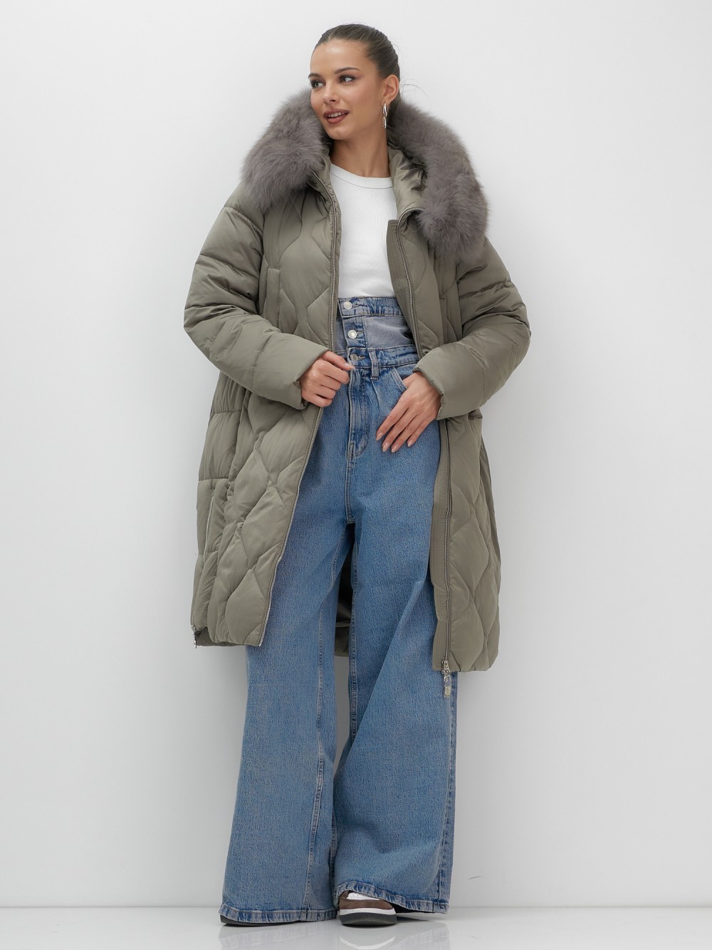 Пять благородных оттенков коллекции осень-зима 2025 – глубокий черный, роскошный коричневый, изысканный светло-коричневый, элегантный темно-коричневый и благородный темно-зеленый – великолепно сочетаются с натуральным мехом песца. Удлиненный силуэт до колена и свободный крой идеальны для размеров 48-56.