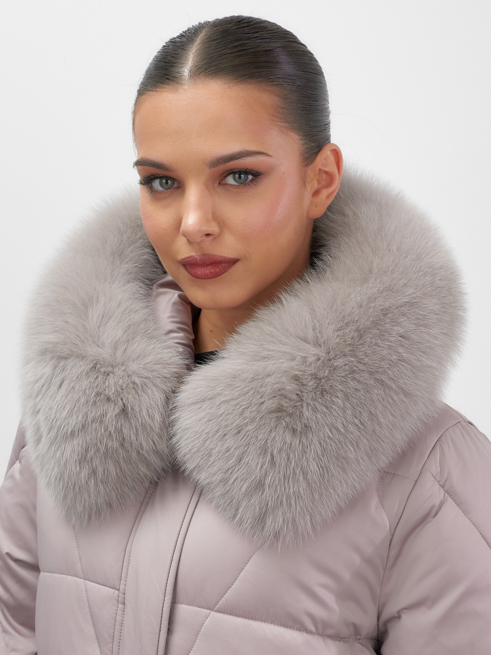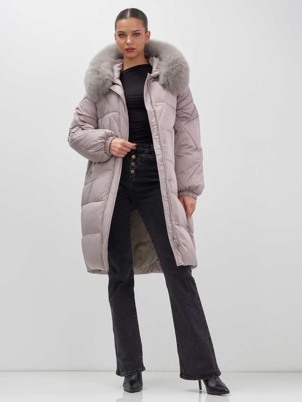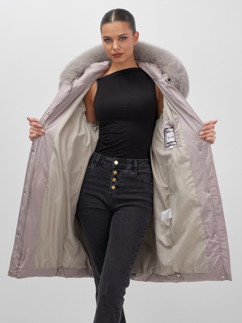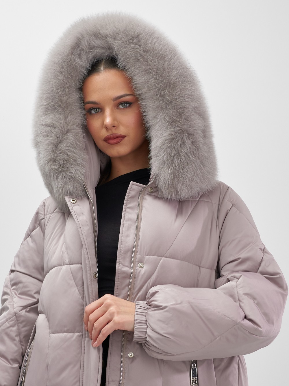 Непревзойденное качество исполнения: двойная молния с защитным клапаном на кнопках, инновационная система фиксаторов на капюшоне и по низу изделия, утягивающий силуэт для безупречной посадки. Изысканная съемная опушка из натурального песца создает роскошный образ. Первоклассное качество меха – символ престижа.