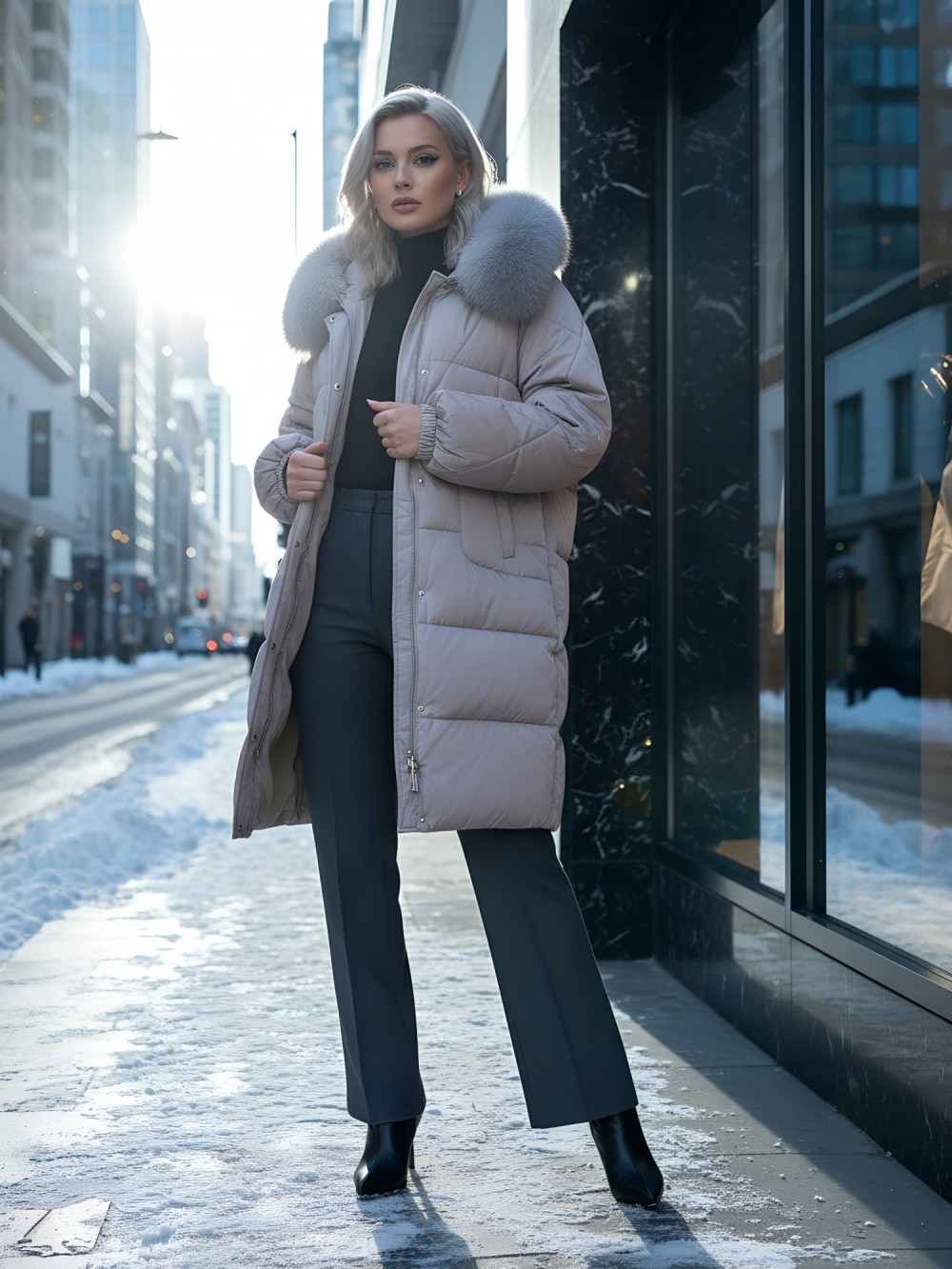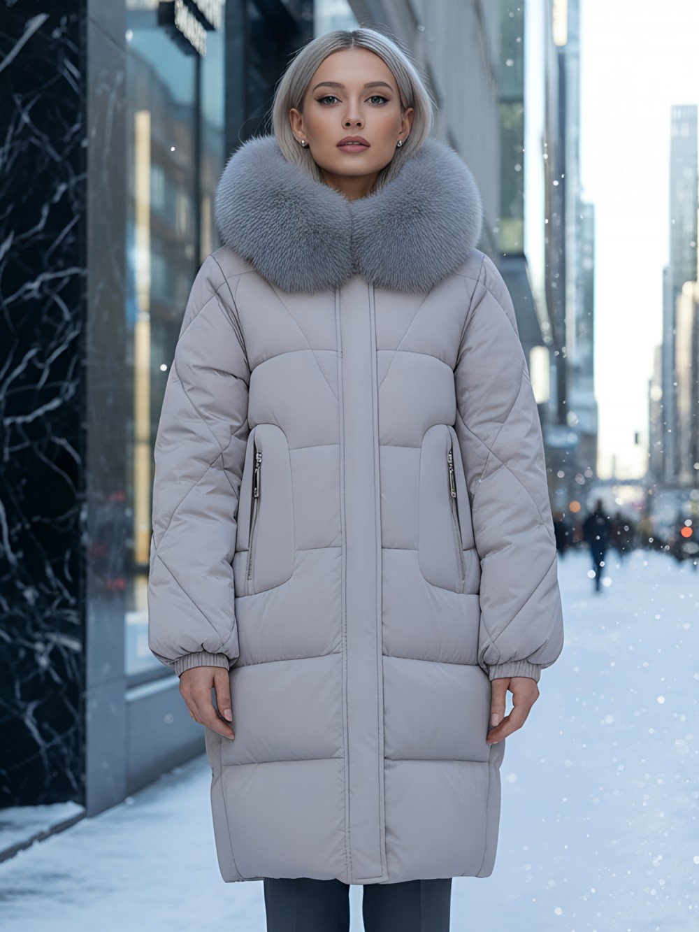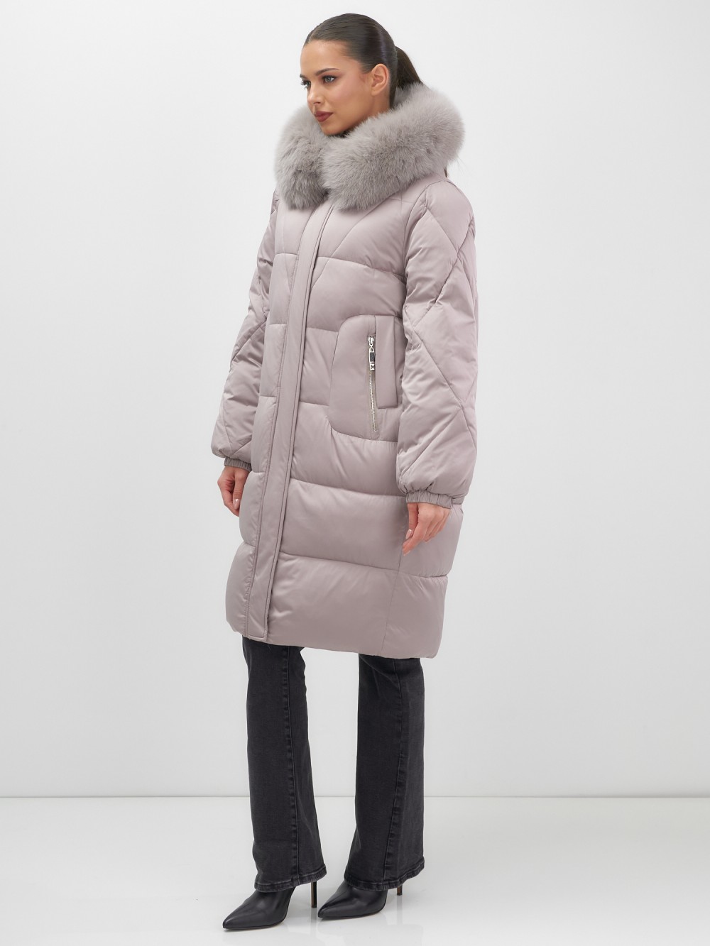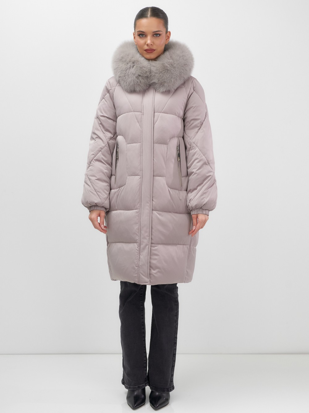 Непревзойденное качество исполнения: двойная молния с защитным клапаном на кнопках, инновационная система фиксаторов на капюшоне и по низу изделия, утягивающий силуэт для безупречной посадки. Изысканная съемная опушка из натурального песца создает роскошный образ. Первоклассное качество меха – символ престижа.