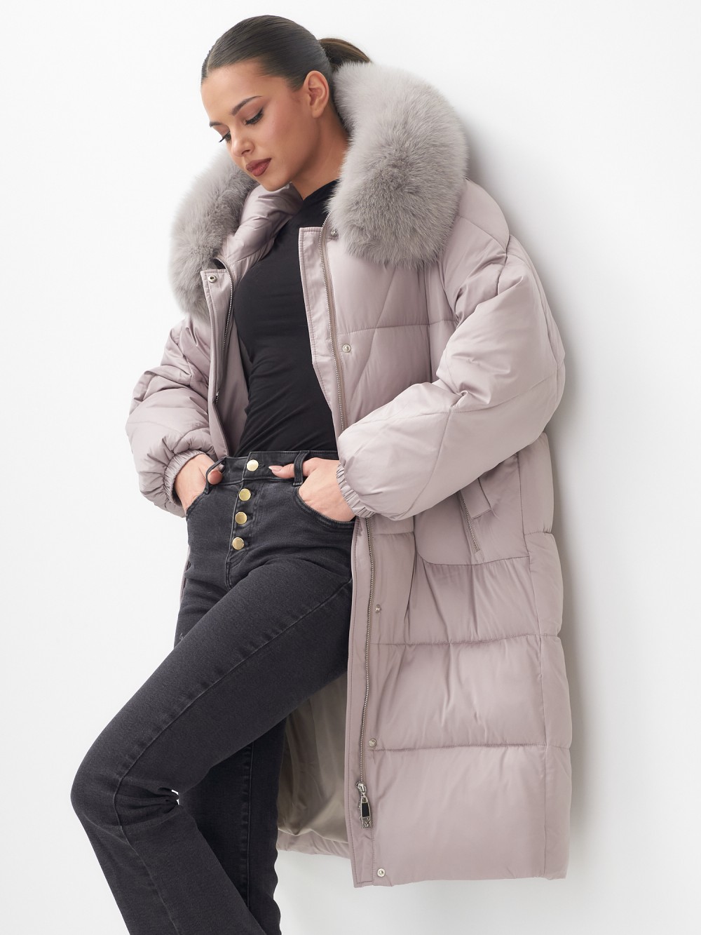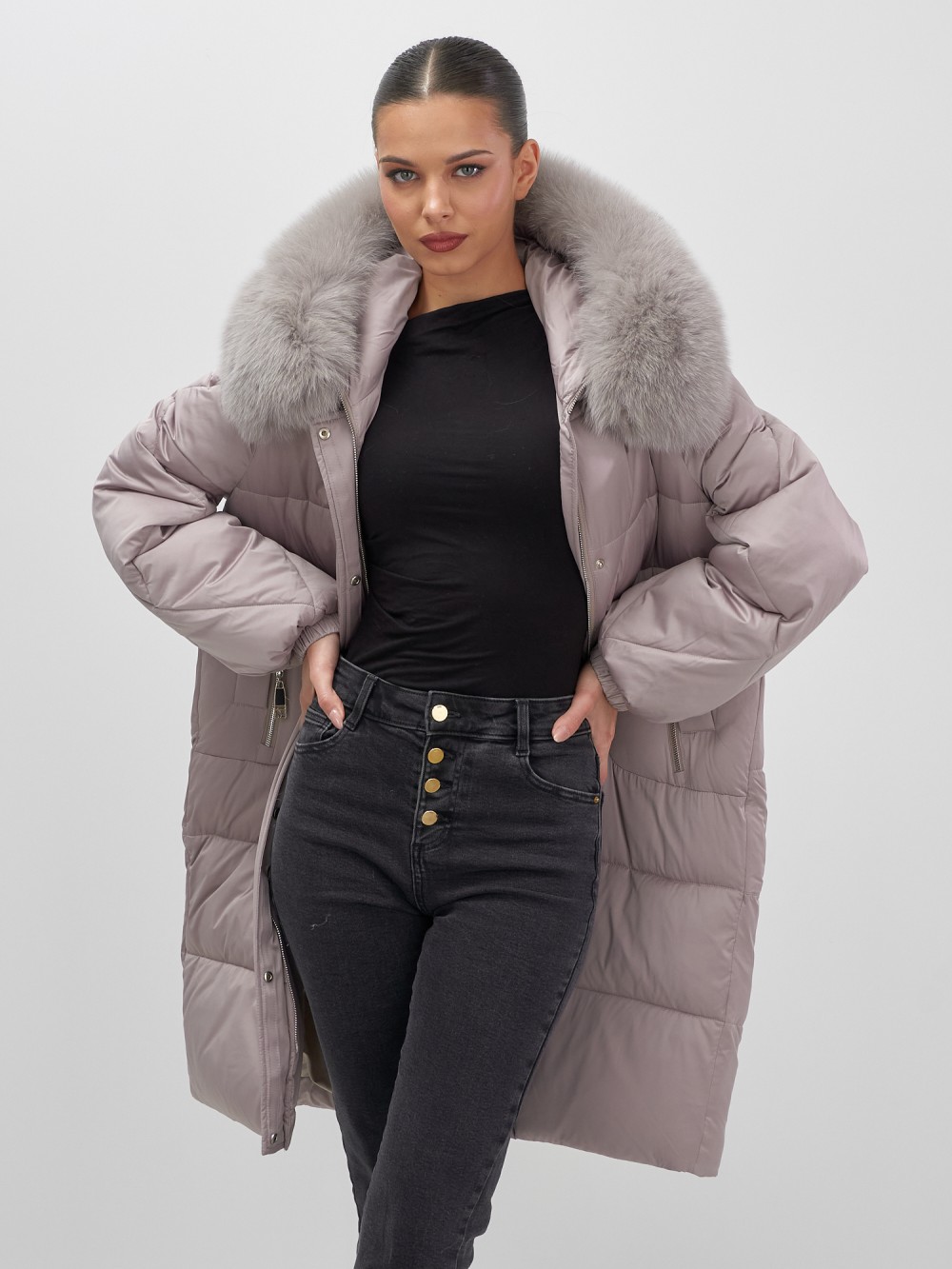 Четыре благородных оттенка коллекции осень-зима 2025 – глубокий черный, роскошный коричневый, изысканный светло-коричневый и стильный горчичный – великолепно сочетаются с натуральным мехом песца. Удлиненный силуэт до колена и свободный крой идеальны для размеров 46-54.