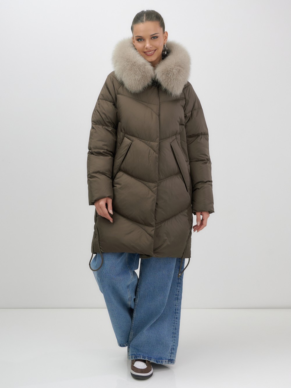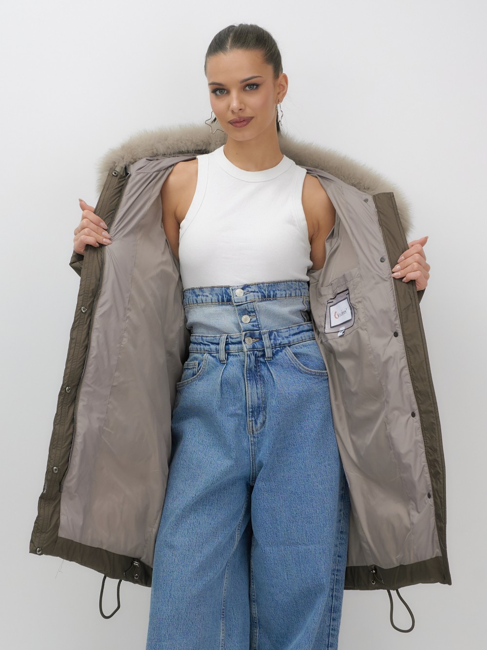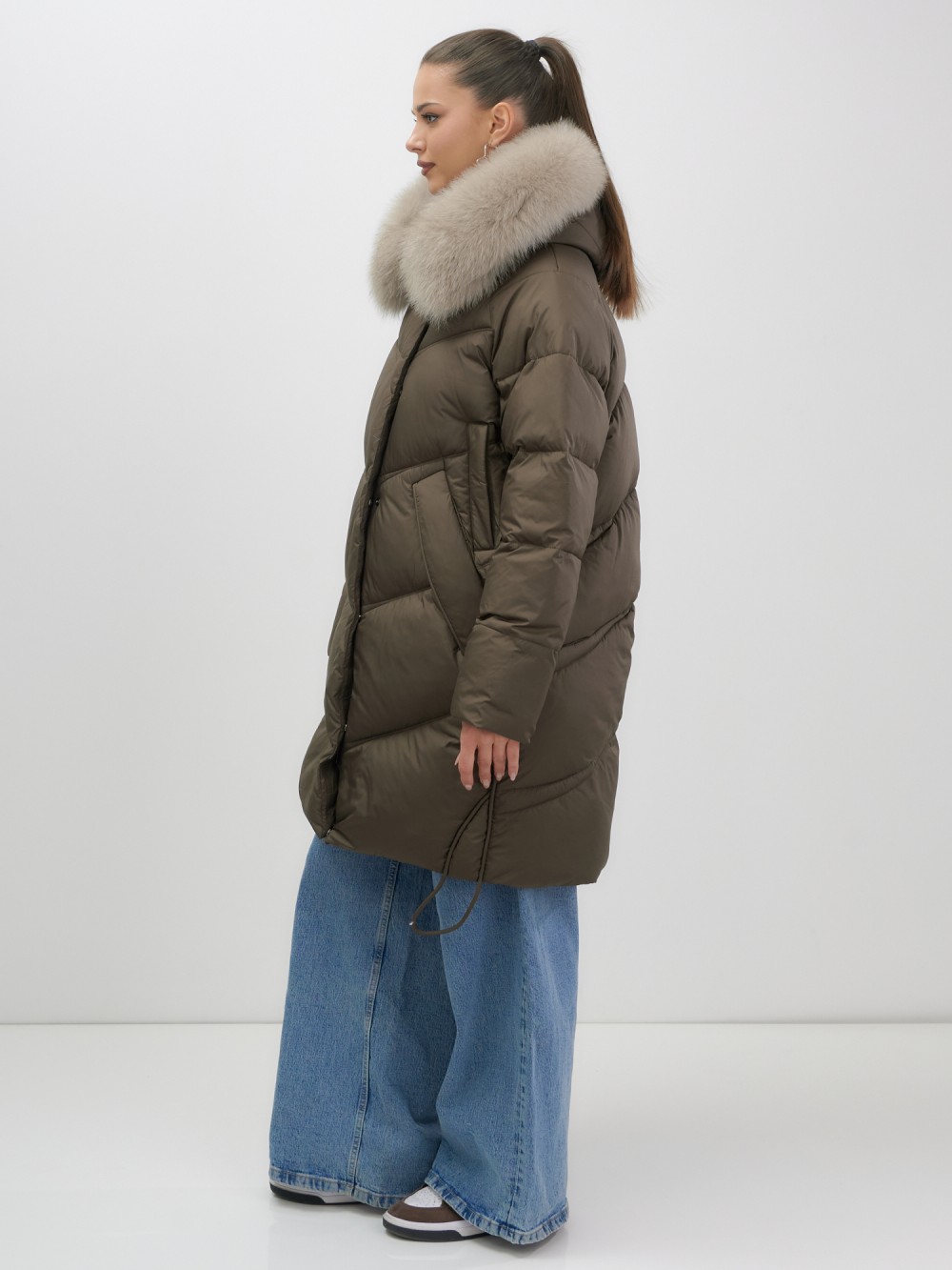 Четыре изысканных оттенка коллекции осень-зима 2025 – благородный черный, элегантный темно-коричневый, утонченный светло-коричневый и стильный хаки – безупречно гармонируют с натуральным мехом песца. Удлиненный силуэт до колена и свободный крой созданы для размеров 46-54.
