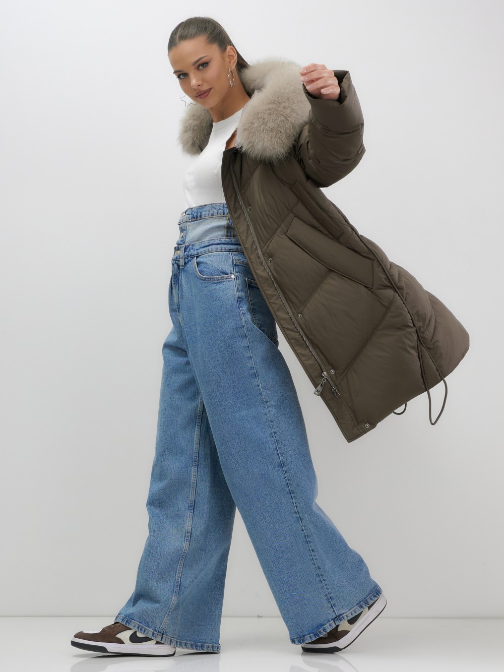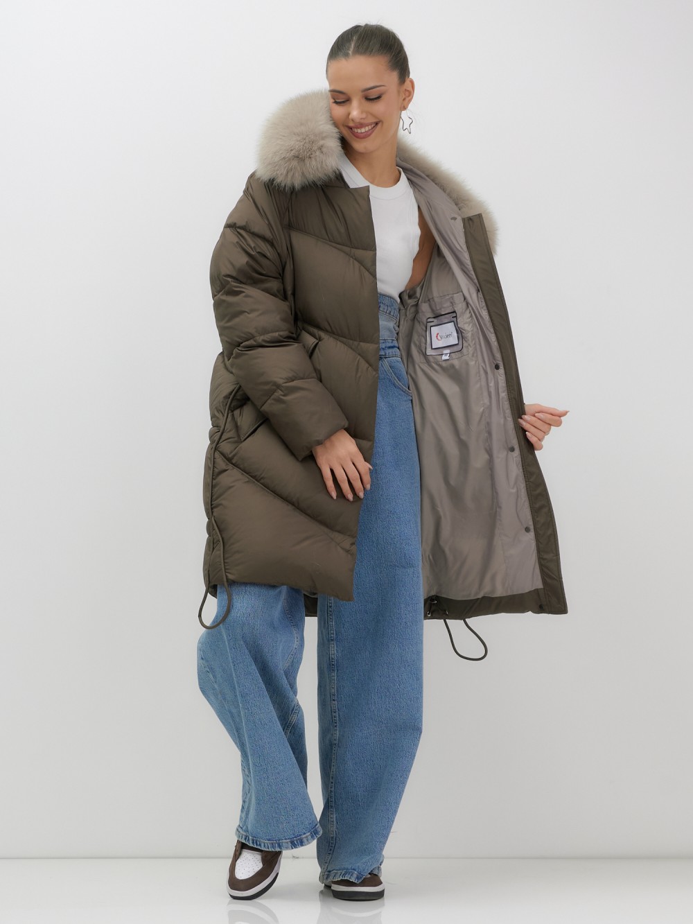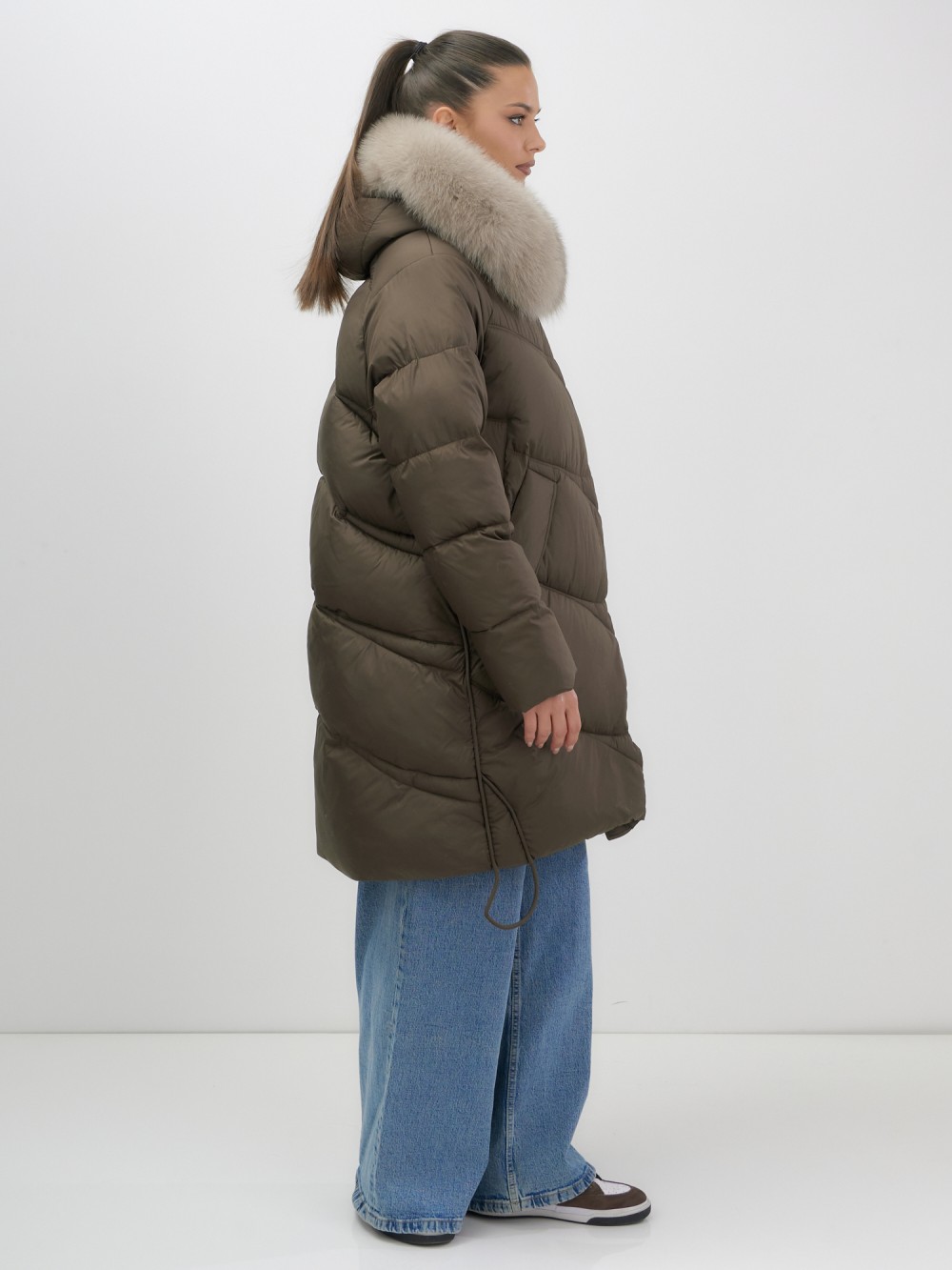 Четыре изысканных оттенка коллекции осень-зима 2025 – благородный черный, элегантный темно-коричневый, утонченный светло-коричневый и стильный хаки – безупречно гармонируют с натуральным мехом песца. Удлиненный силуэт до колена и свободный крой созданы для размеров 46-54.