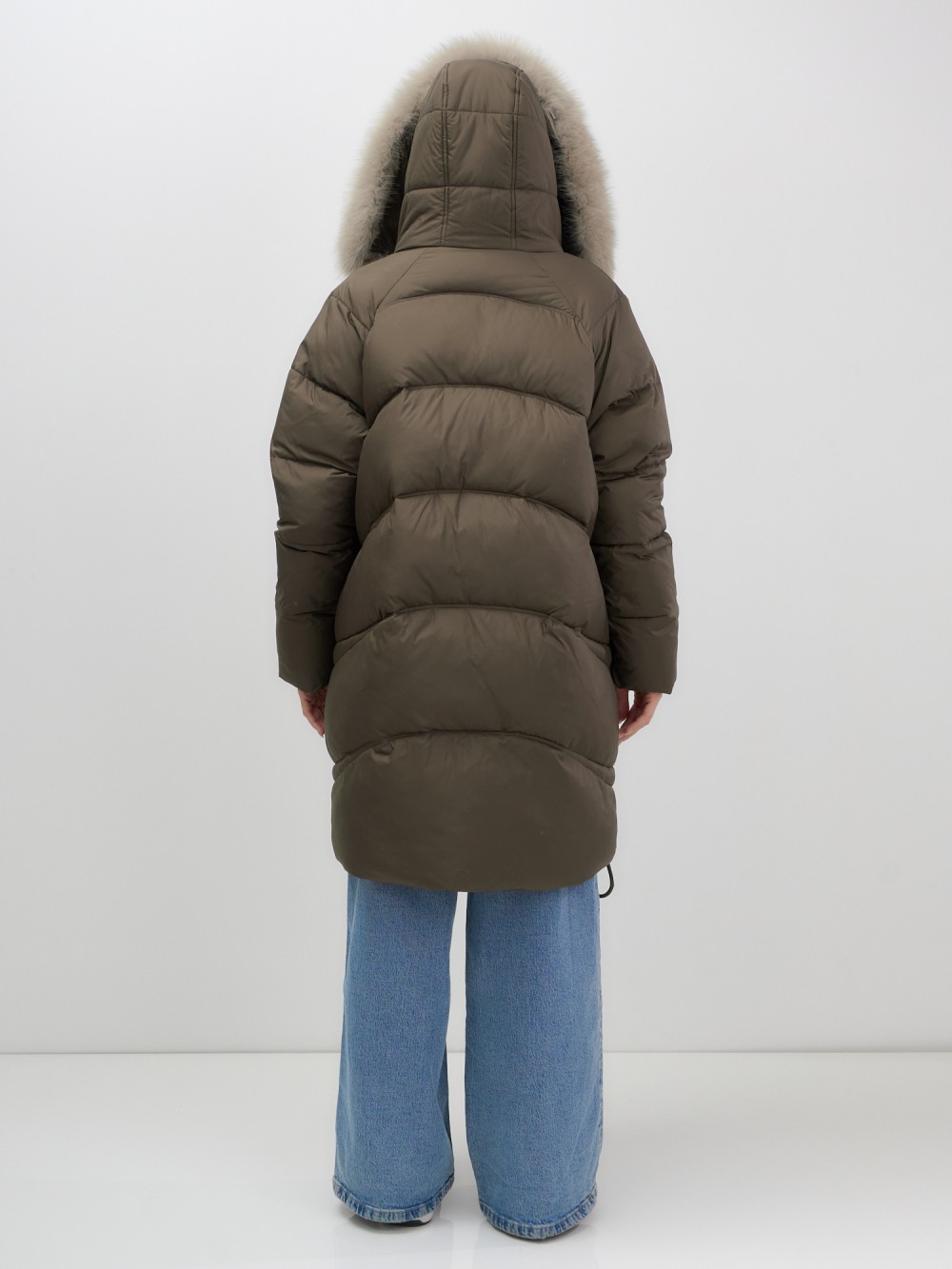 Безупречное качество каждого элемента: двойная молния под защитным клапаном, регулируемые фиксаторы на капюшоне и по низу изделия, утягивающий силуэт для идеальной посадки. Роскошная съемная опушка из натурального песца создает неповторимый образ. Первоклассное качество меха подчеркивает премиальность модели.