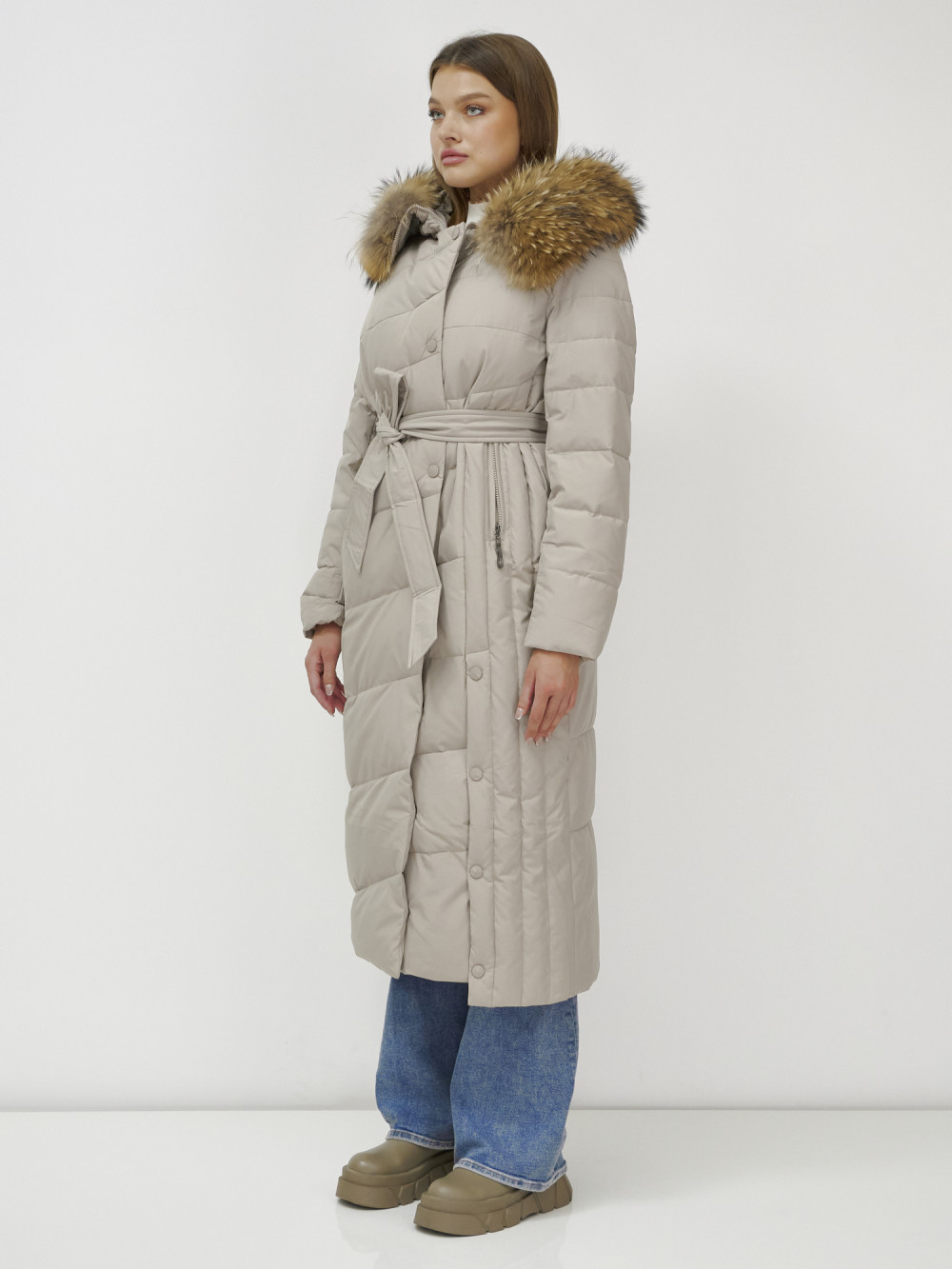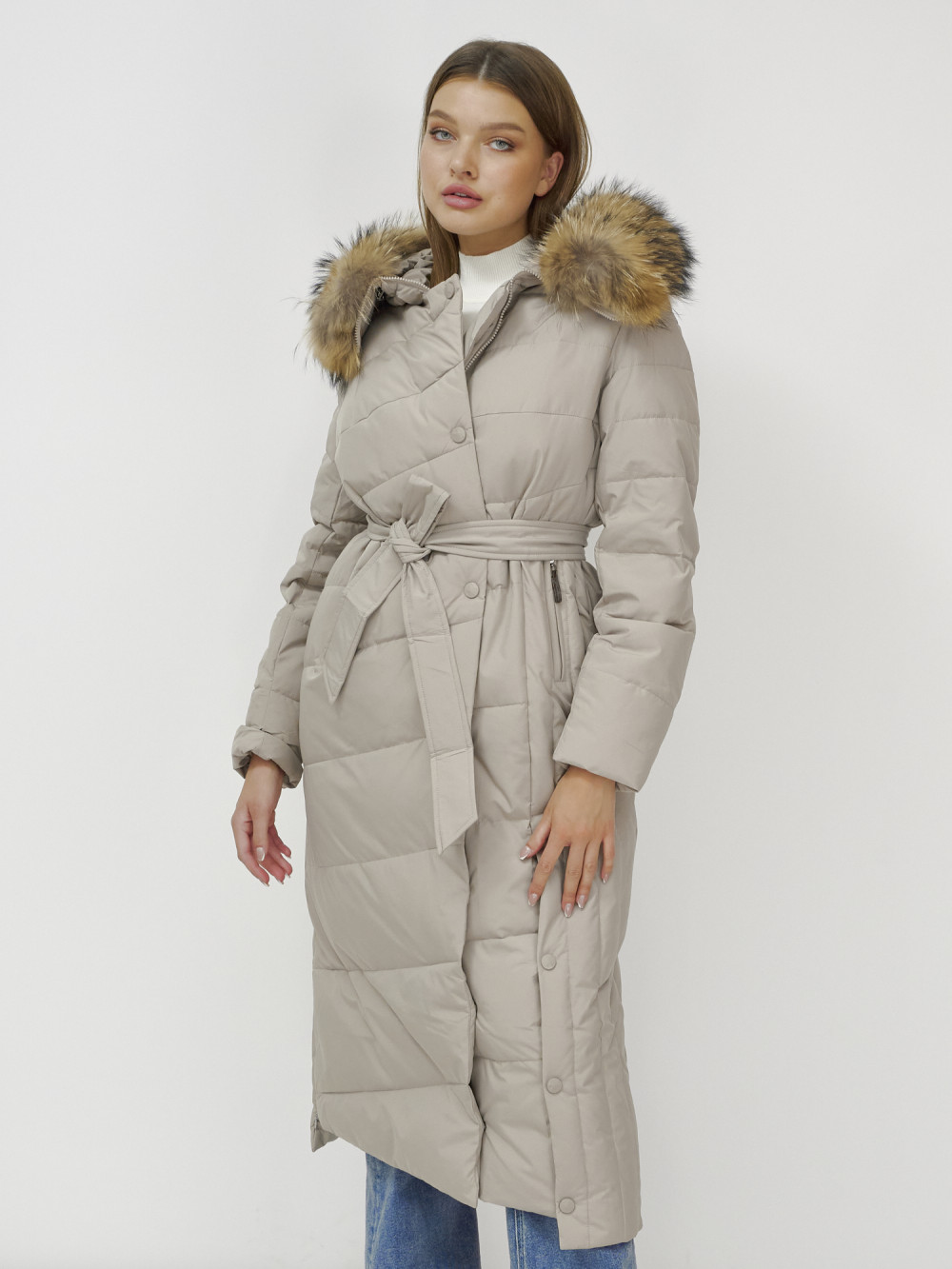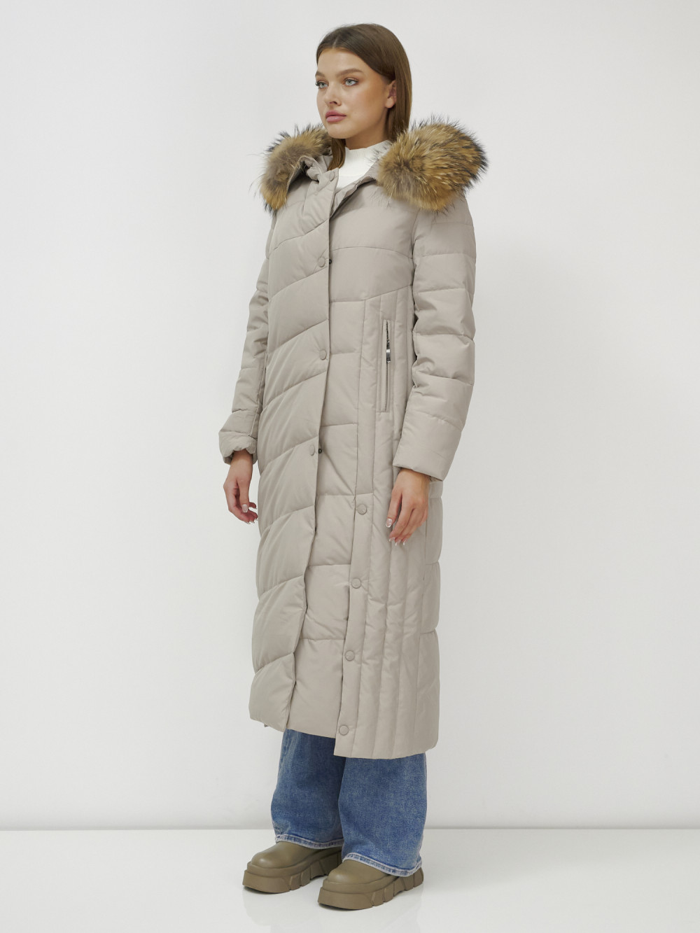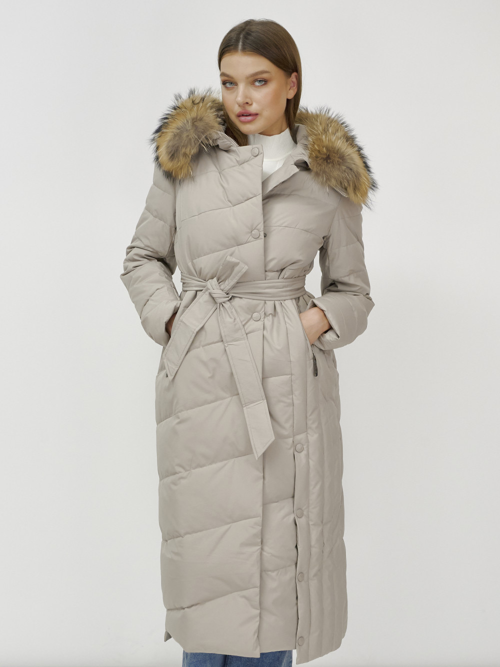 Пальто зимнее женское с мехом енот премиум класса бежевого цвета 3335B