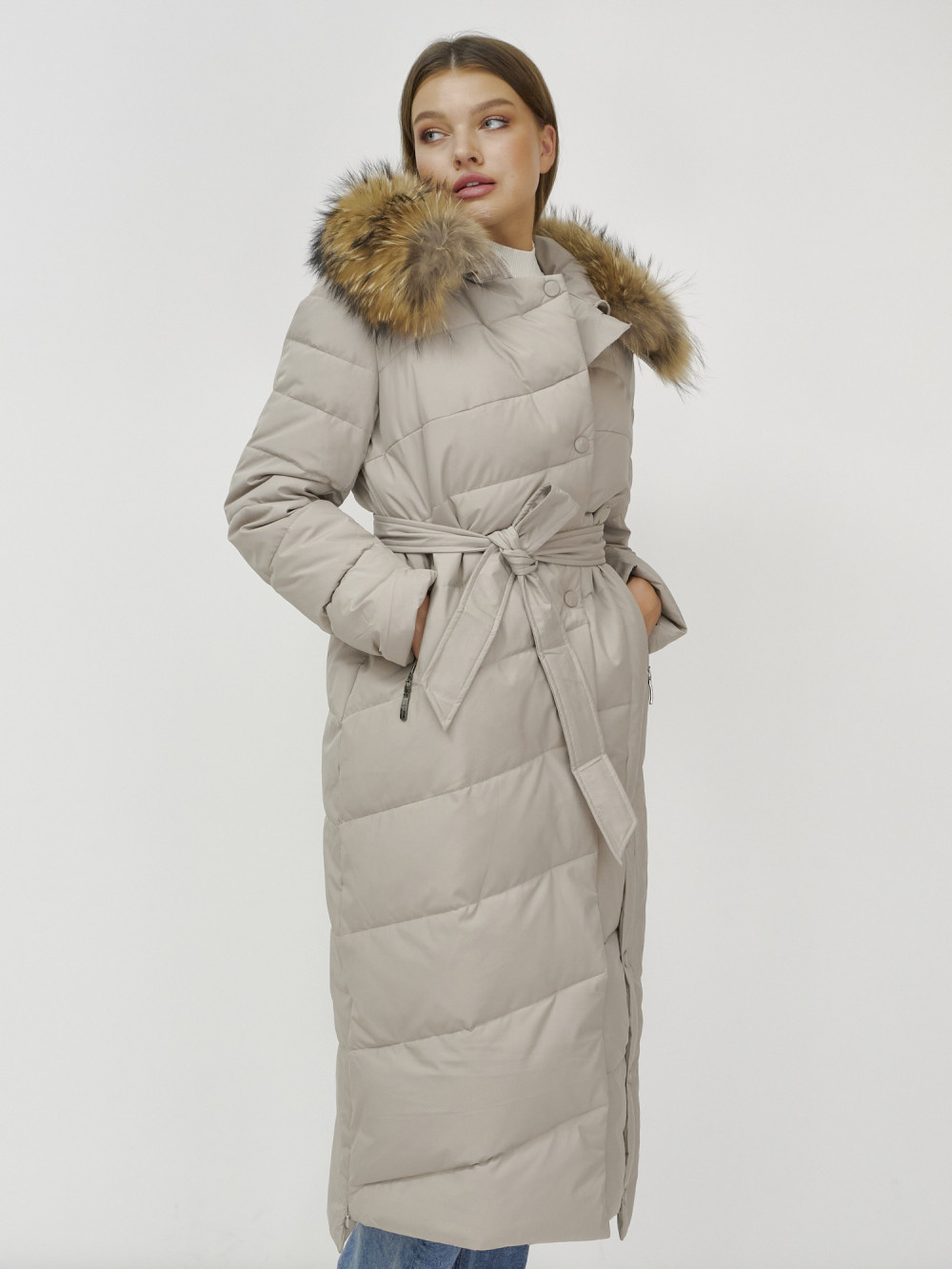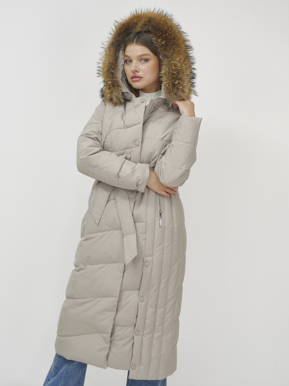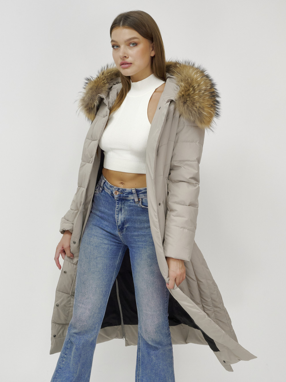 Пальто зимнее женское с мехом енот премиум класса бежевого цвета 3335B