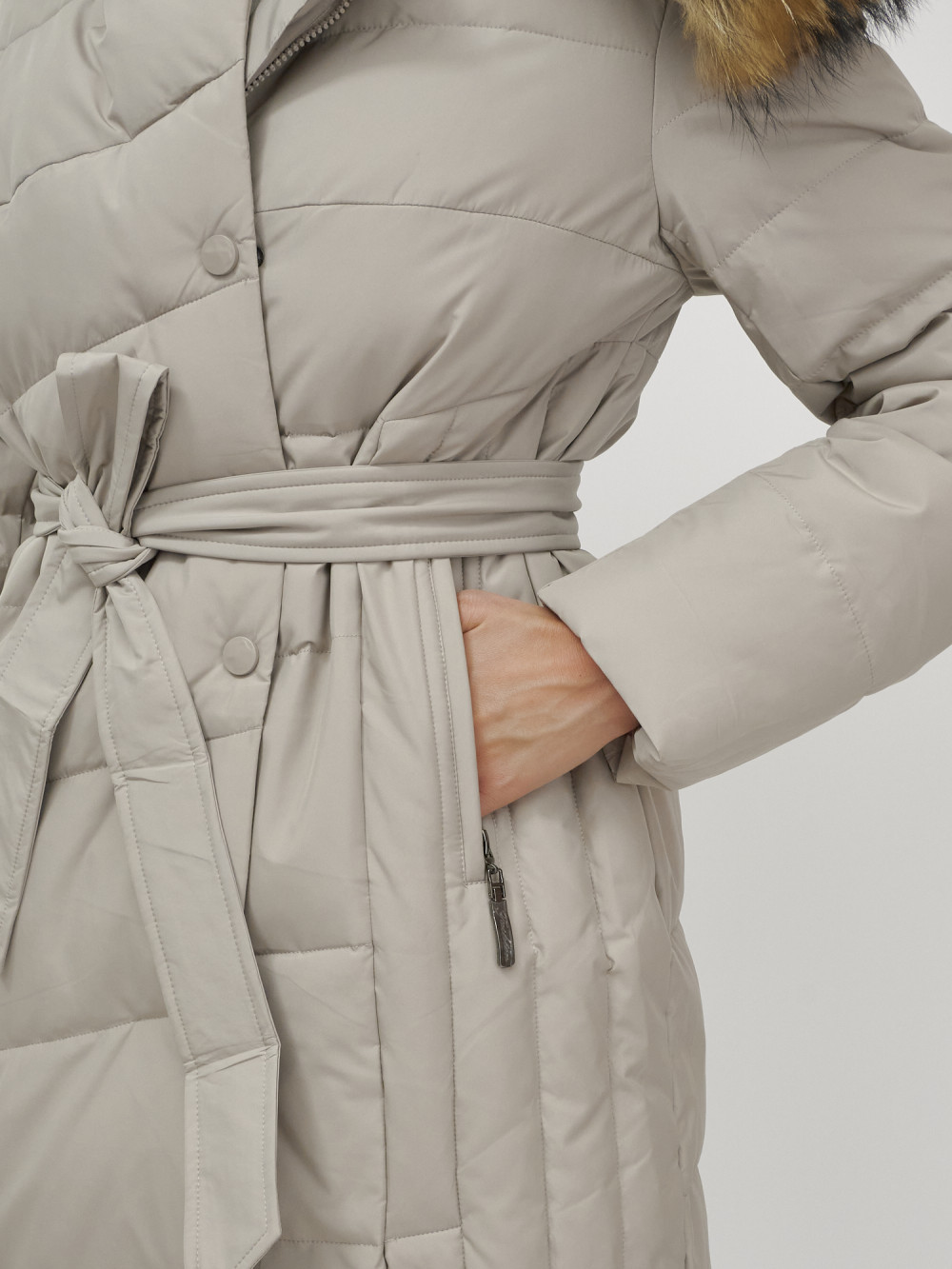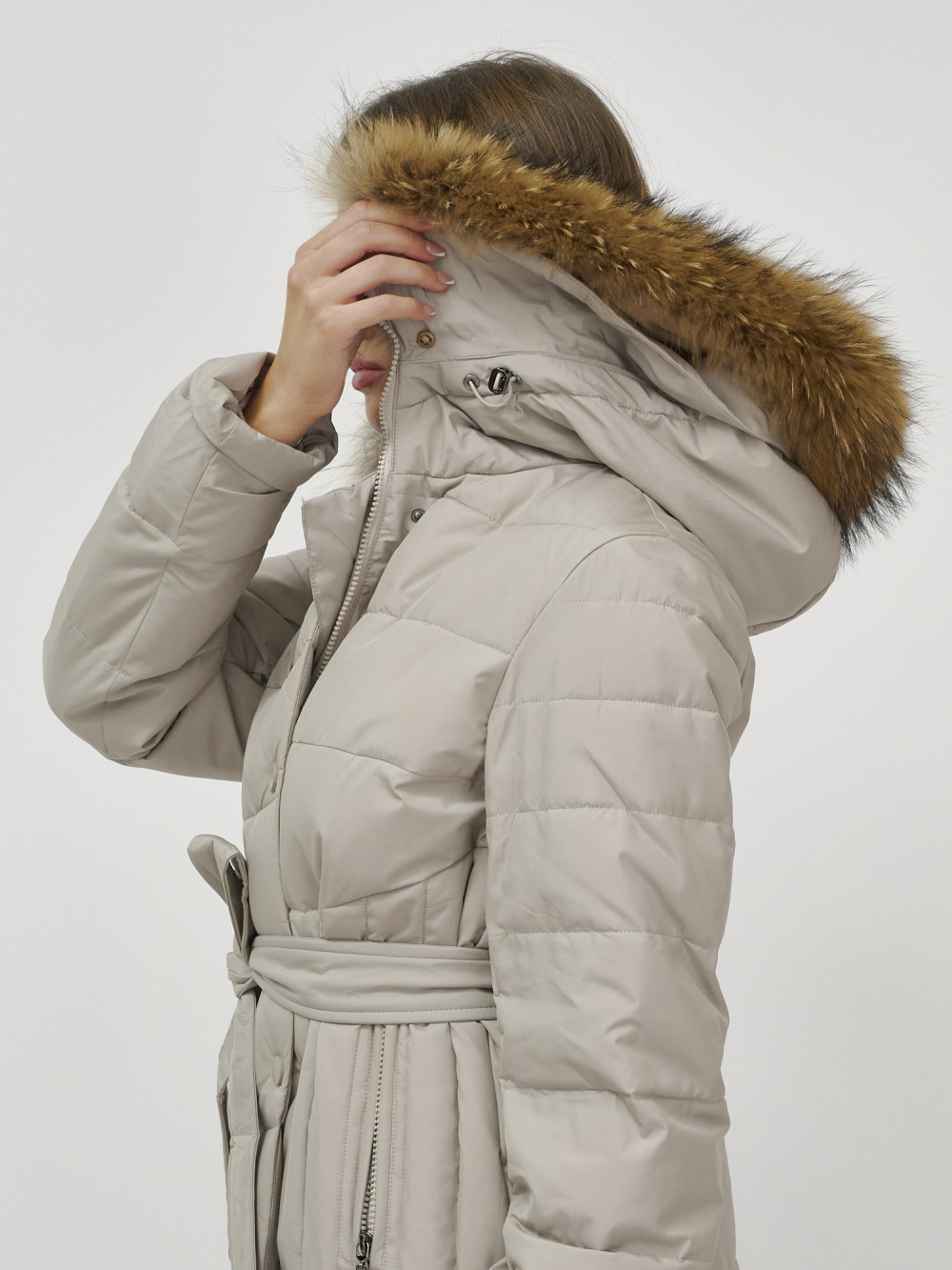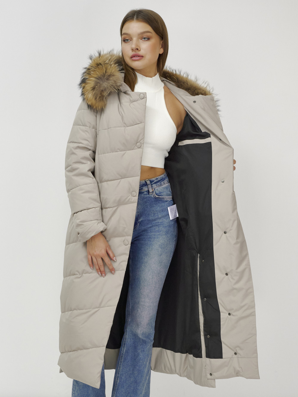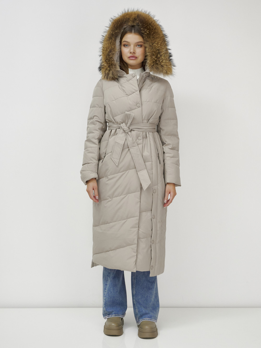 Пальто зимнее женское с мехом енот премиум класса бежевого цвета 3335B