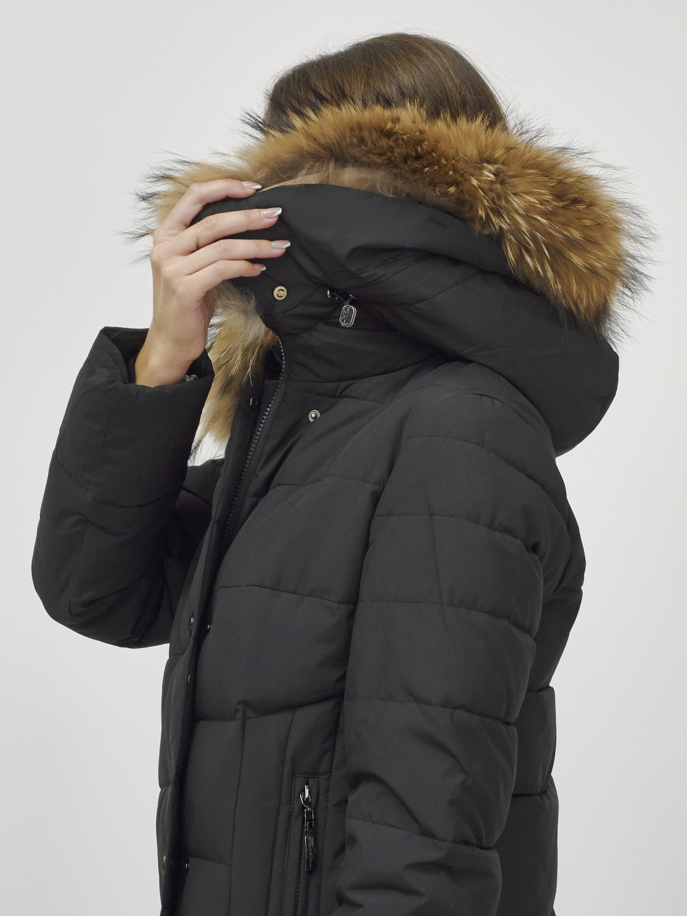 Пальто зимнее женское с мехом енот премиум класса черного цвета 3335Ch — HaiLuoZi