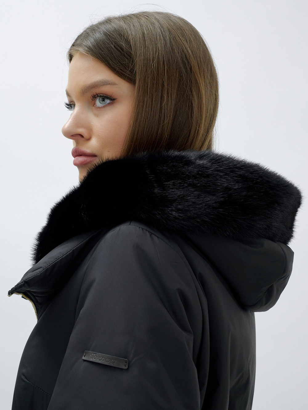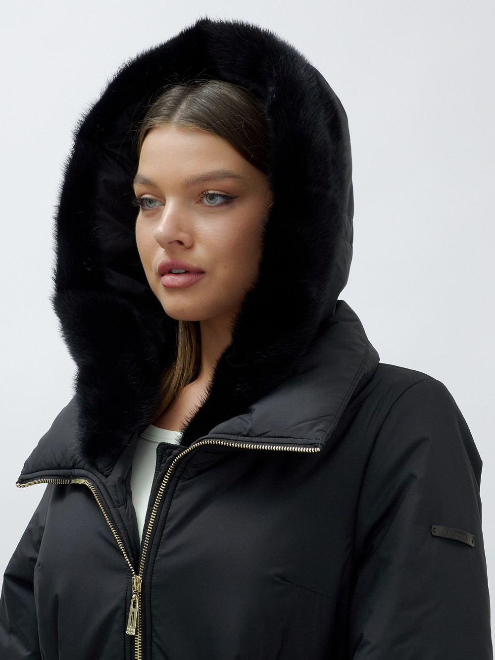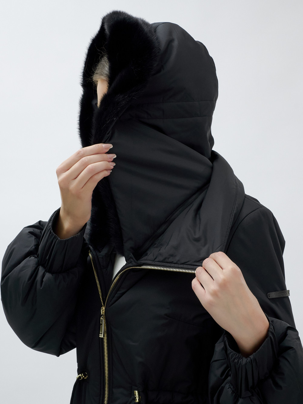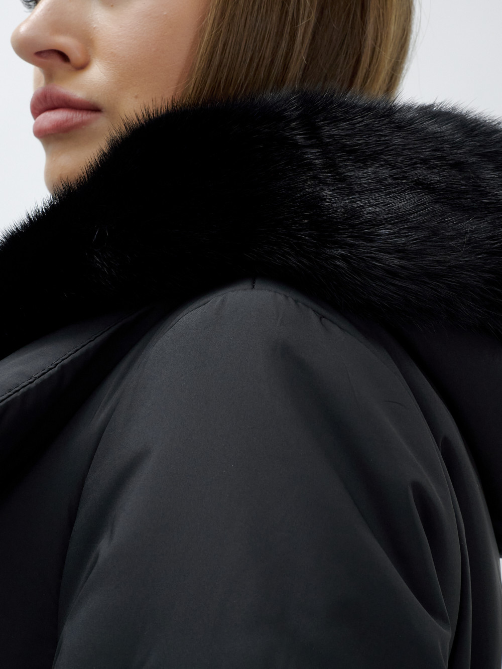 — Съемный капюшон на молнии: Практичное решение для изменения образа и защиты от непогоды. Капюшон украшен несъемным натуральным мехом норки, добавляя нотку роскоши.