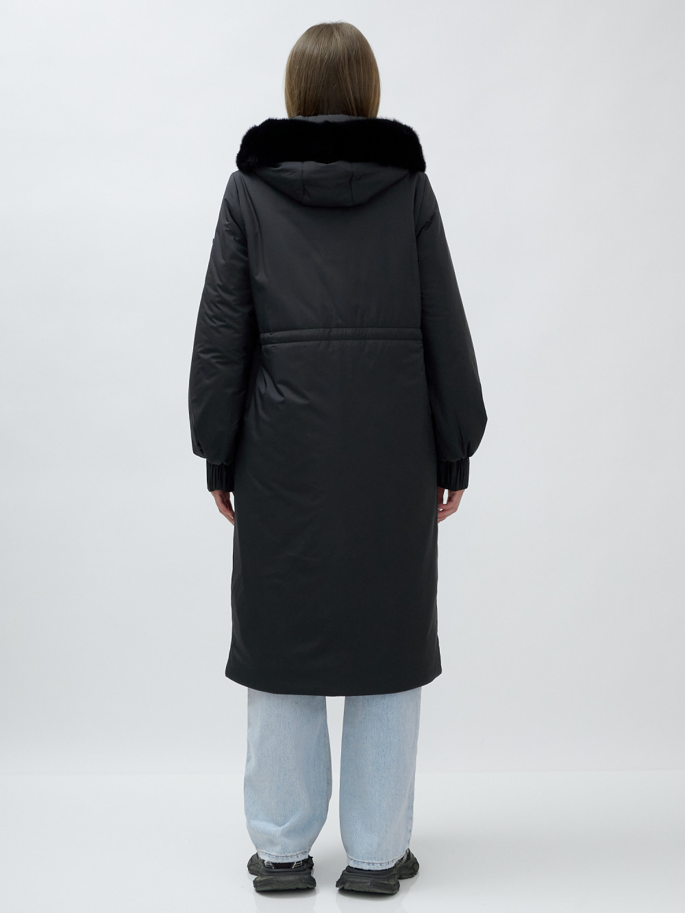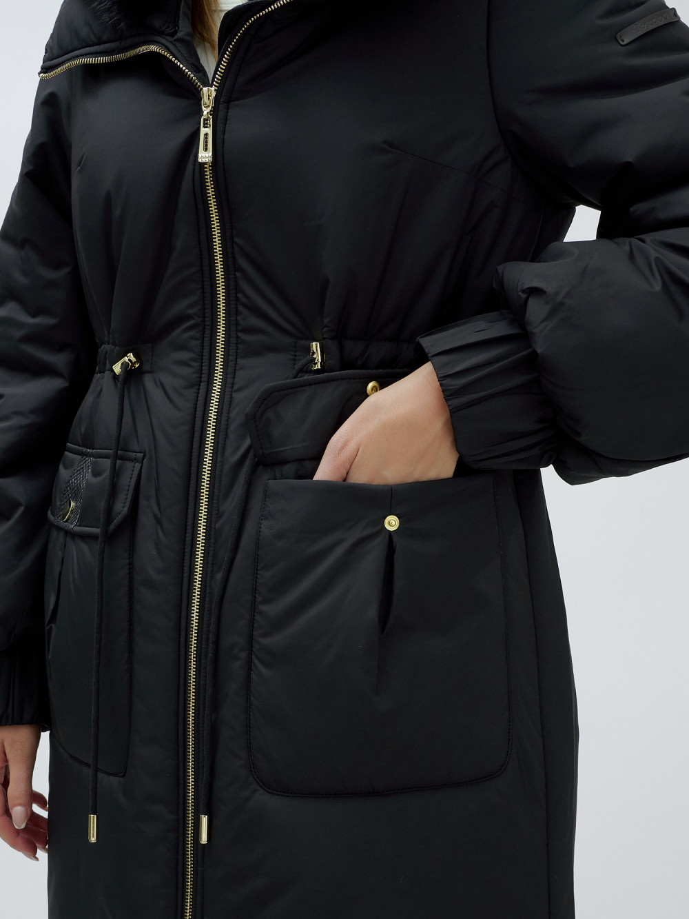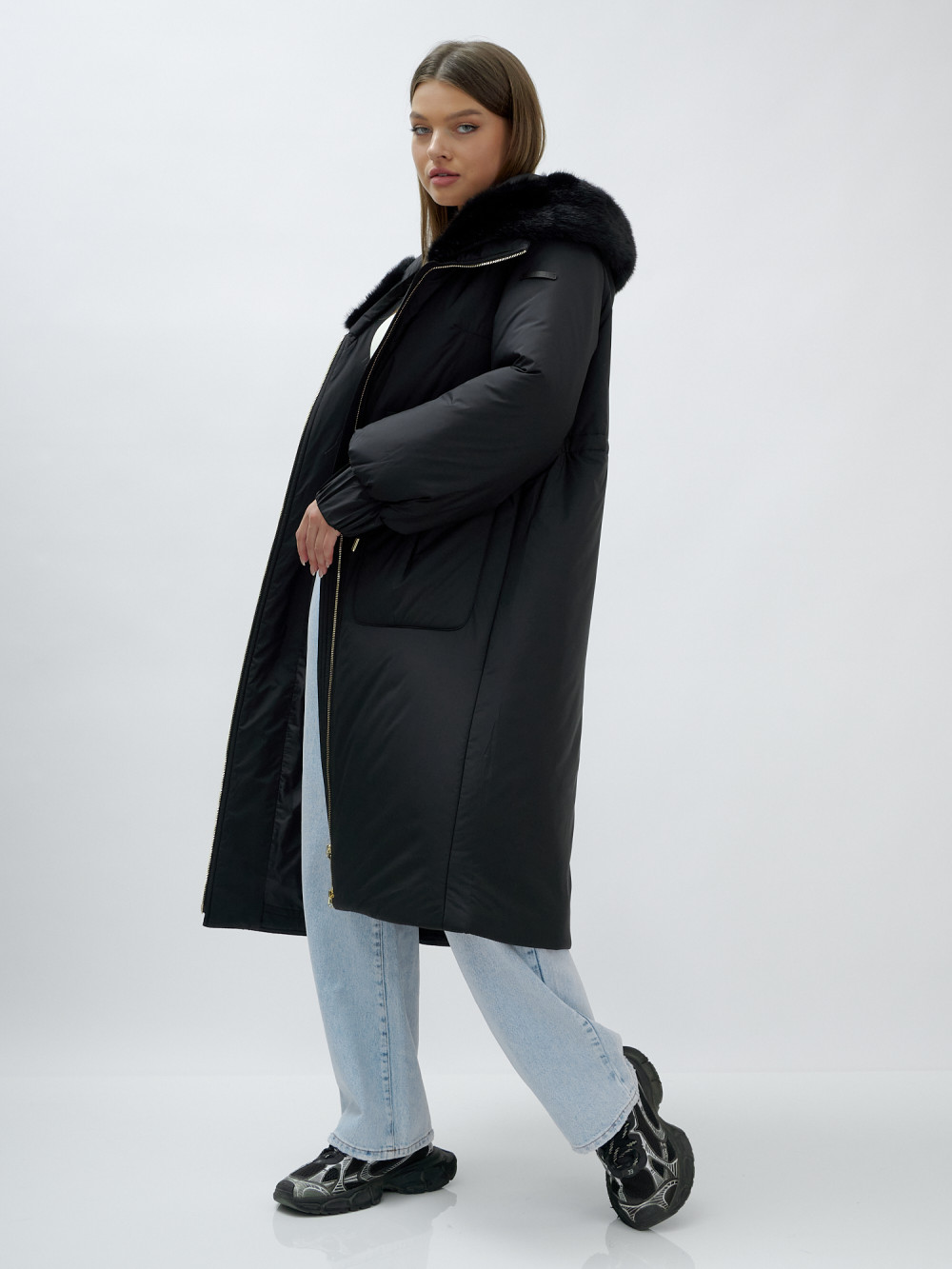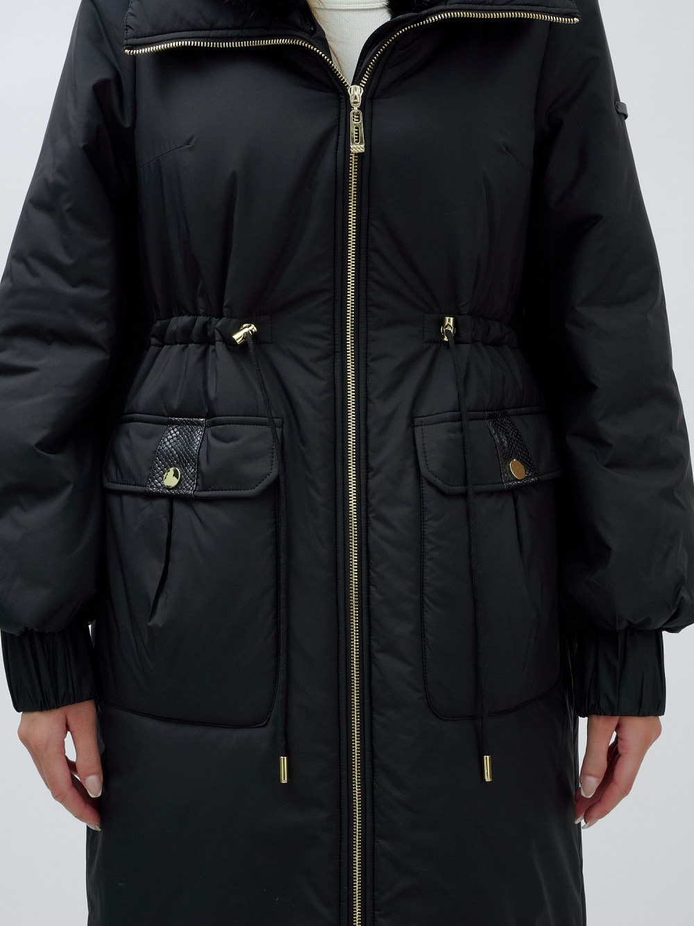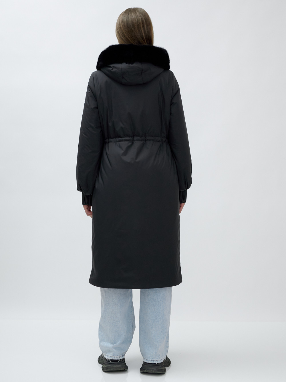 — Съемный капюшон на молнии: Практичное решение для изменения образа и защиты от непогоды. Капюшон украшен несъемным натуральным мехом норки, добавляя нотку роскоши.