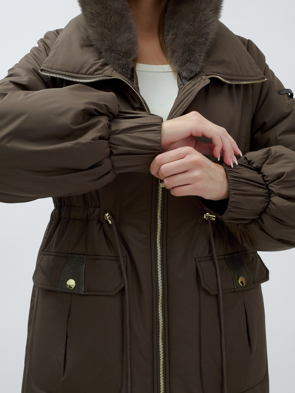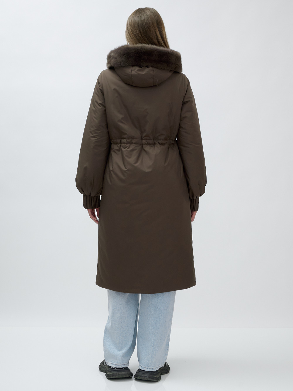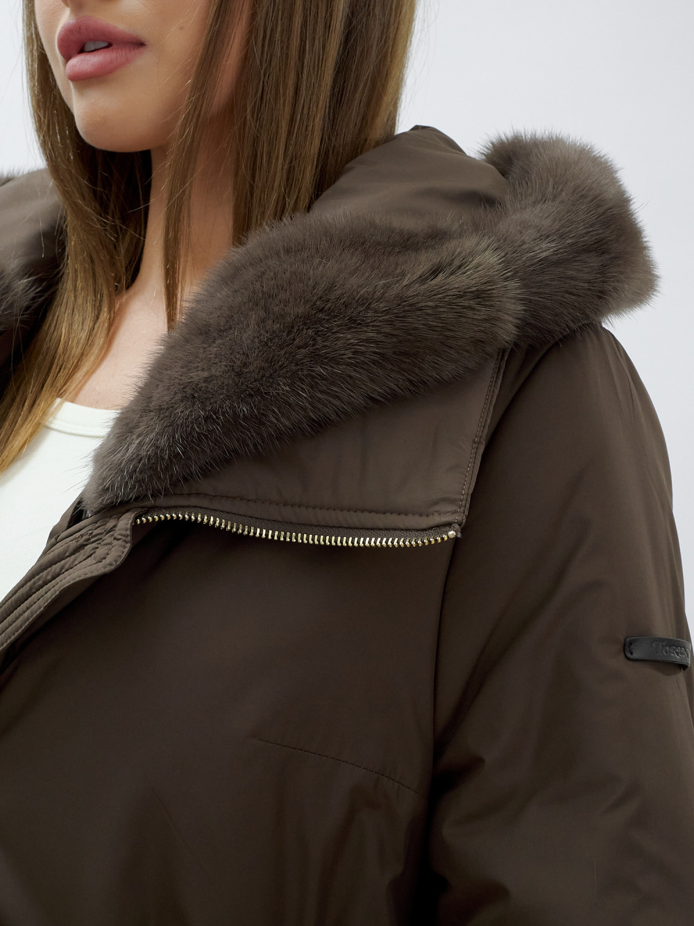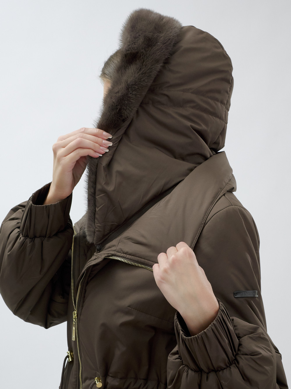 — Съемный капюшон на молнии: Практичное решение для изменения образа и защиты от непогоды. Капюшон украшен несъемным натуральным мехом норки, добавляя нотку роскоши.