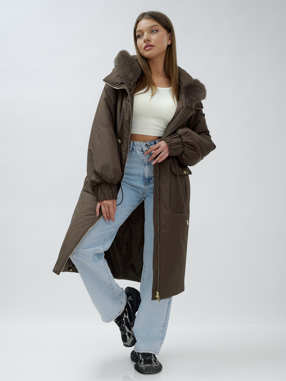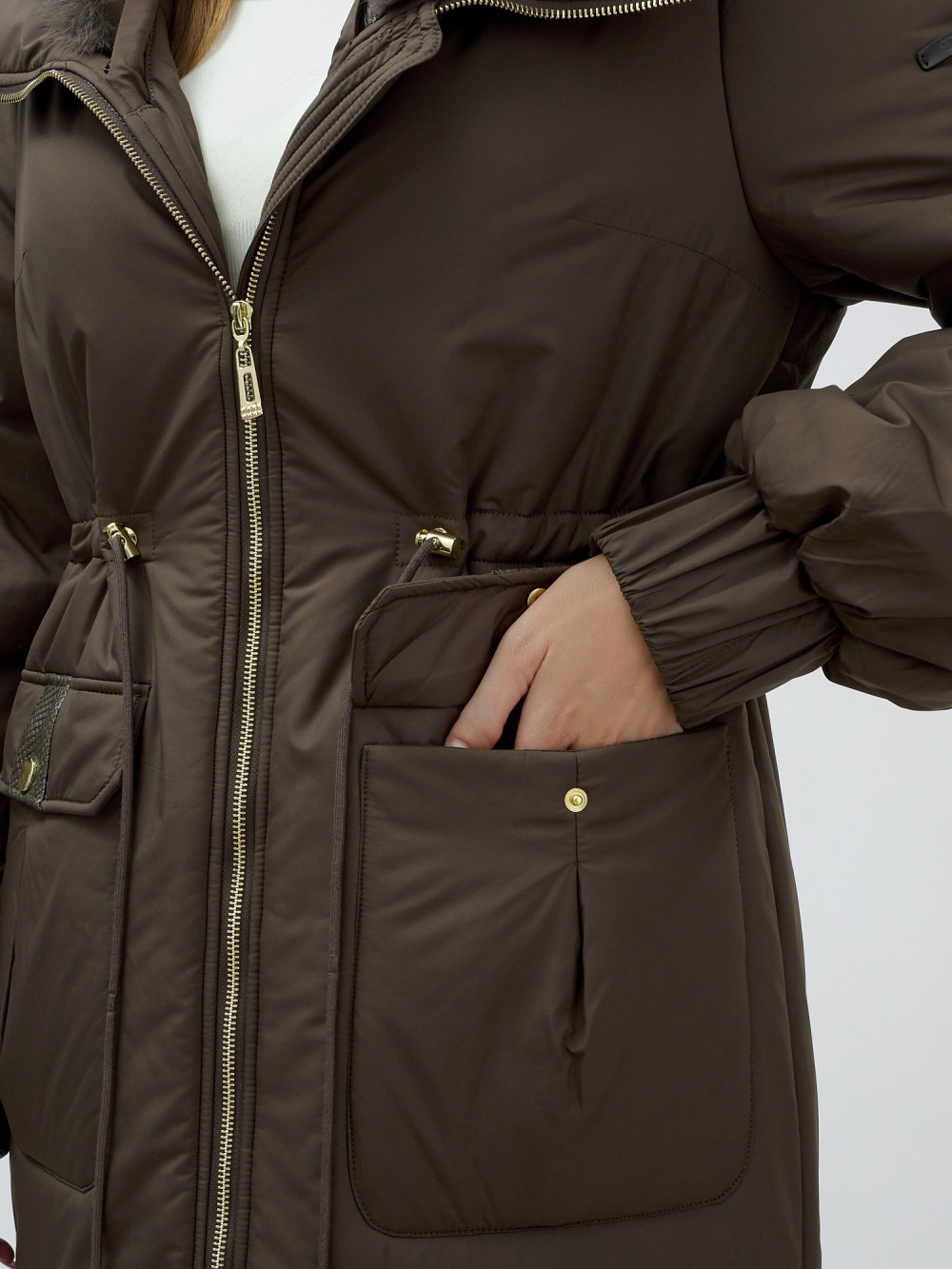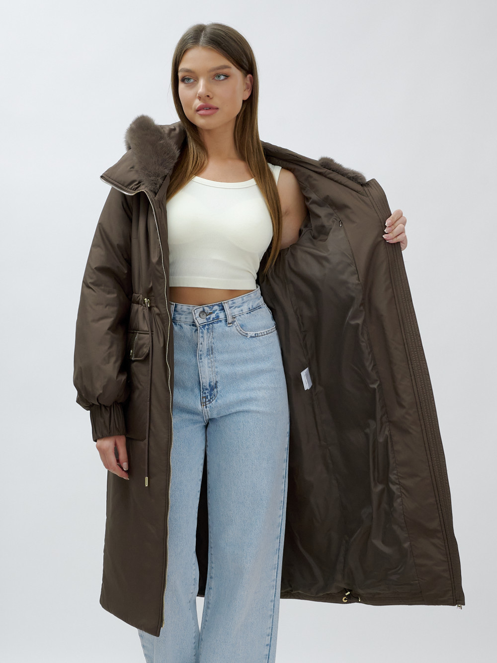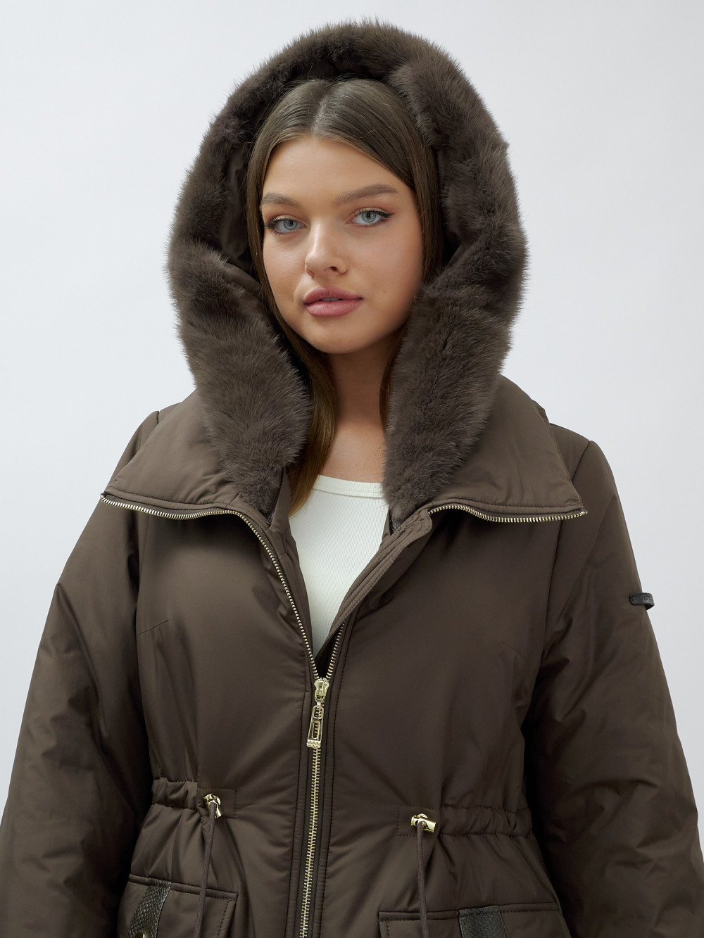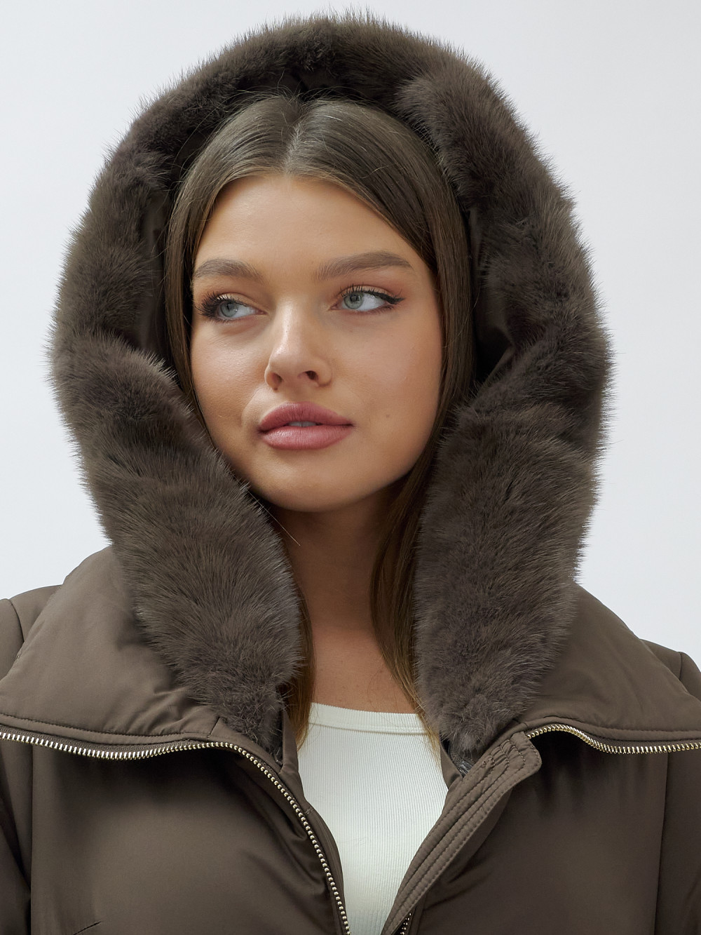 Пальто зимнее женское стильное с норкой люкс класса коричневого цвета 8628K